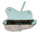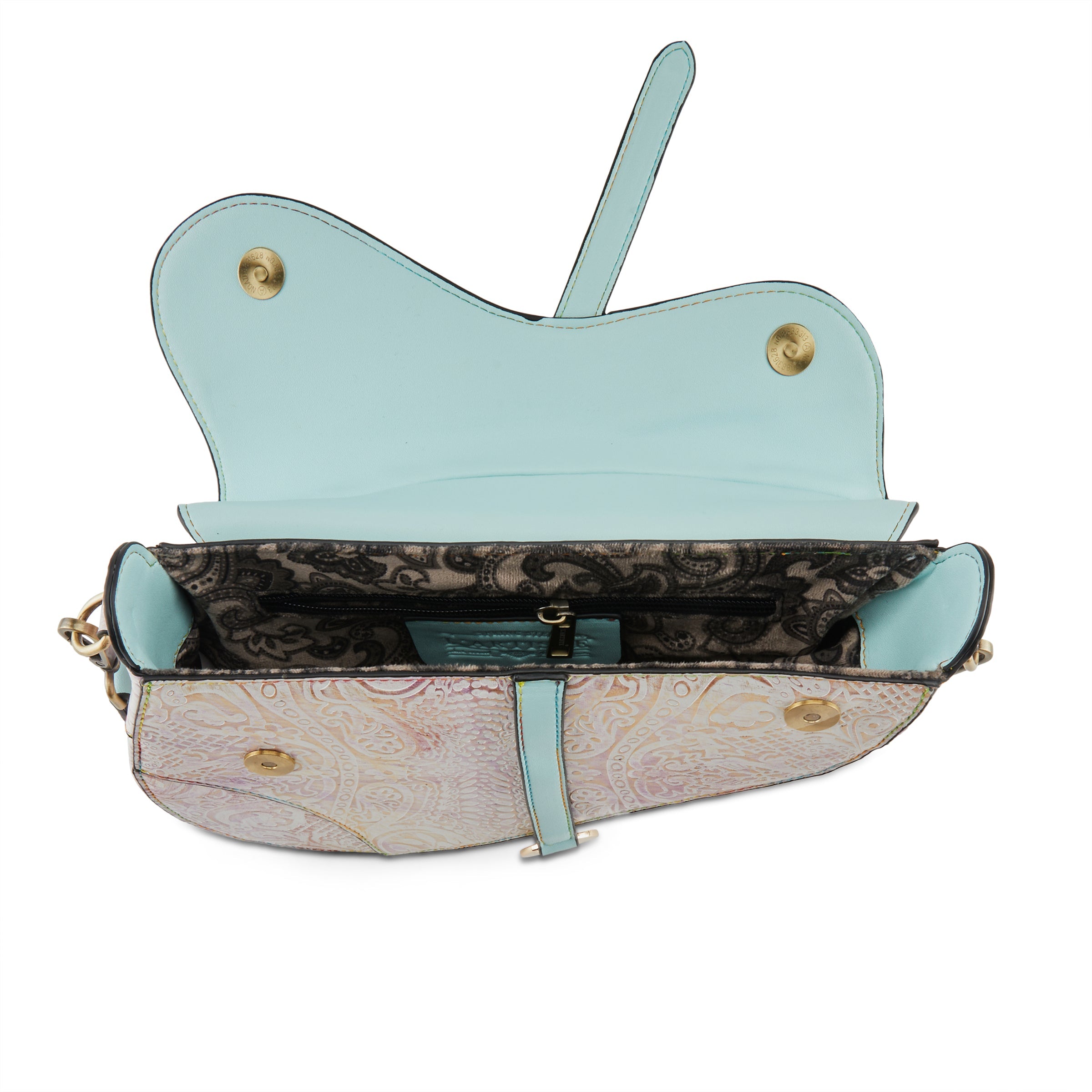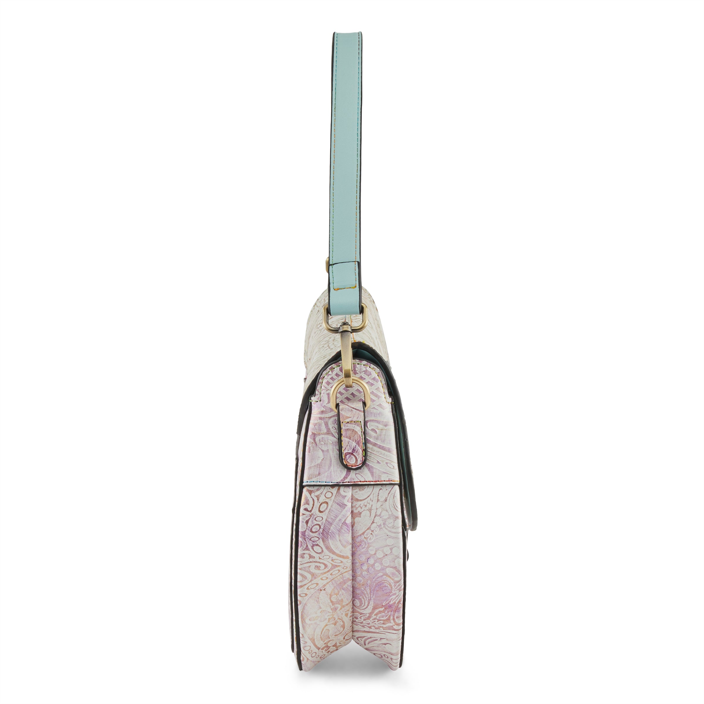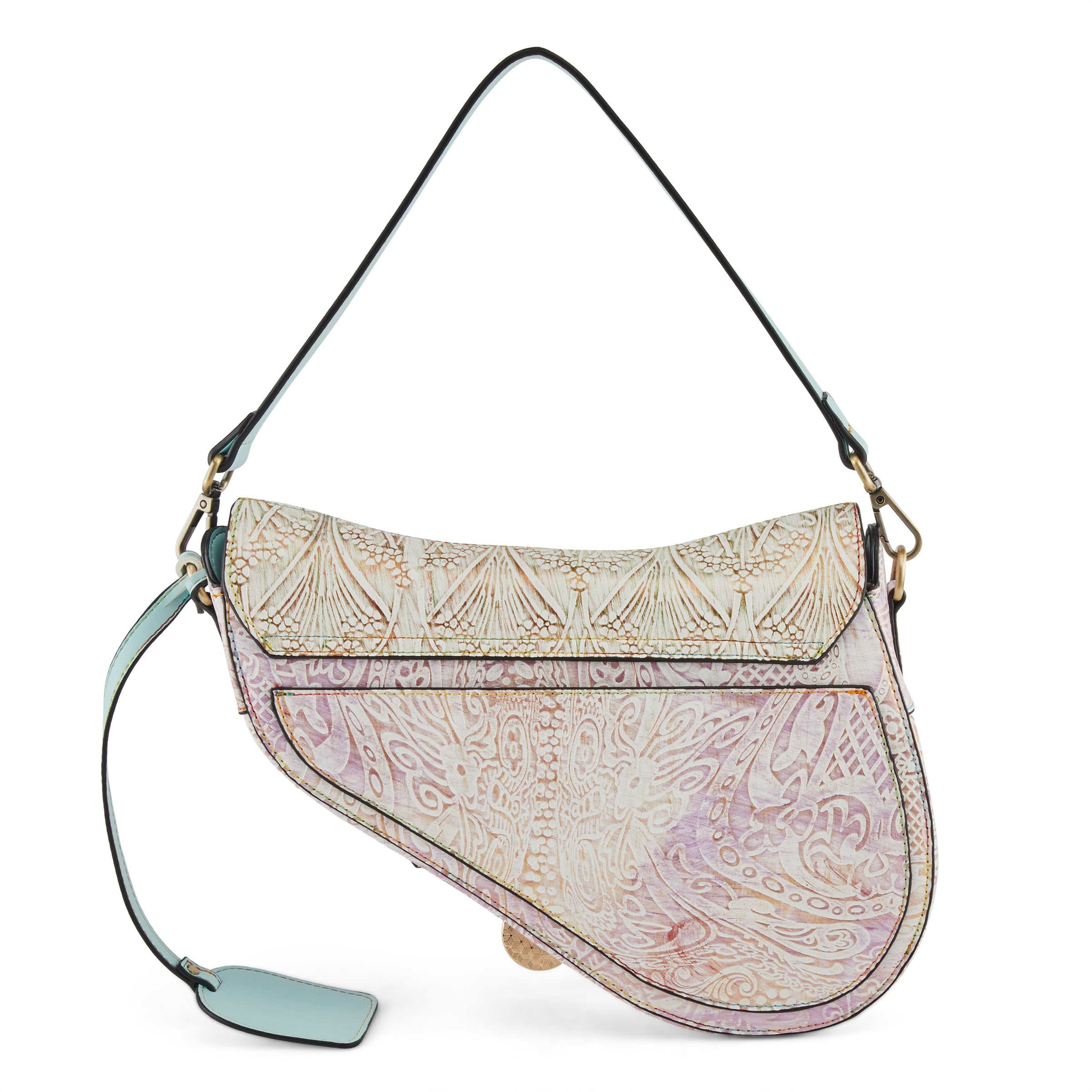 Softly contrasted carved art nouveau designs with touches of golden tone metallics, pinks, lilacs, greens, and ivories- is sure to make this asymmetrical English saddle design bag your go-to favorite of the season. And when not wearing her to all your favorite places, you just may decide to keep her on display for her beauty alone.