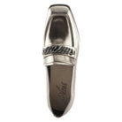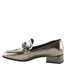 Contemporary squared off toe leather loafer showcases a central shining pewter banded embellishment, stitched seam vamp, and a high gloss architectural modern heel.