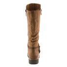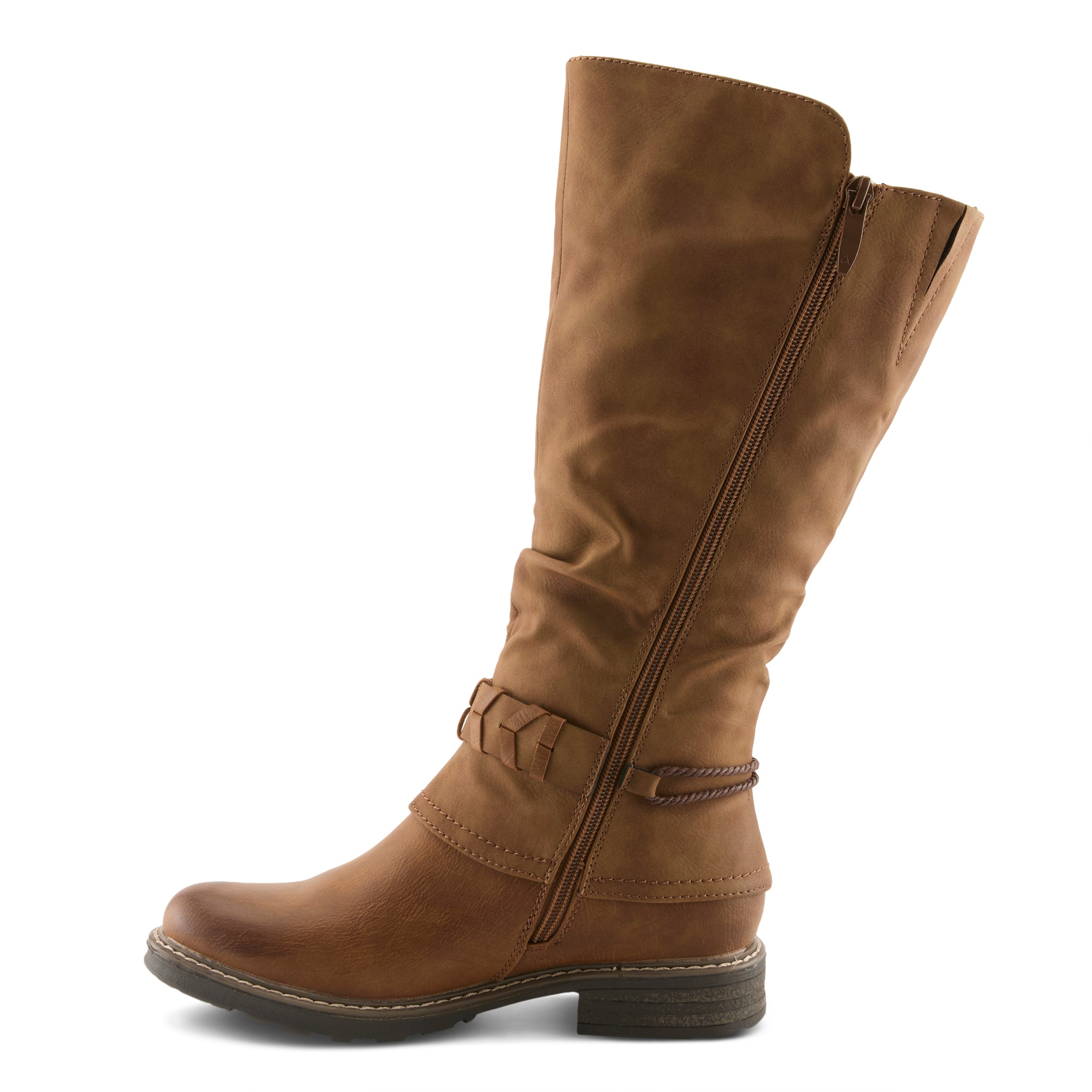 This mid-calf women's boot is not only stylish but also practical with its extended calf gusset that makes it extra stretchable. The gusset allows for a comfortable fit for women with wider calves. The outer design of the boot features a decorative buckle that adds a touch of elegance and a rope design that wraps around the boot, giving it a unique look. The boot is made of high-quality materials, providing durability and longevity. Overall, this mid-calf boot is a perfect addition to any wardrobe, offering both style and comfort.
