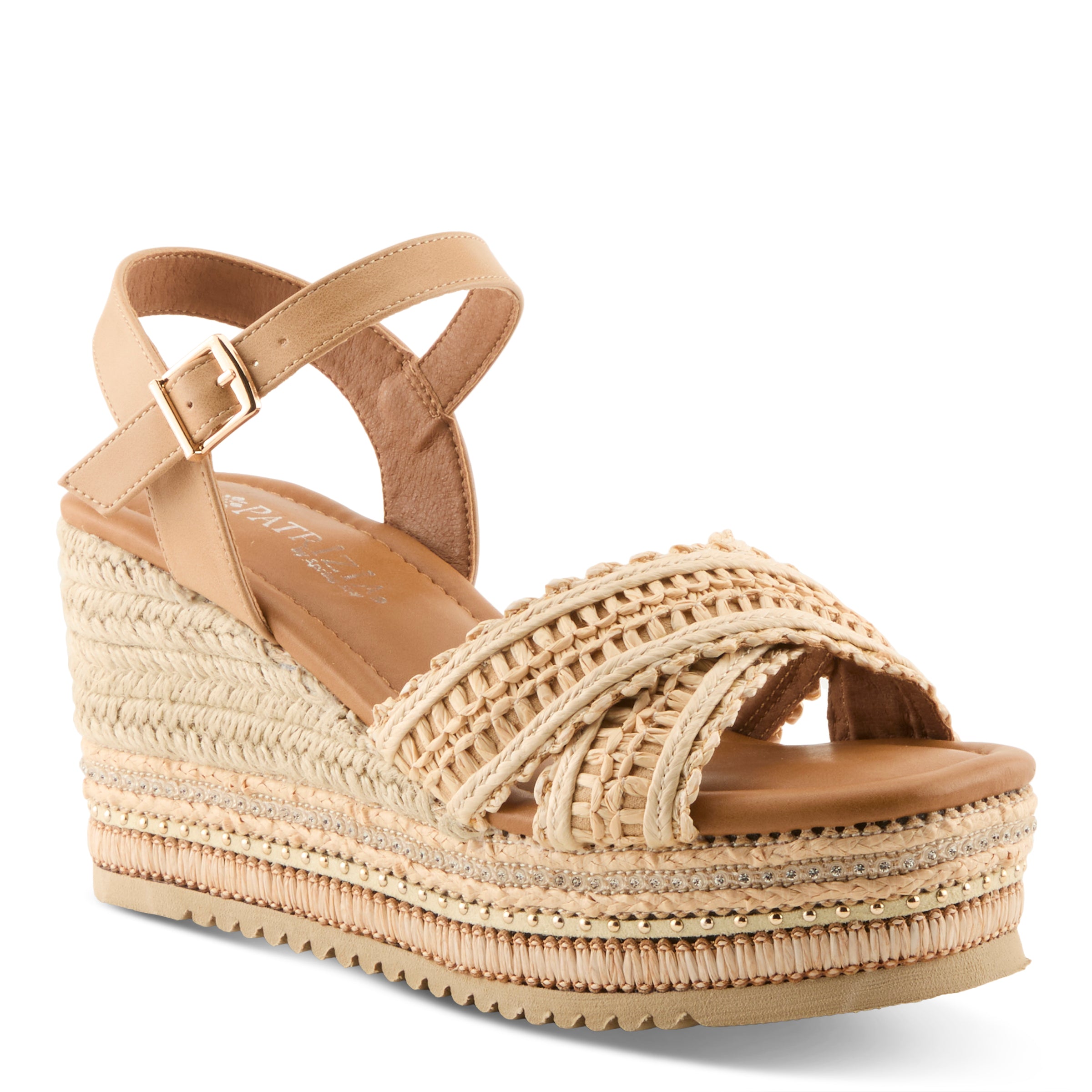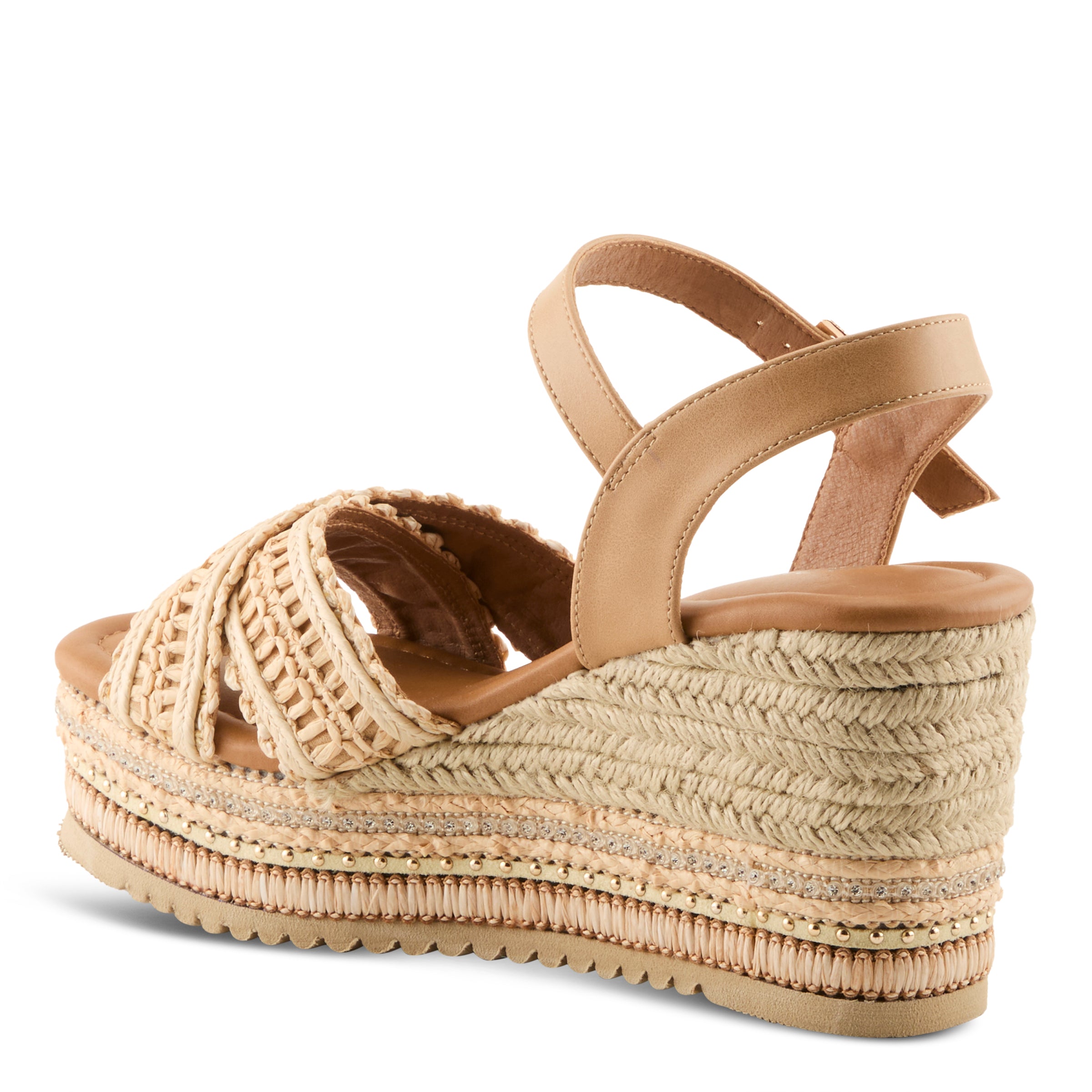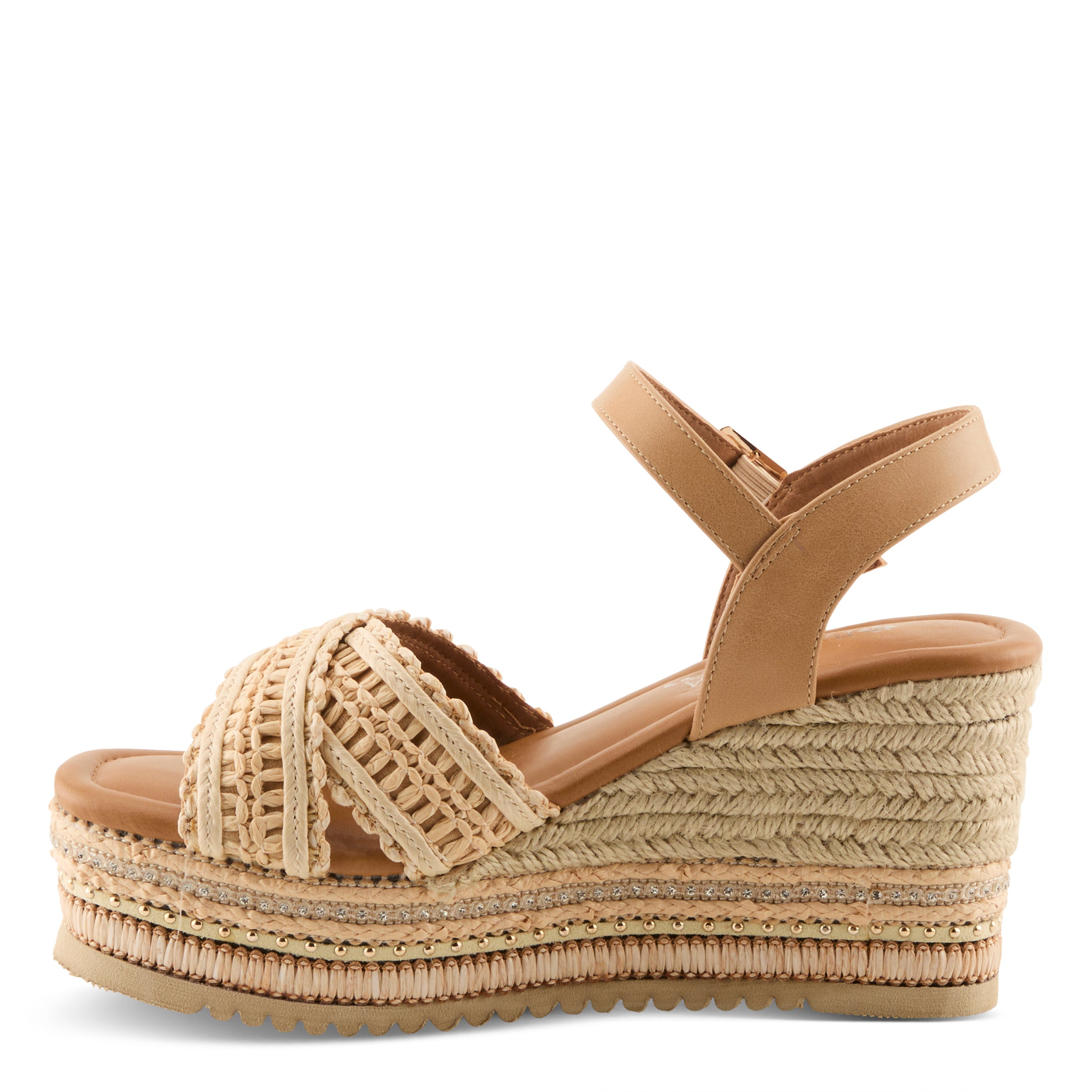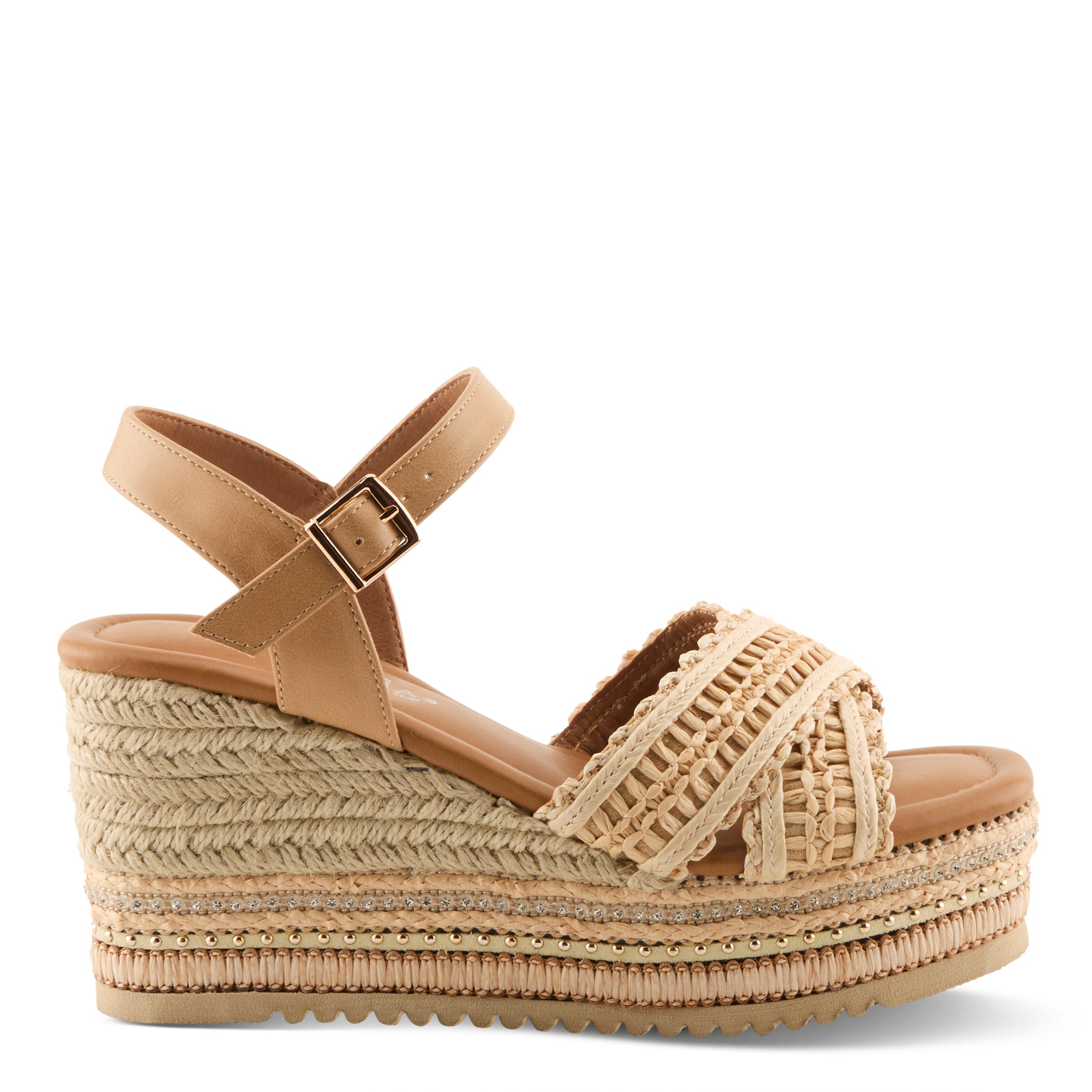 Step up your summer style with this chic raffia wedge sandal that blends natural textures with modern sophistication. Featuring woven raffia detailing across the upper and a layered wedge design, this sandal brings cool, trendy charm to any warm-weather look. The faux leather ankle strap with adjustable buckle closure provides a secure fit, while the cushioned footbed ensures you can move comfortably from day to night.