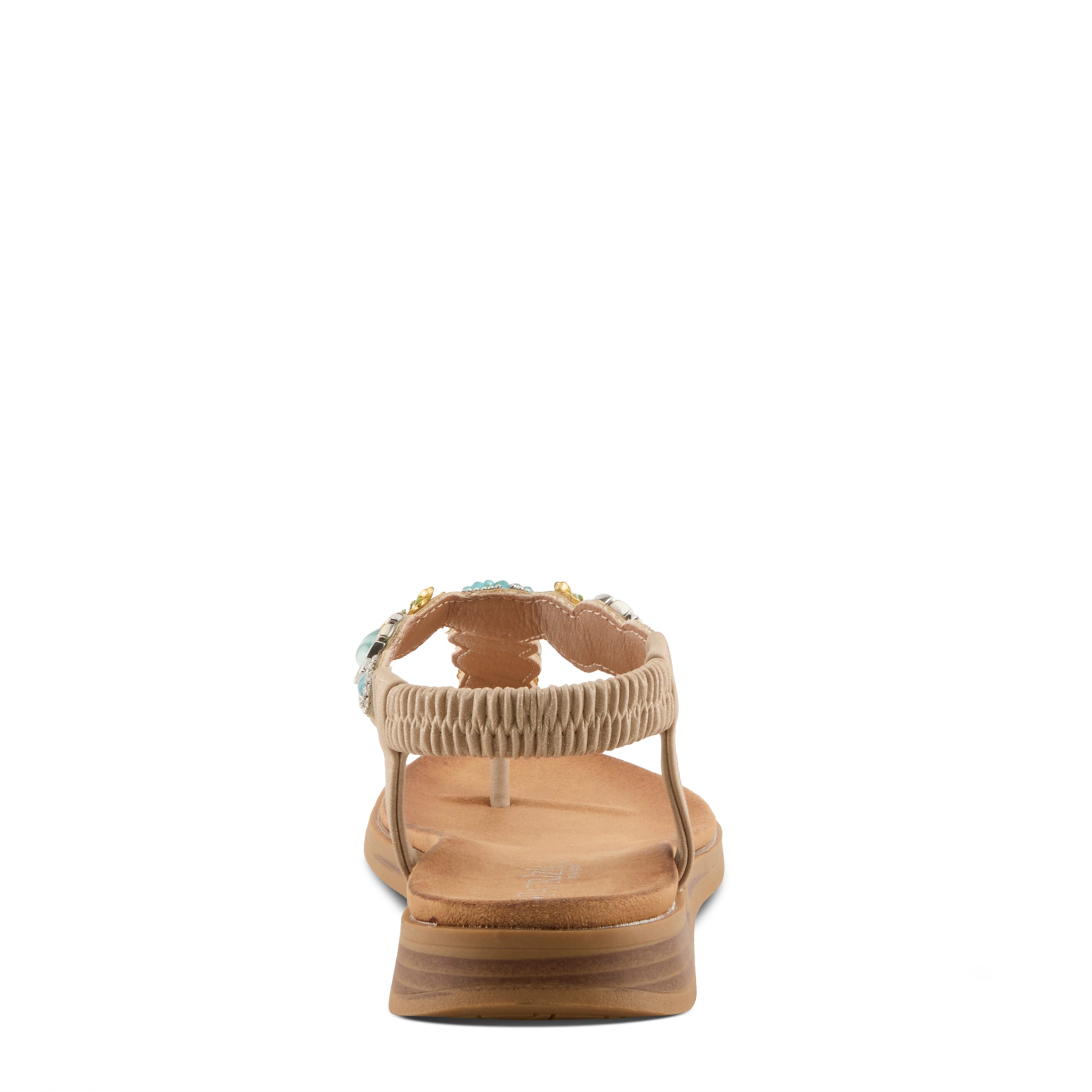 Bring a touch of boho-chic glamour to your summer style with this stunning jeweled thong sandal. Adorned with vibrant gemstone-inspired accents and delicate floral embellishments, this sandal is as cool and trendy as it is comfortable. The faux leather upper delivers a luxe look while remaining animal-friendly, and the elastic back strap makes it easy to slip on and off while ensuring a secure fit.