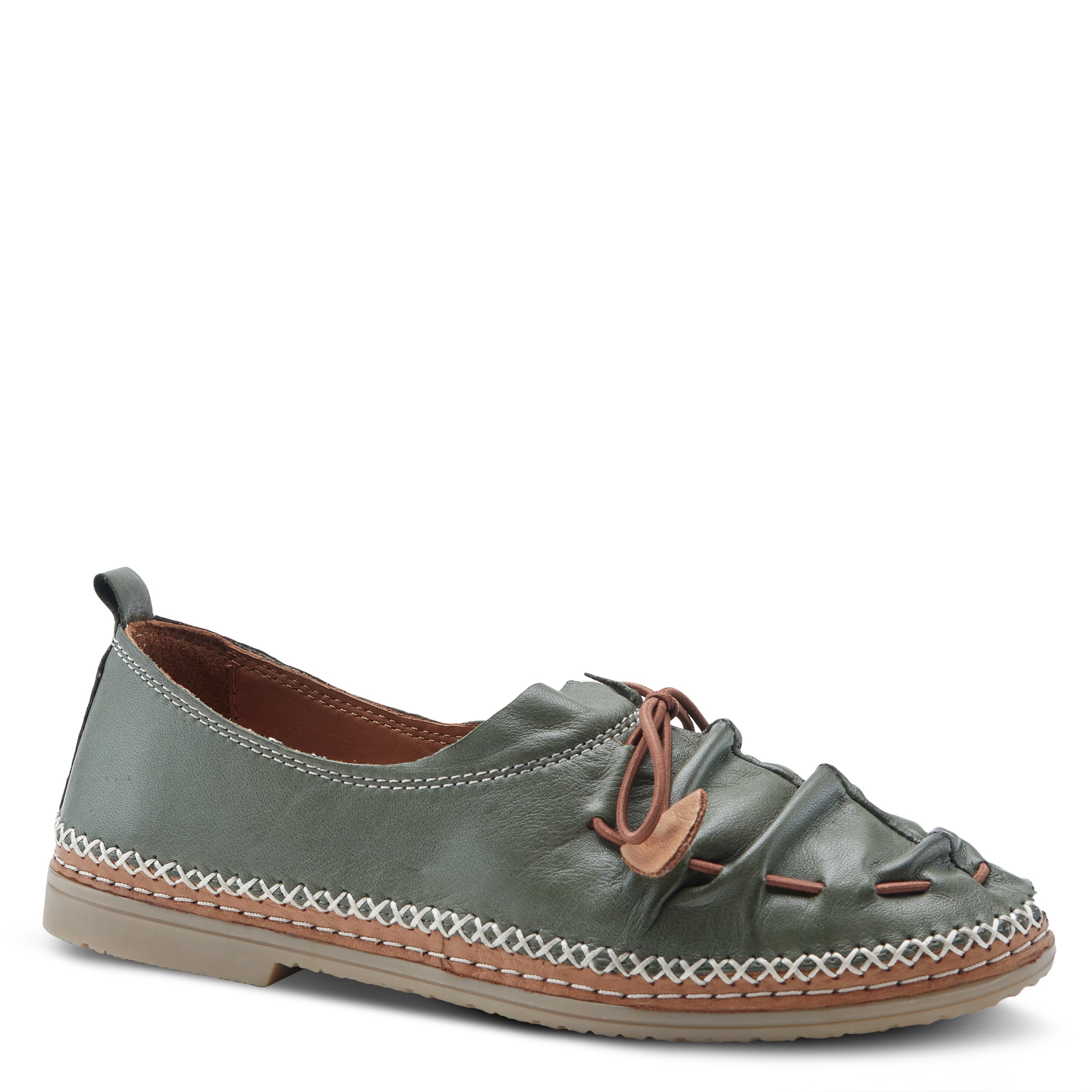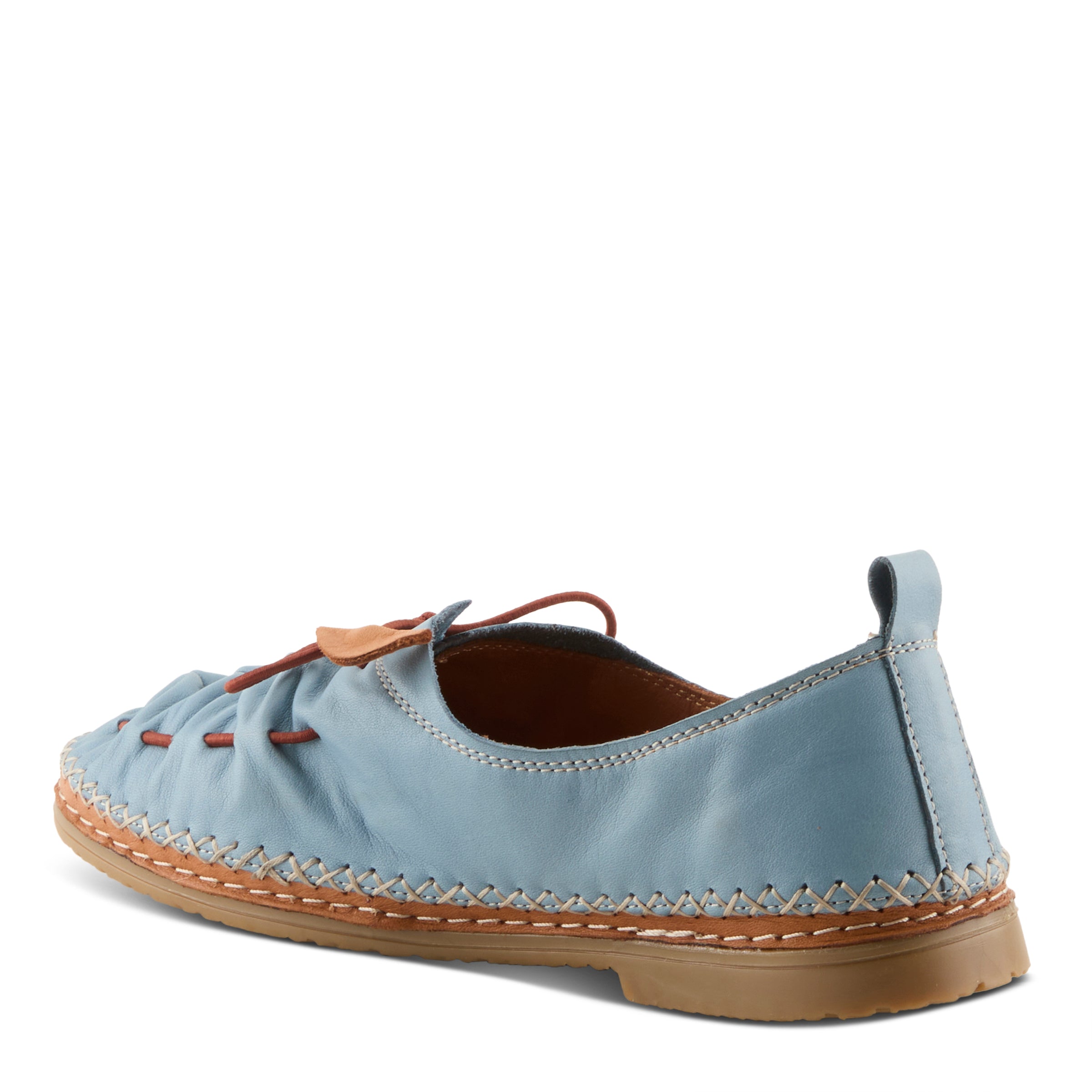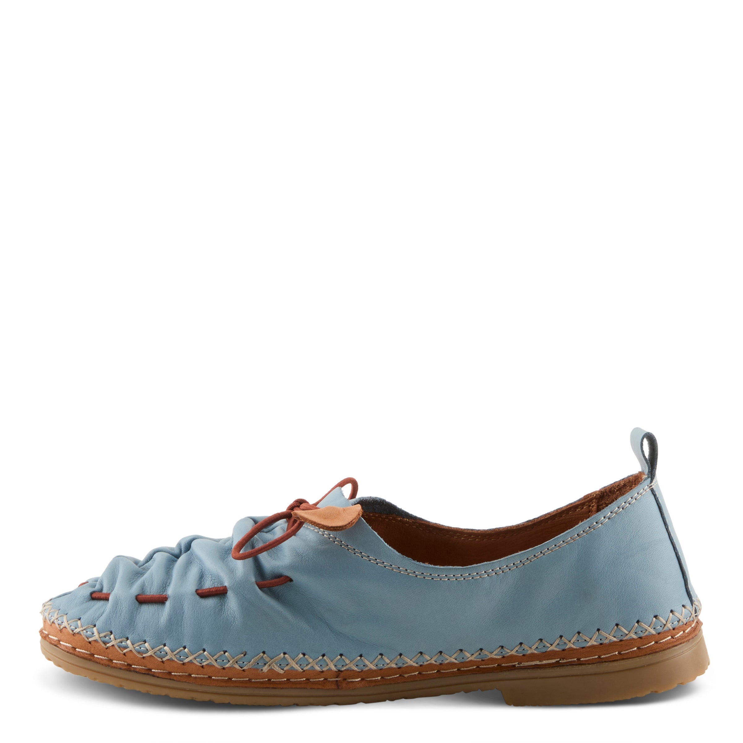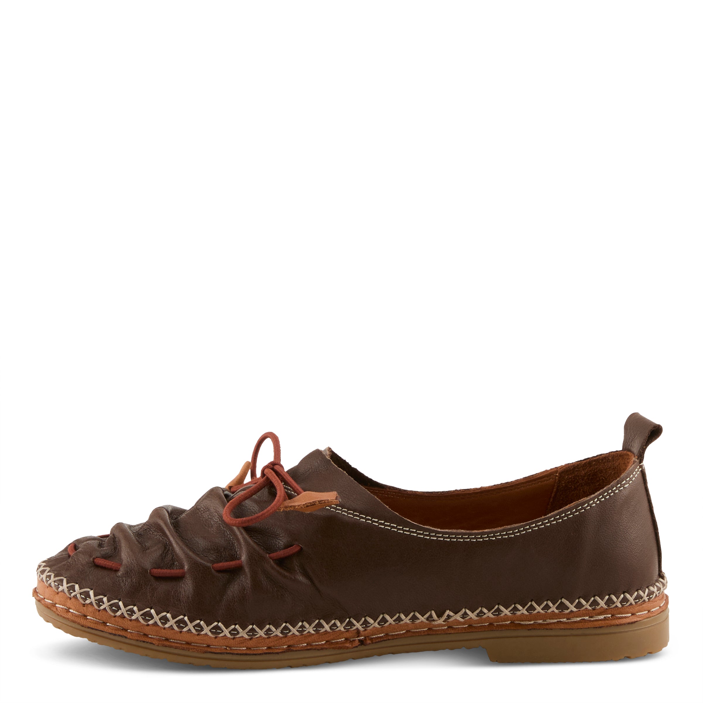 Trendy artistic slip-on shoe featuring an incorporated elastic vamp-tie and contrast whip-stitching.