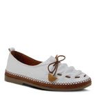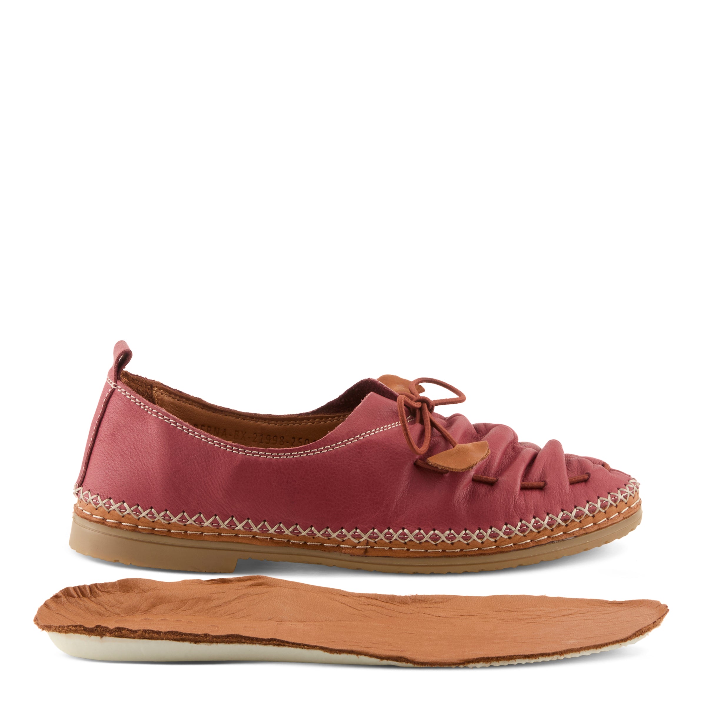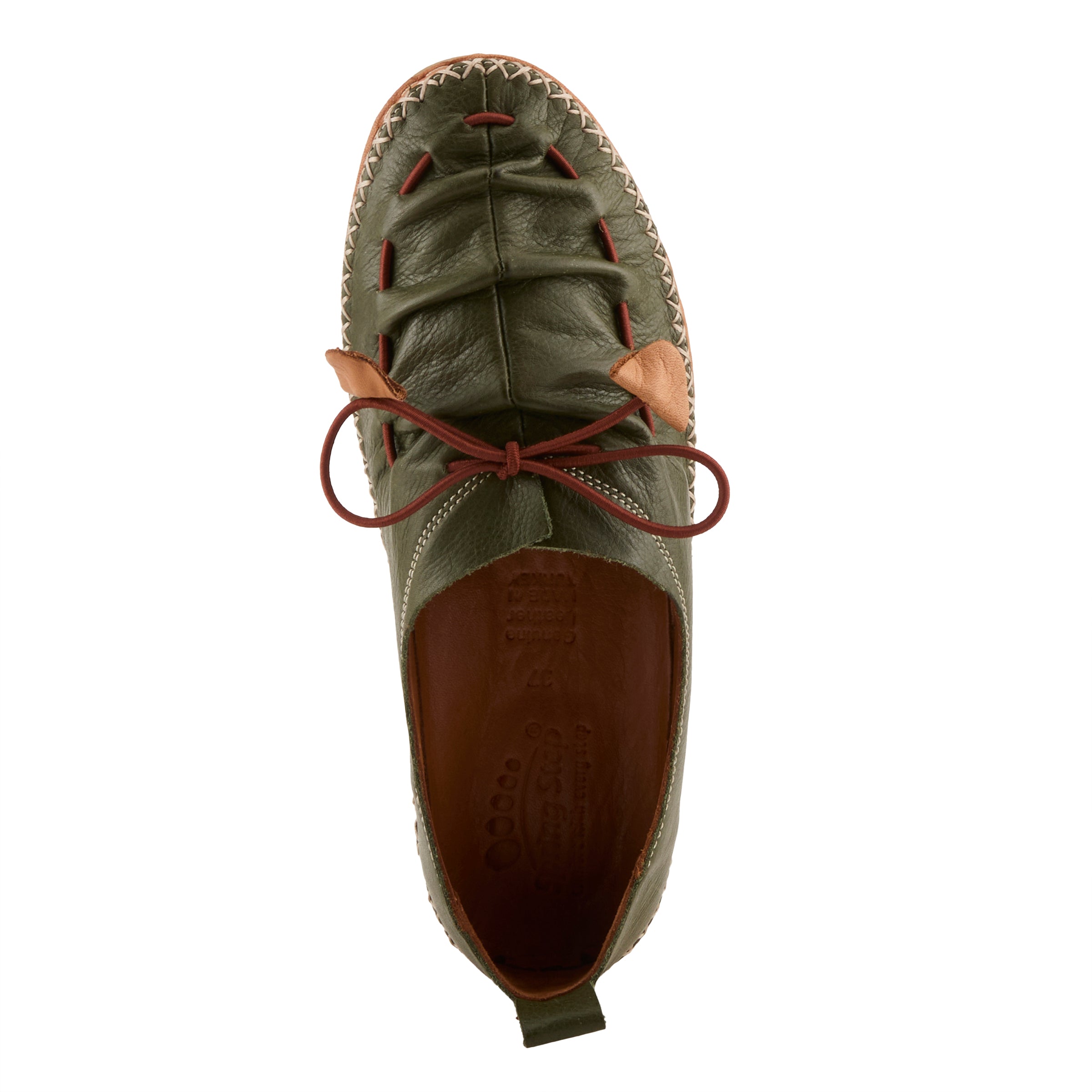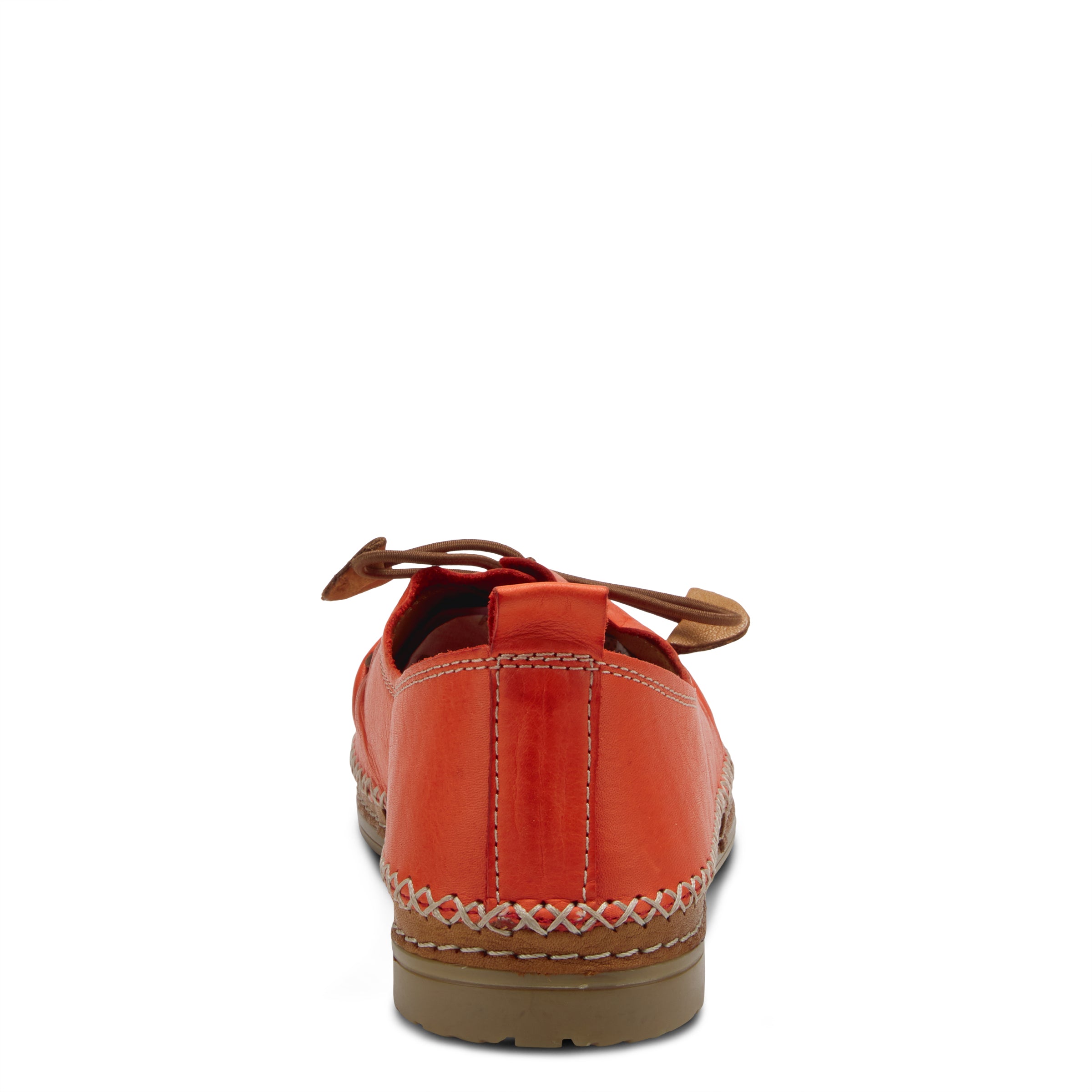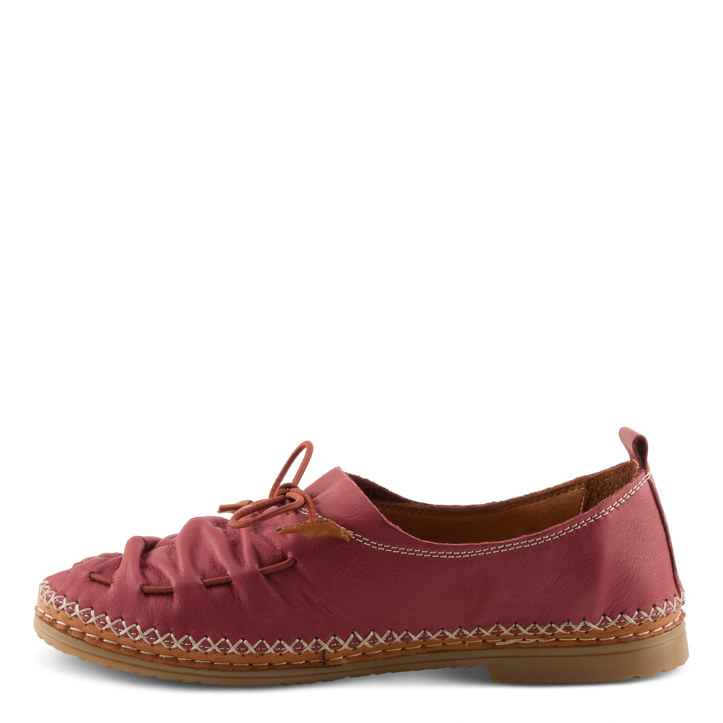 Trendy artistic slip-on shoe featuring an incorporated elastic vamp-tie and contrast whip-stitching.