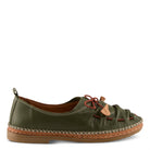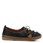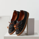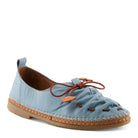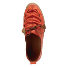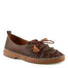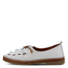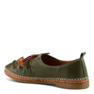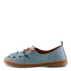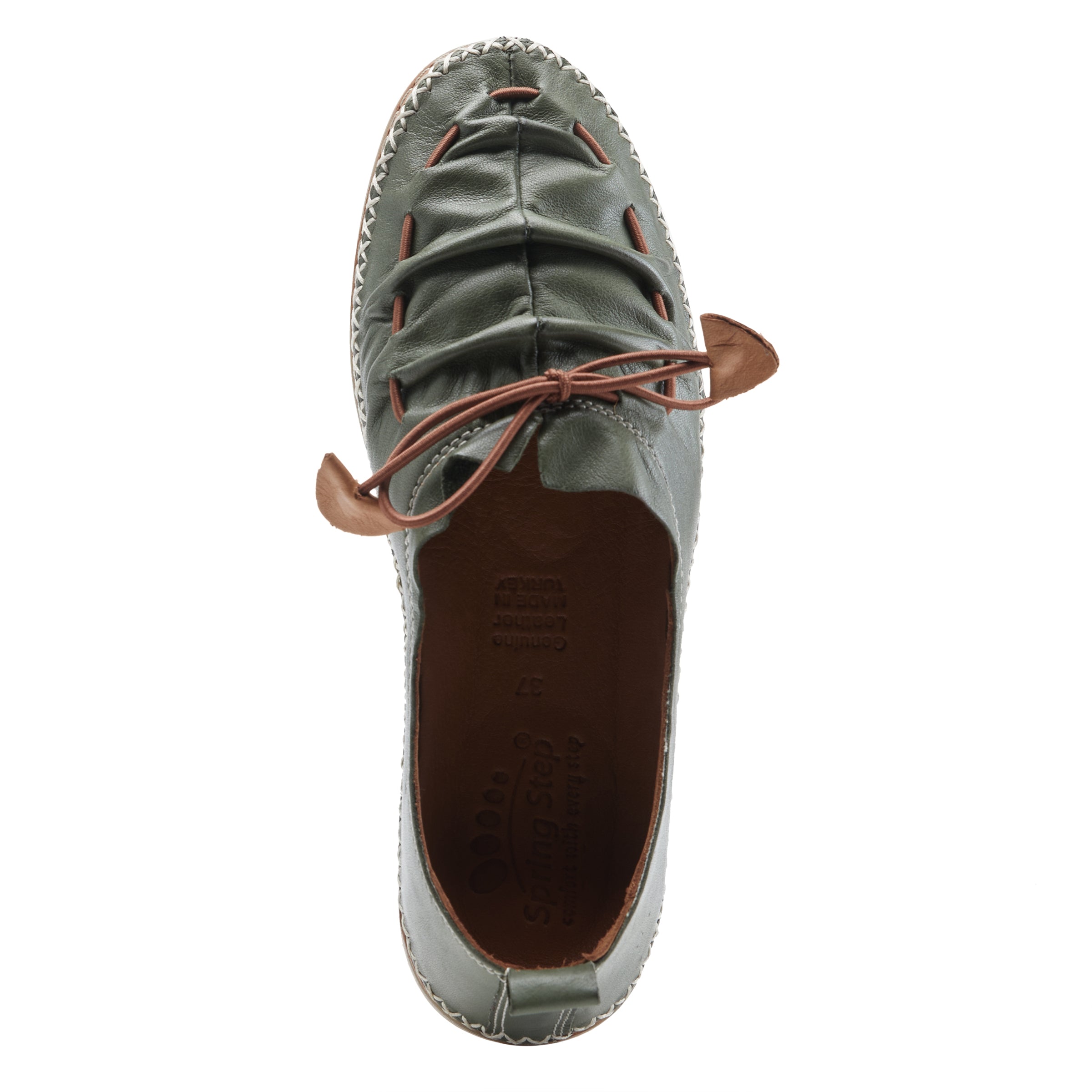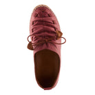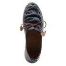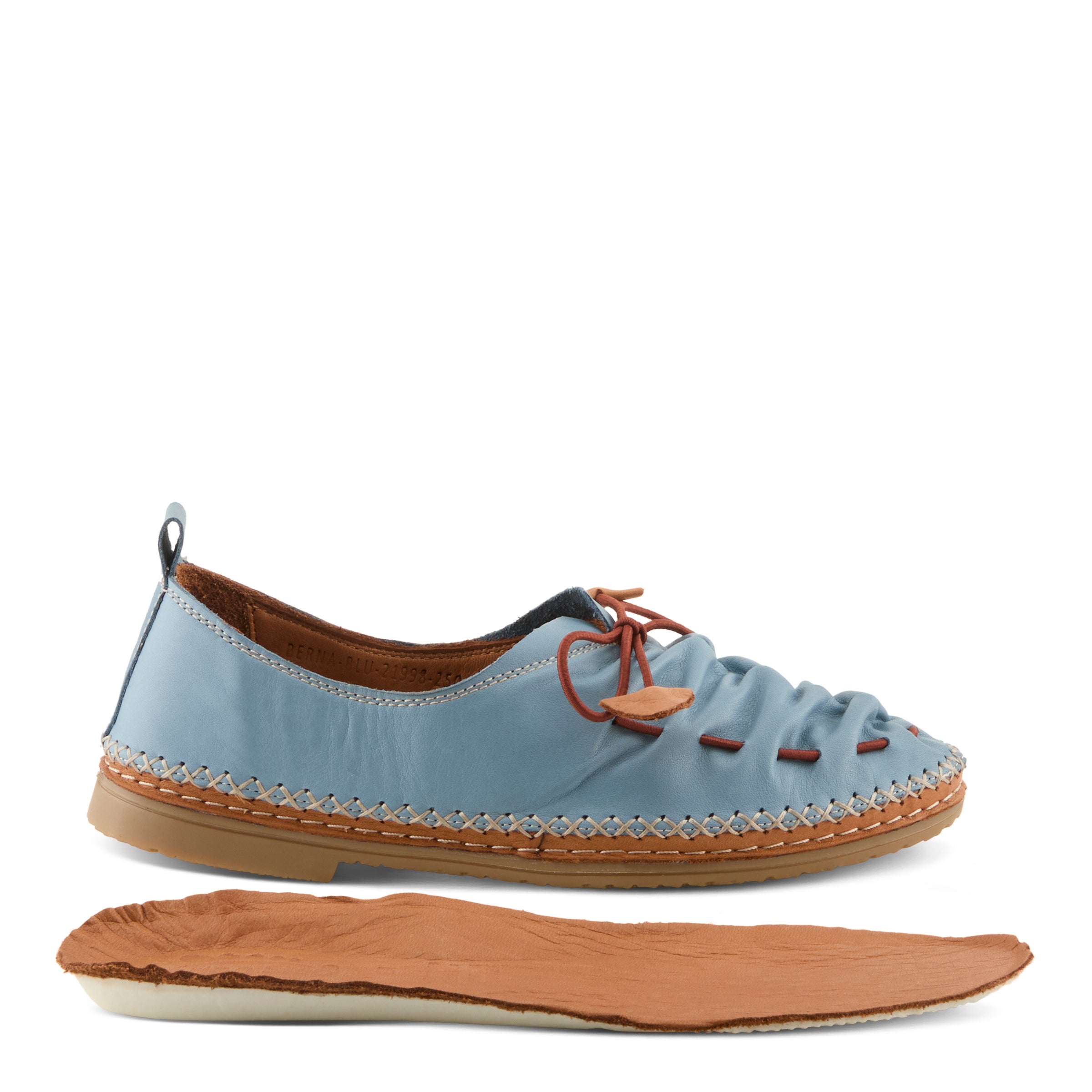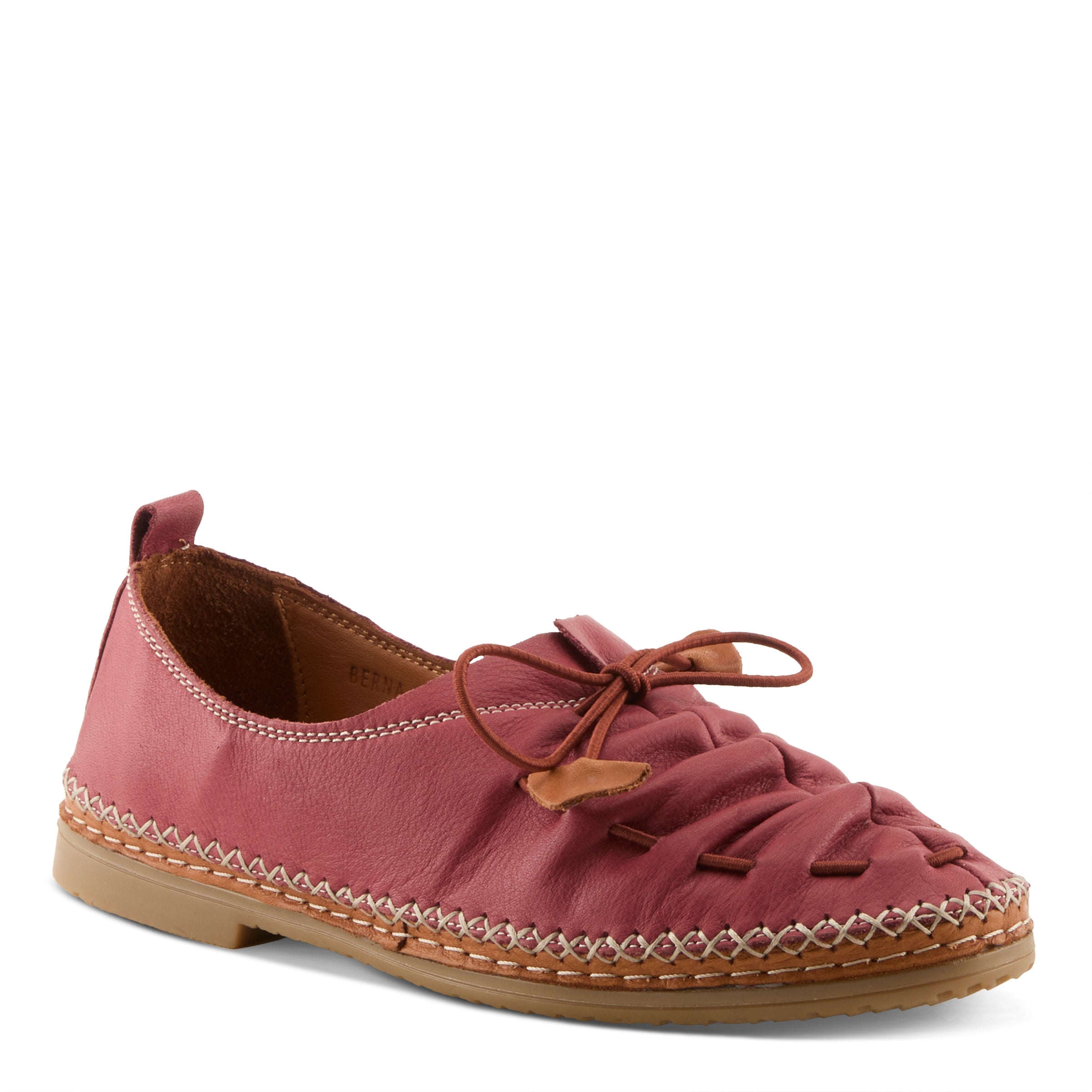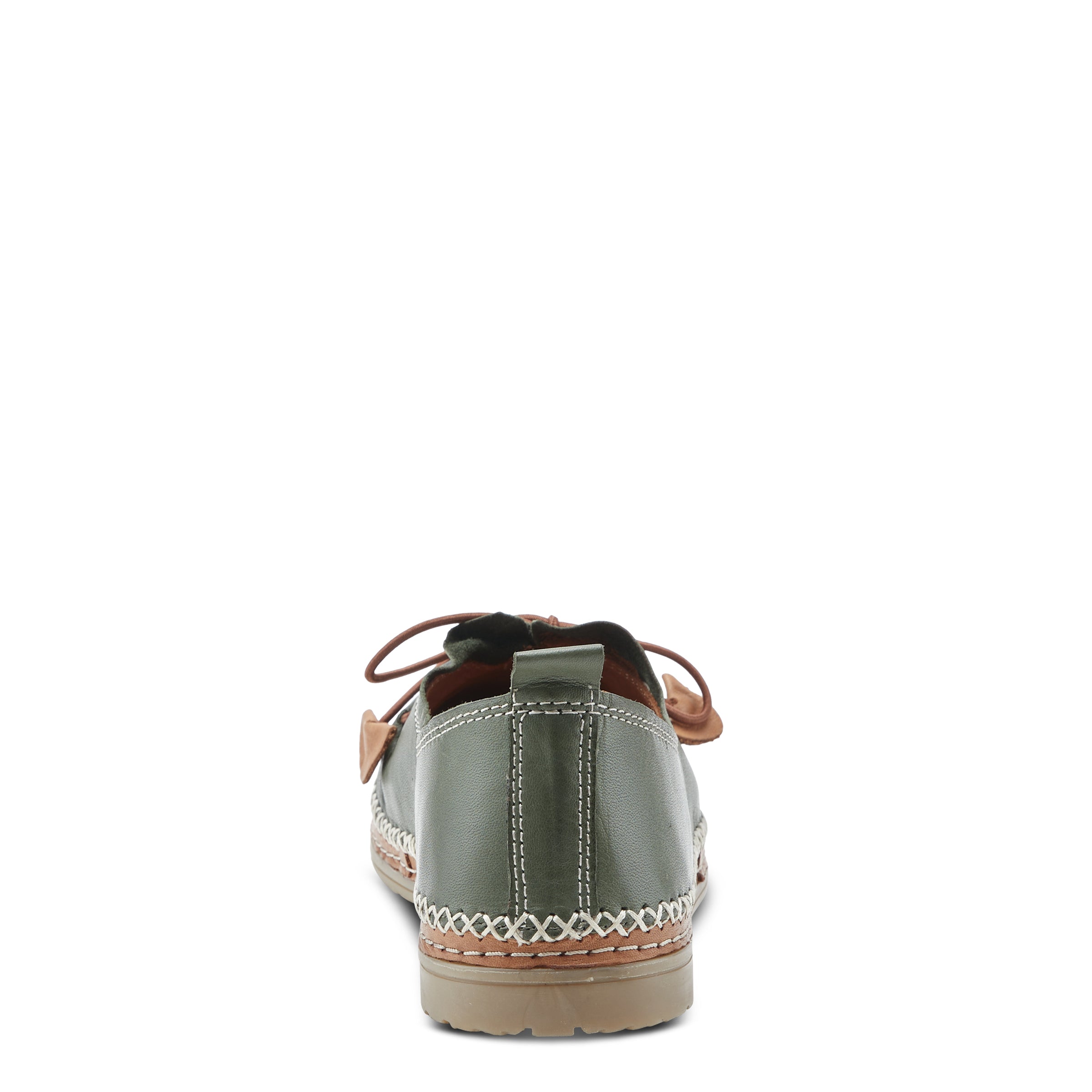 Trendy artistic slip-on shoe featuring an incorporated elastic vamp-tie and contrast whip-stitching.