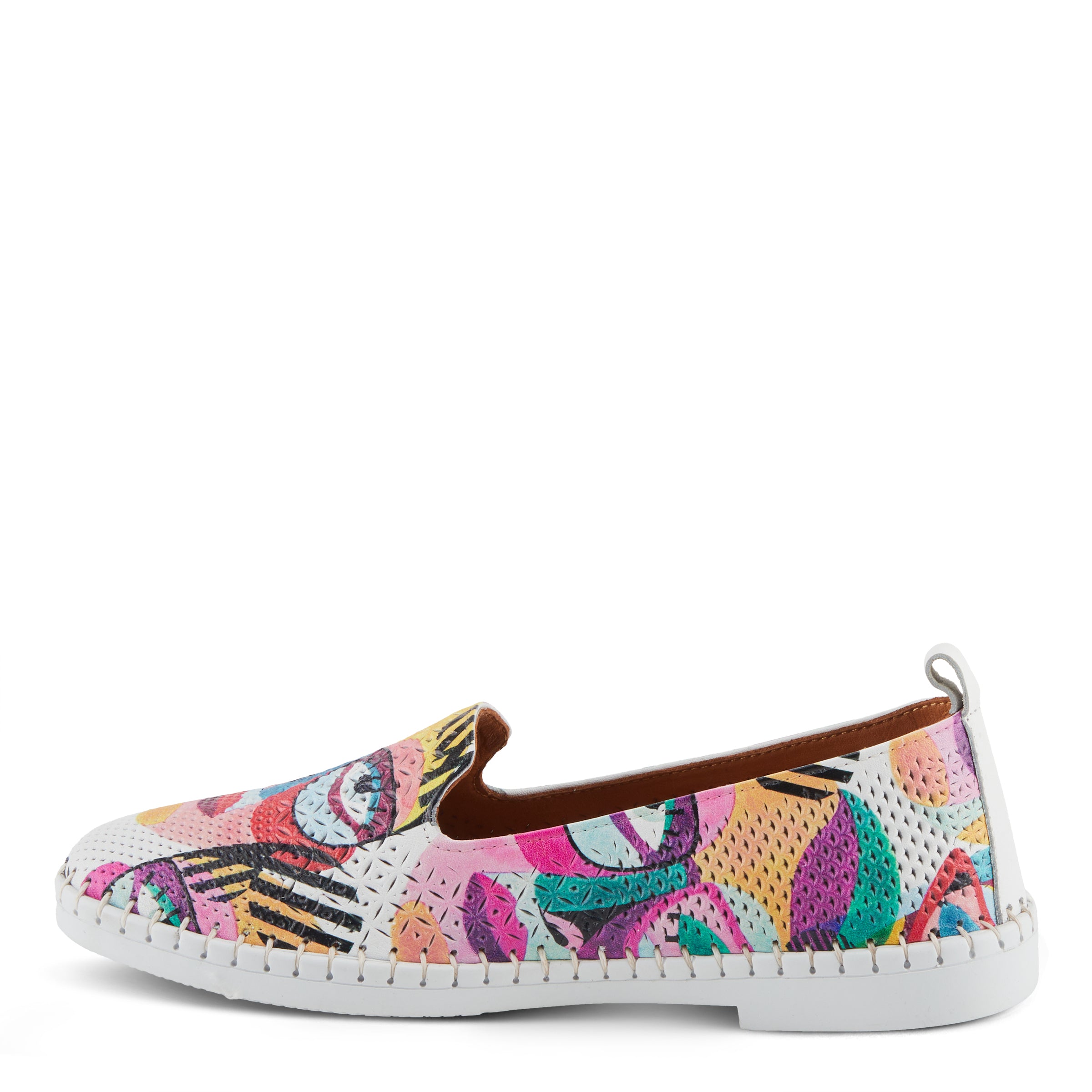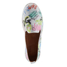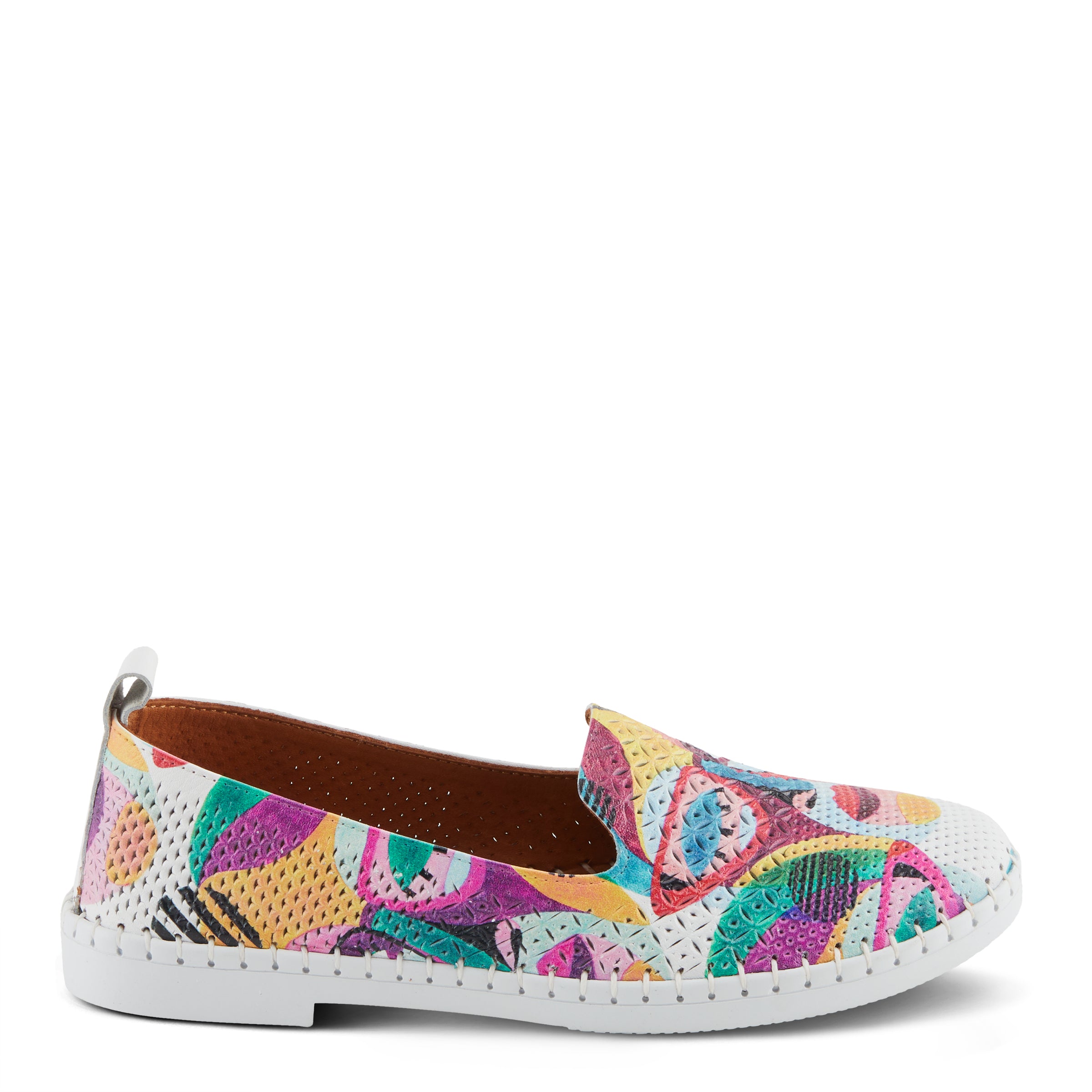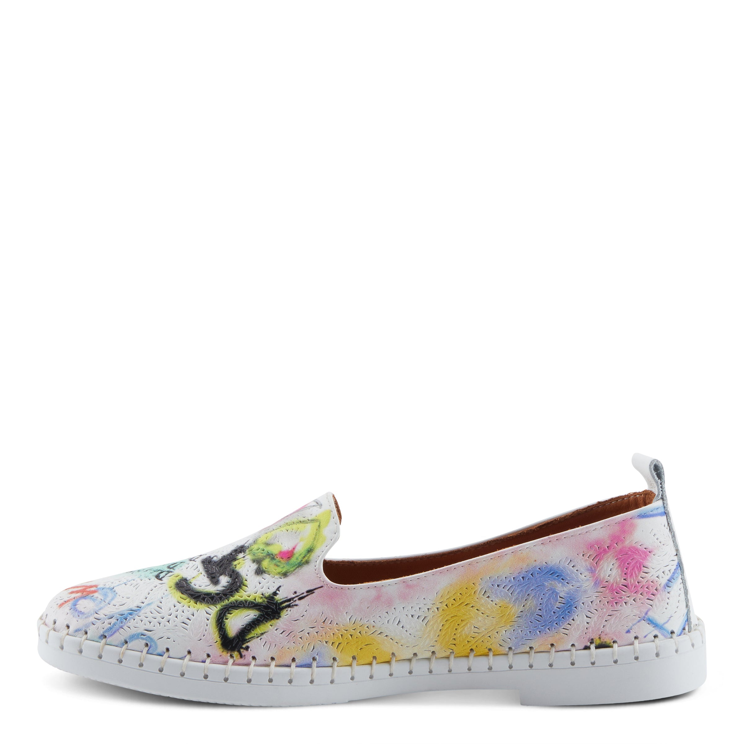 Introducing our stylish, flat leather shoe featuring a modern printed graphic, unparalleled comfort with its plush footbed, and exquisite whipstitch detailing.