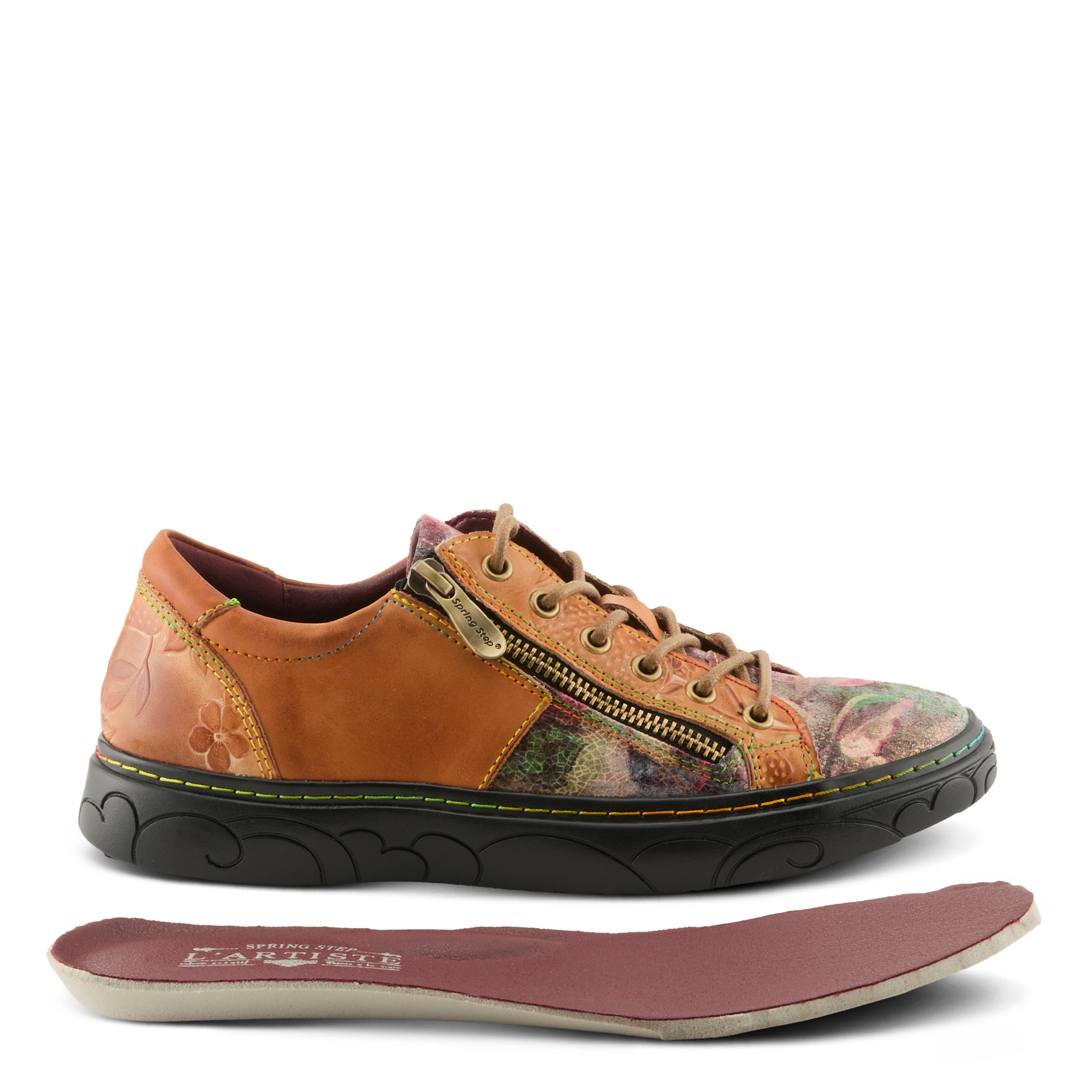 French inspired zippered sneaker like casual, featuring premium leather, both hand-painted and embossed, with metallic rose printed textile accents. Adjustable metal eyelet lace-up closure with lace keeper, vibrant rainbow stitching, and a super padded comfort collar and removable footbed all on a flat, bear embossed sculpted flatform edged in rainbow stitching.
