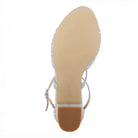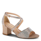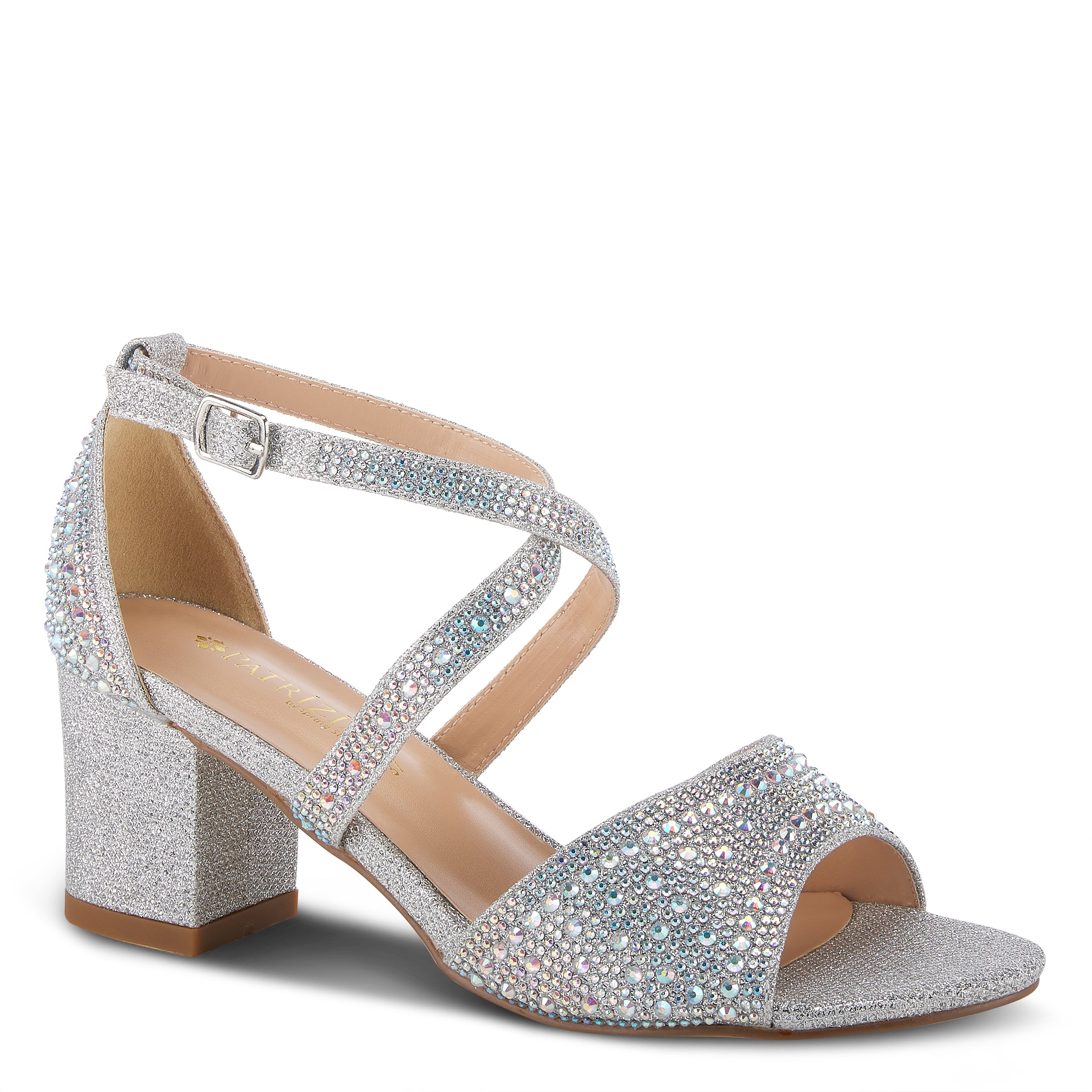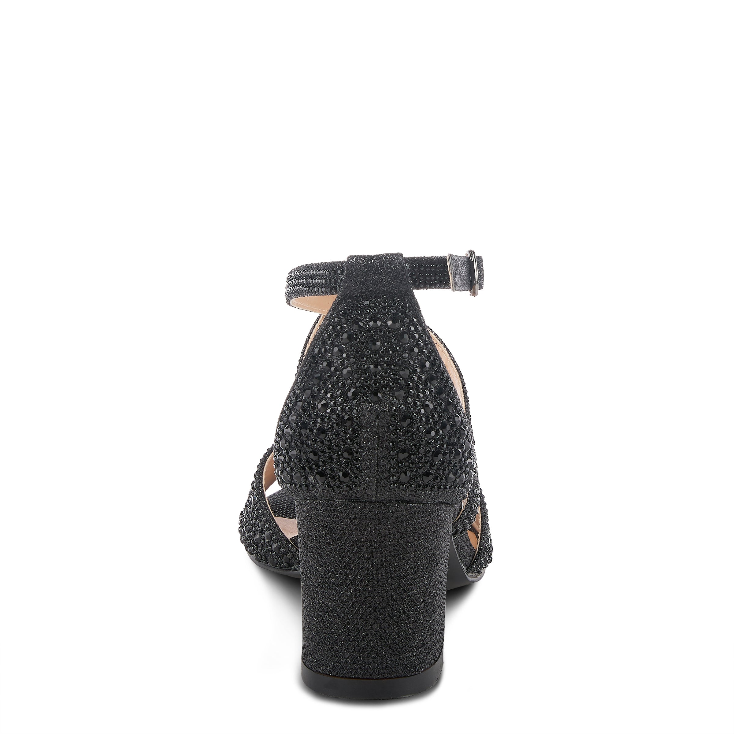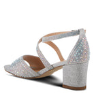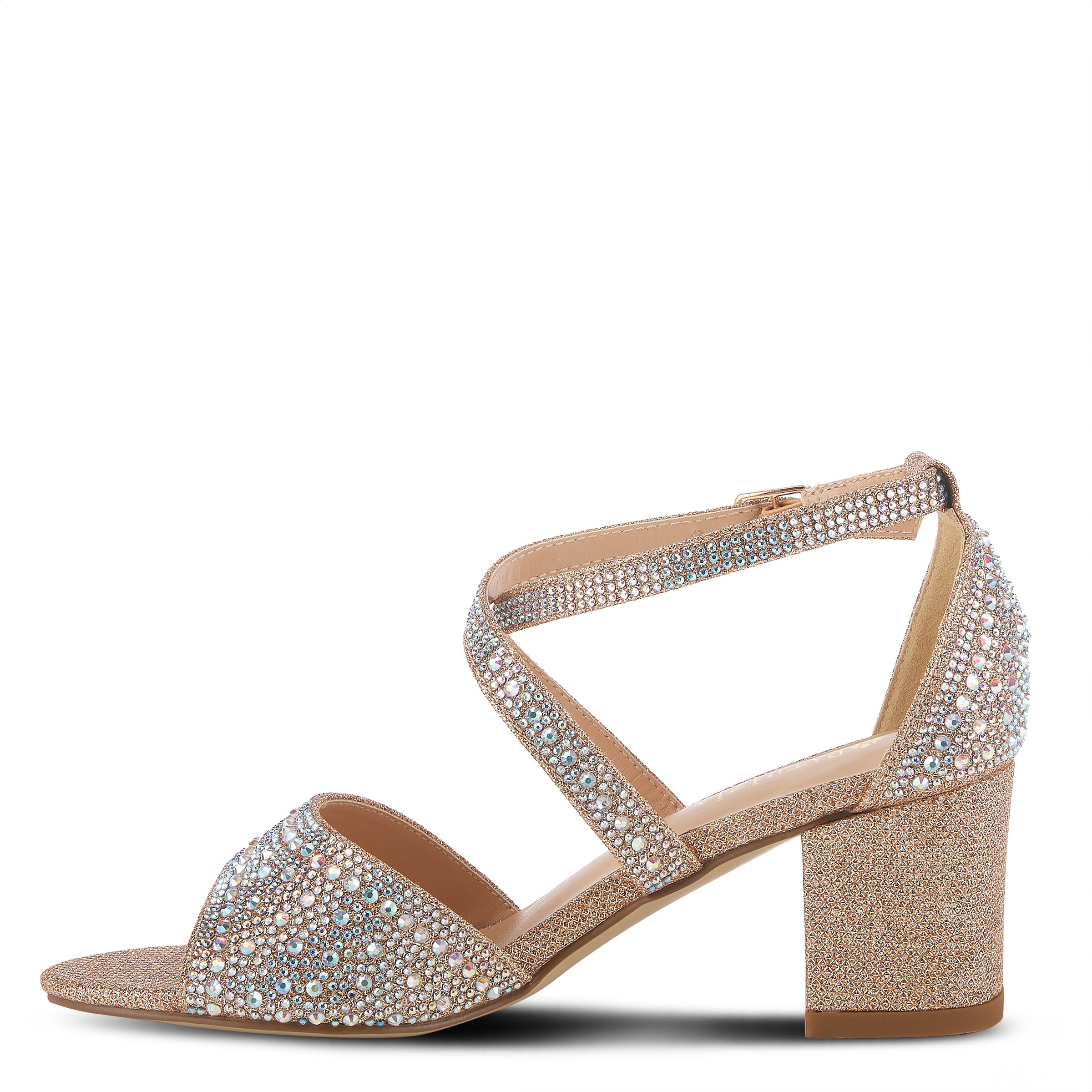 Classy criss-cross strapped, open-toe sandal starring beautiful tonal crystals on a comfort blocked heel.