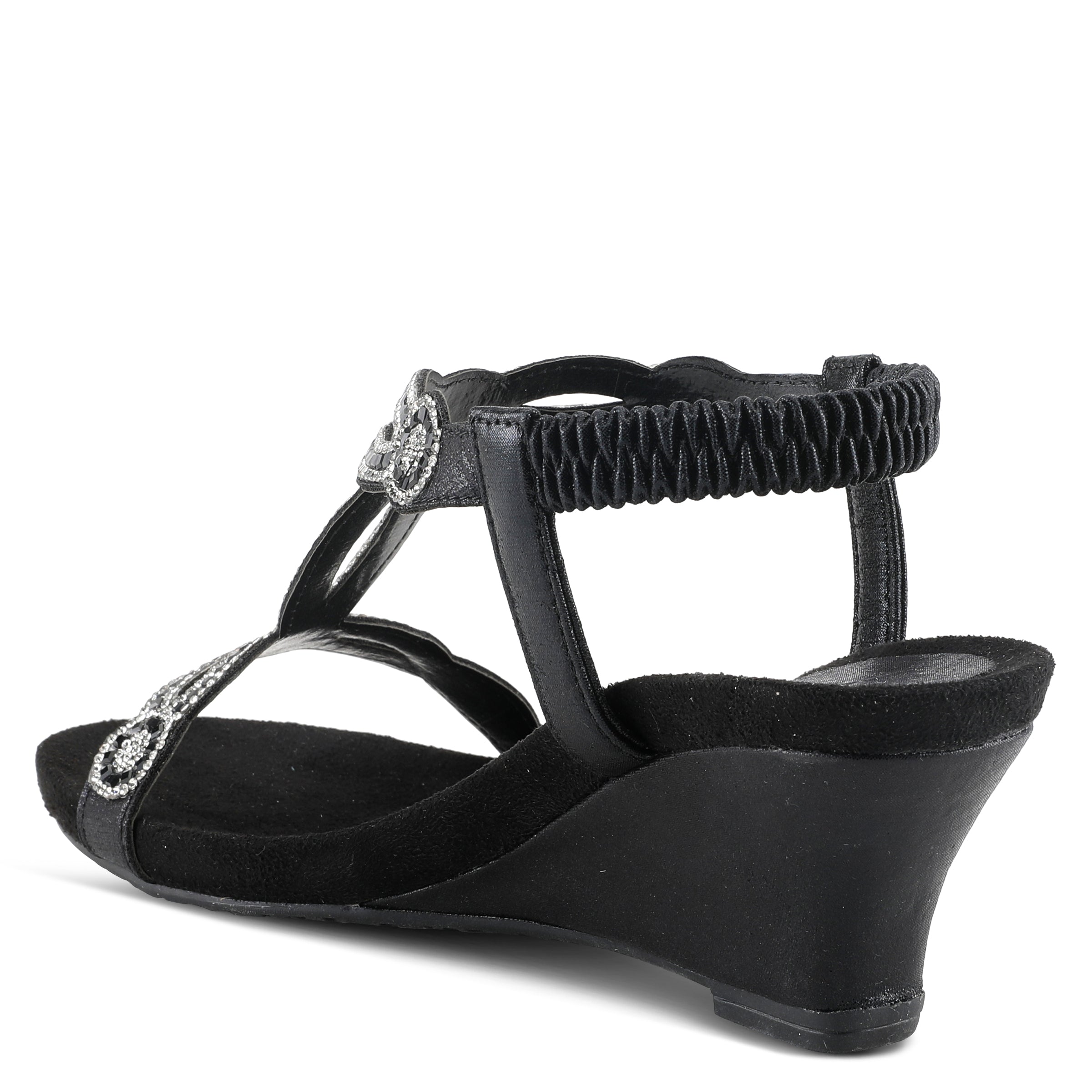Elegant crystals and cut outs design slip-on sandal on a slightly shiny, silky wrapped comfy wedge.