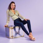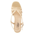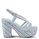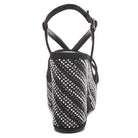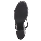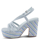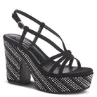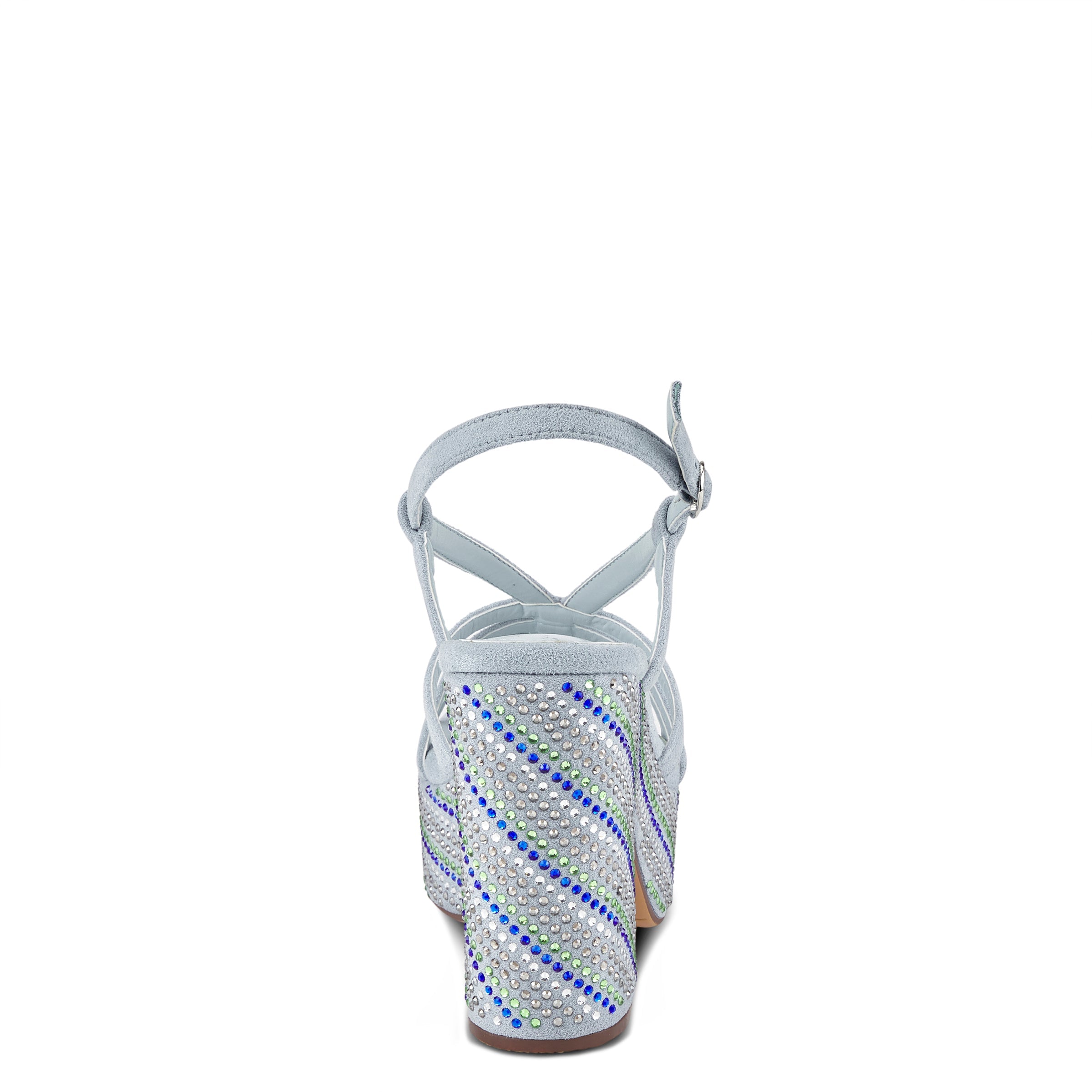 This chunky platform heel wrapped in diagonal rhinestones is the ultimate party shoe. This shoe offers a beautiful strap design at the vamp and a buckle closure