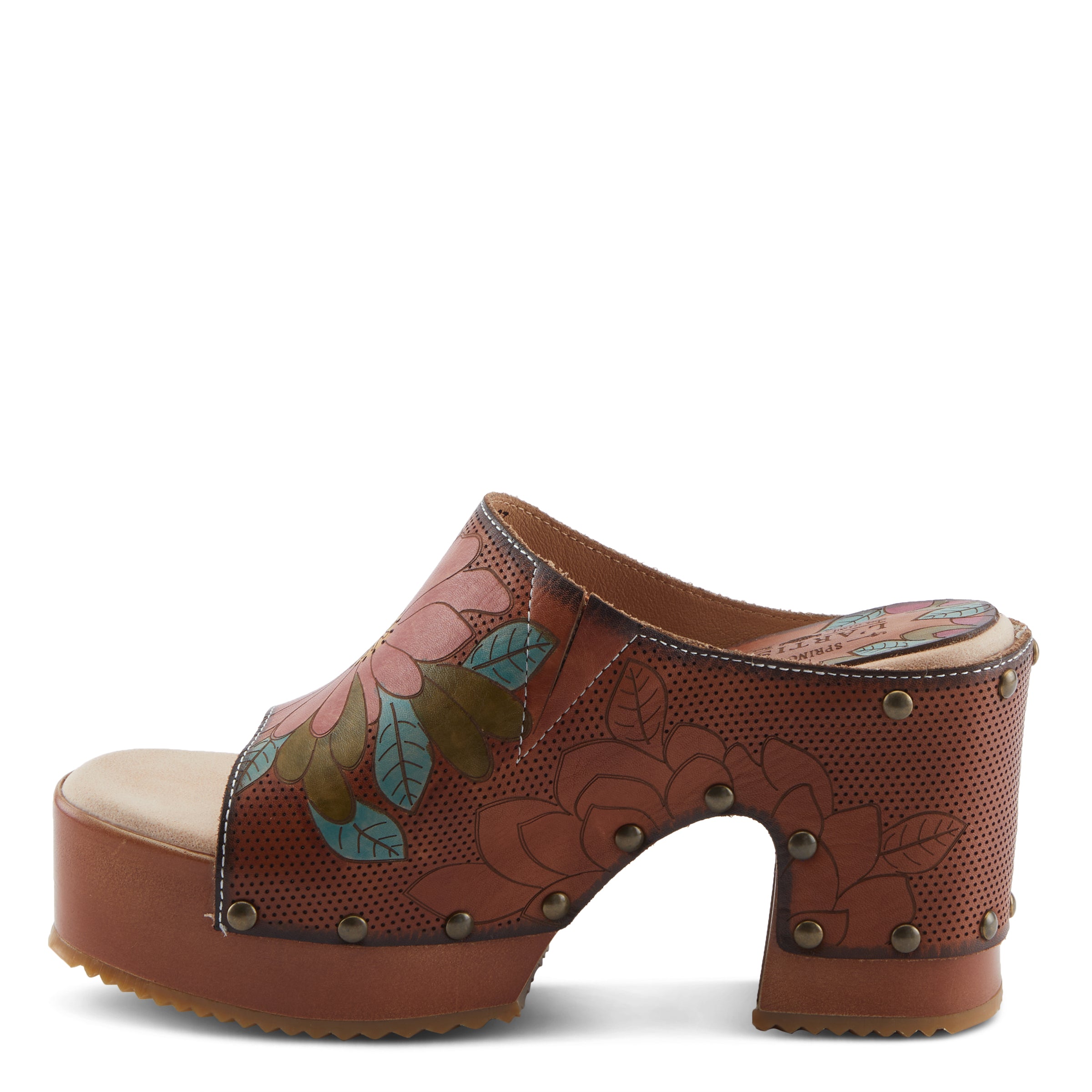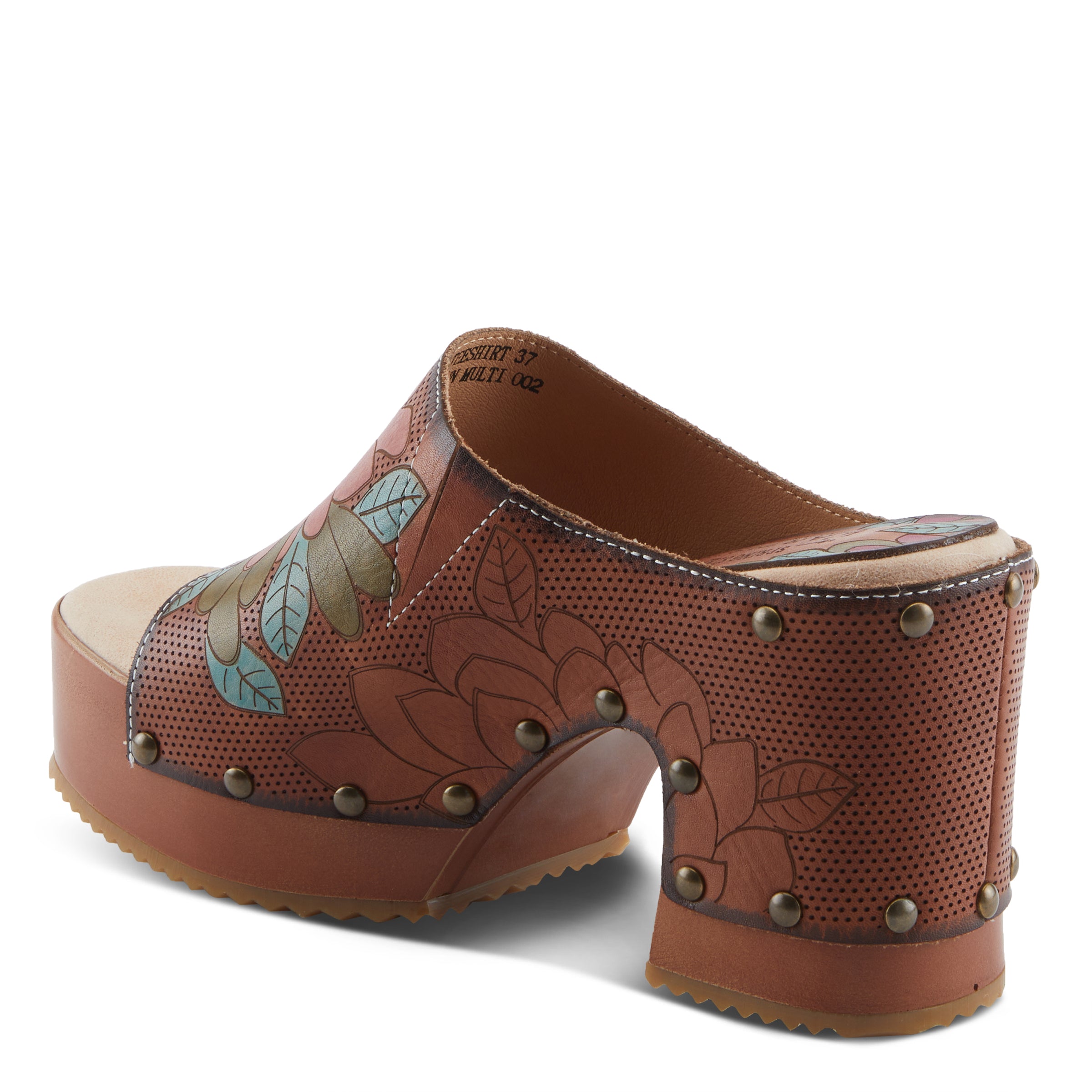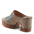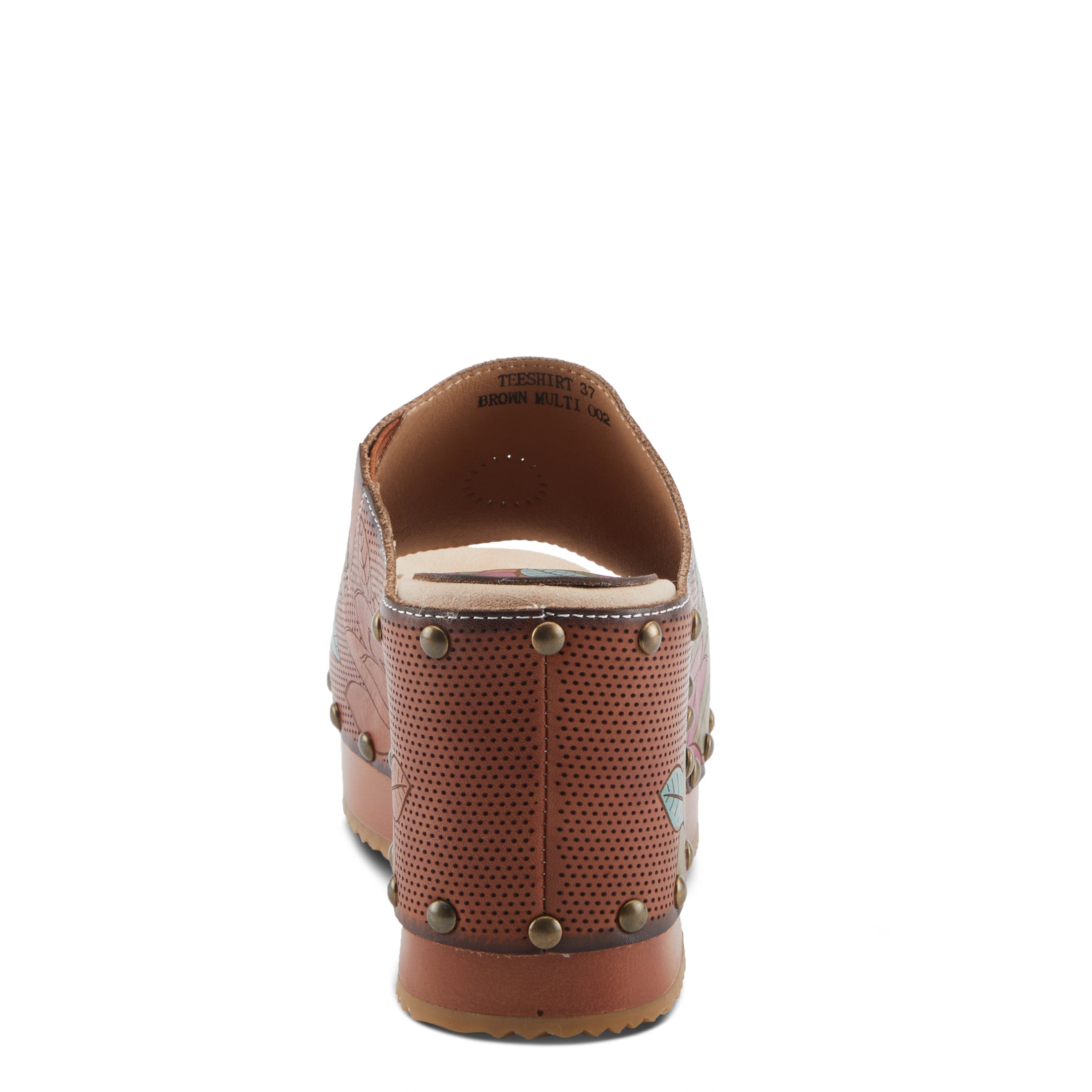 Step into the sunshine with the TEESHIRT sandal, a cute and flirty platform that's blooming with style. Crafted from supple leather, this open-toe sandal features a hand-painted flower in full bloom on the upper, accented by bronze studs that create a hooded, protective effect by wrapping around the entire sole - which is how she got her name! With a plush, hand-painted footbed, each step you take will be as comfortable as it is eye-catching.