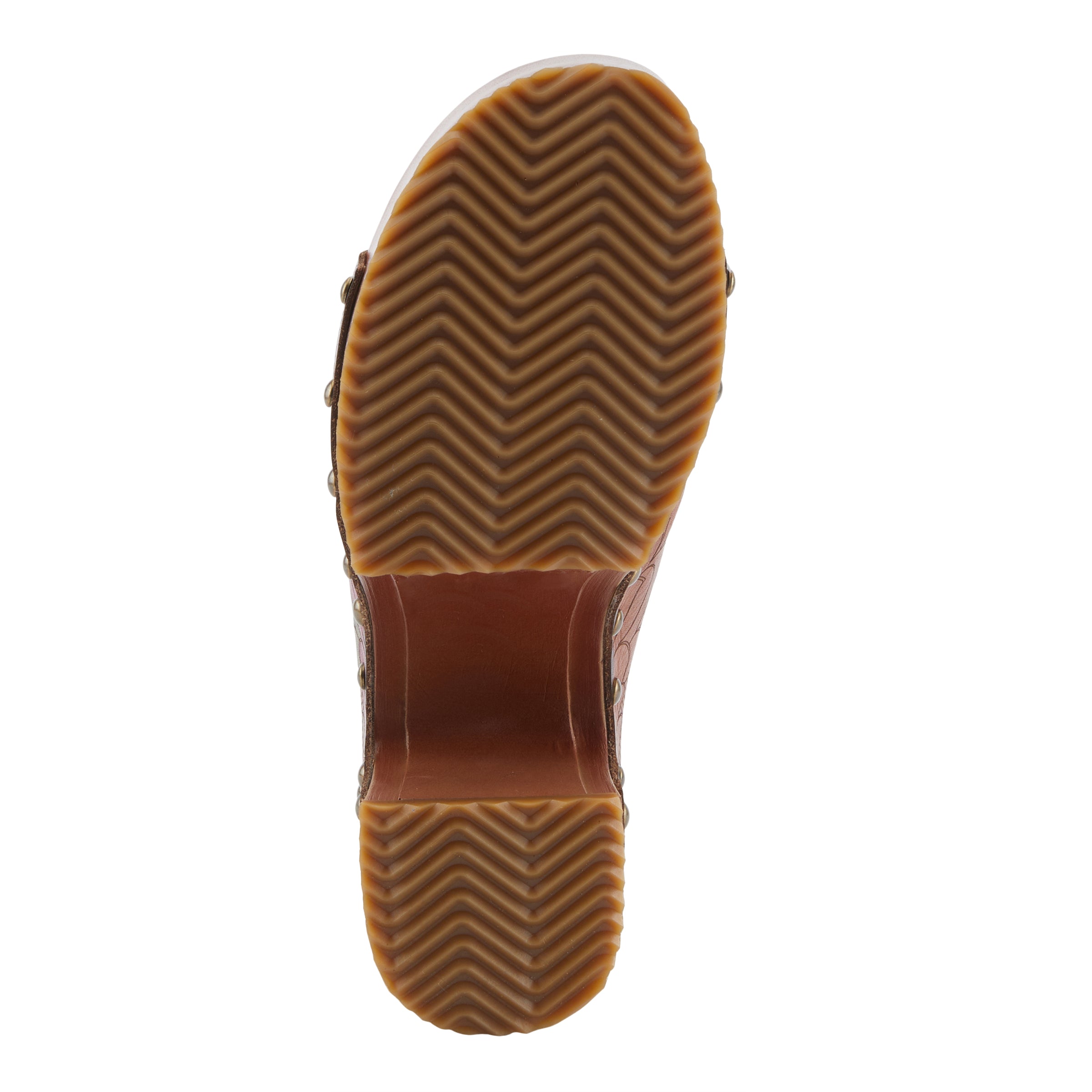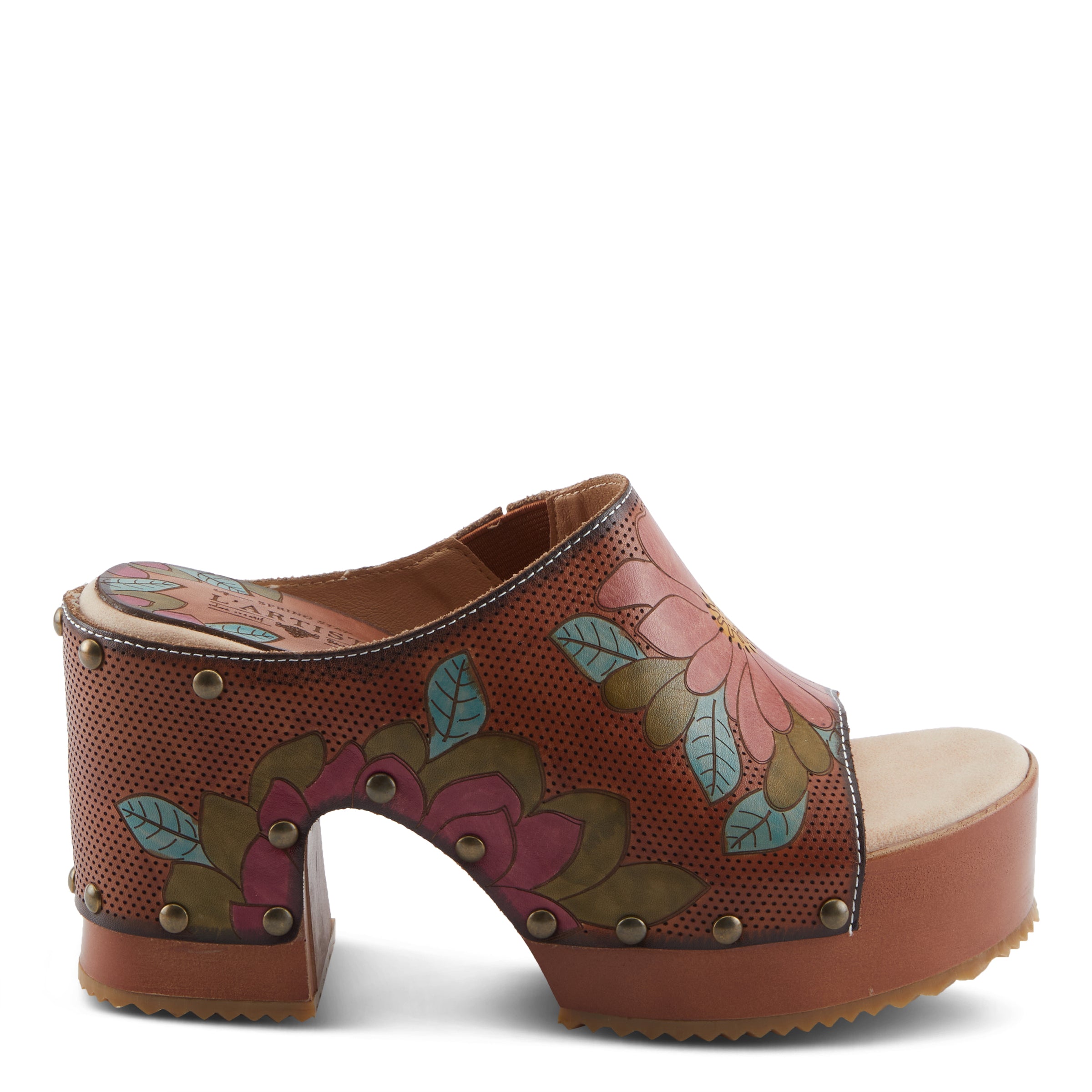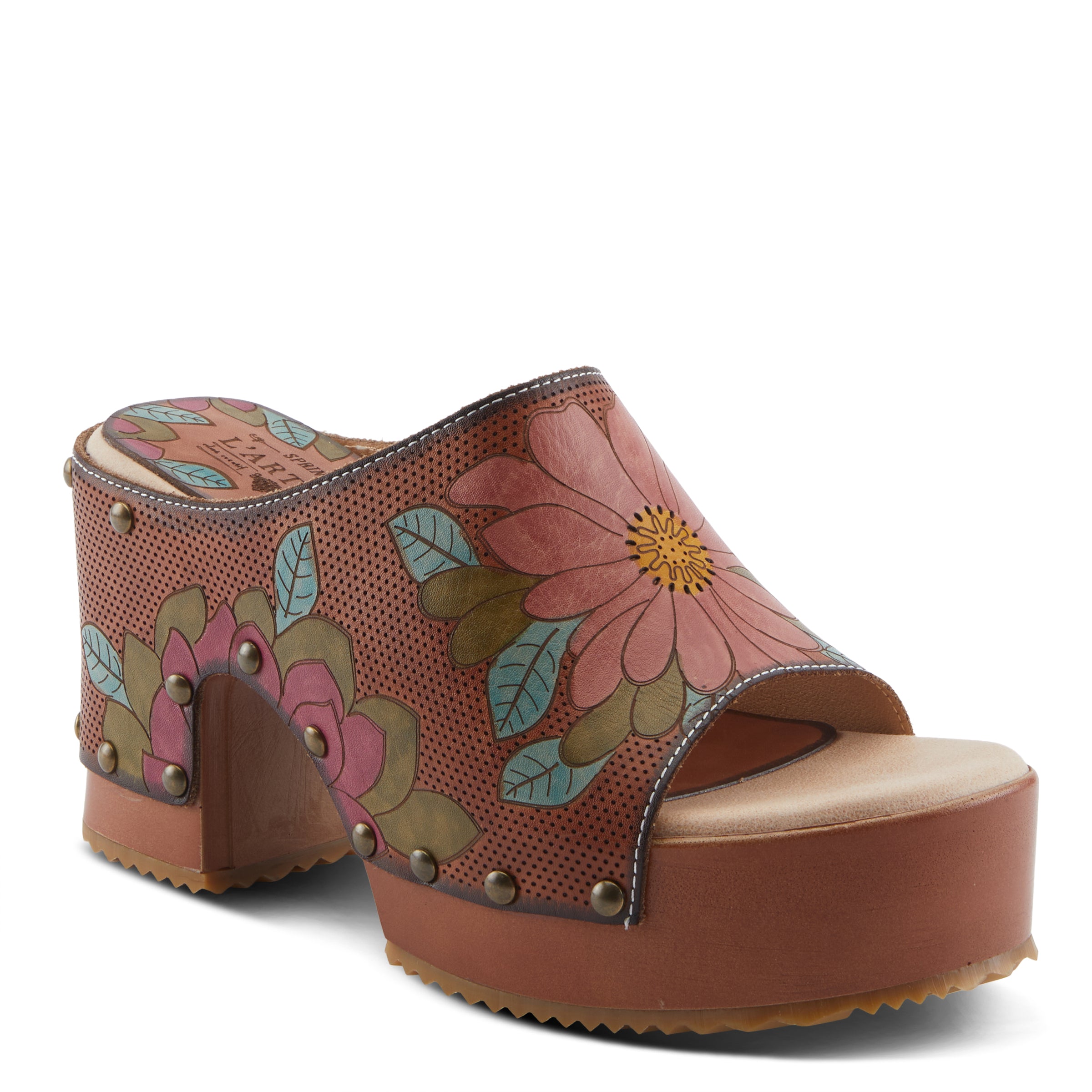 Step into the sunshine with the TEESHIRT sandal, a cute and flirty platform that's blooming with style. Crafted from supple leather, this open-toe sandal features a hand-painted flower in full bloom on the upper, accented by bronze studs that create a hooded, protective effect by wrapping around the entire sole - which is how she got her name! With a plush, hand-painted footbed, each step you take will be as comfortable as it is eye-catching.