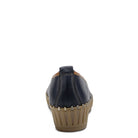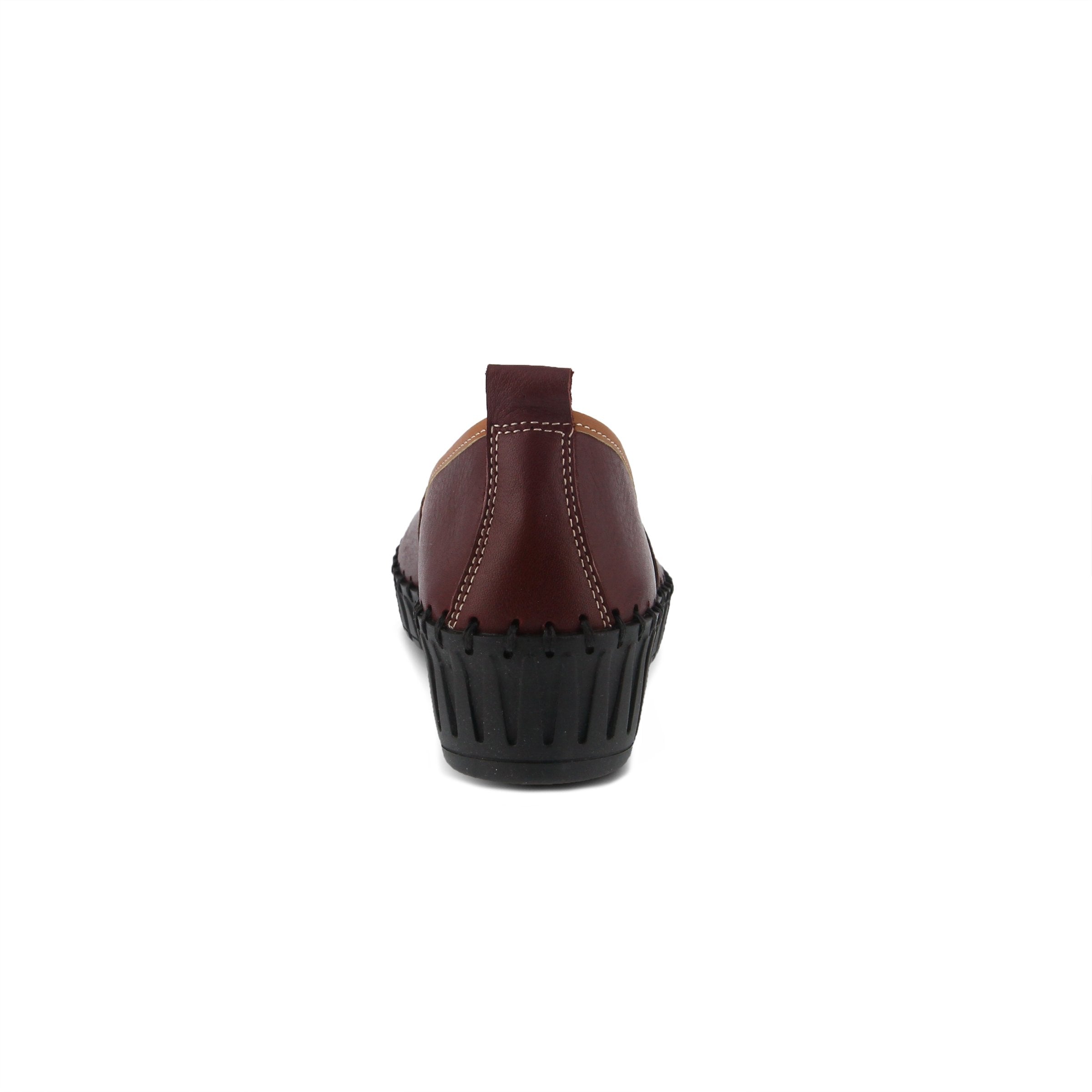 Dainty and trendy premium leather slip-on loafer featuring an incorporated stretch elastic v-cut vamp and a contrast stitching design all on a sculpted rubber wedge outsole.