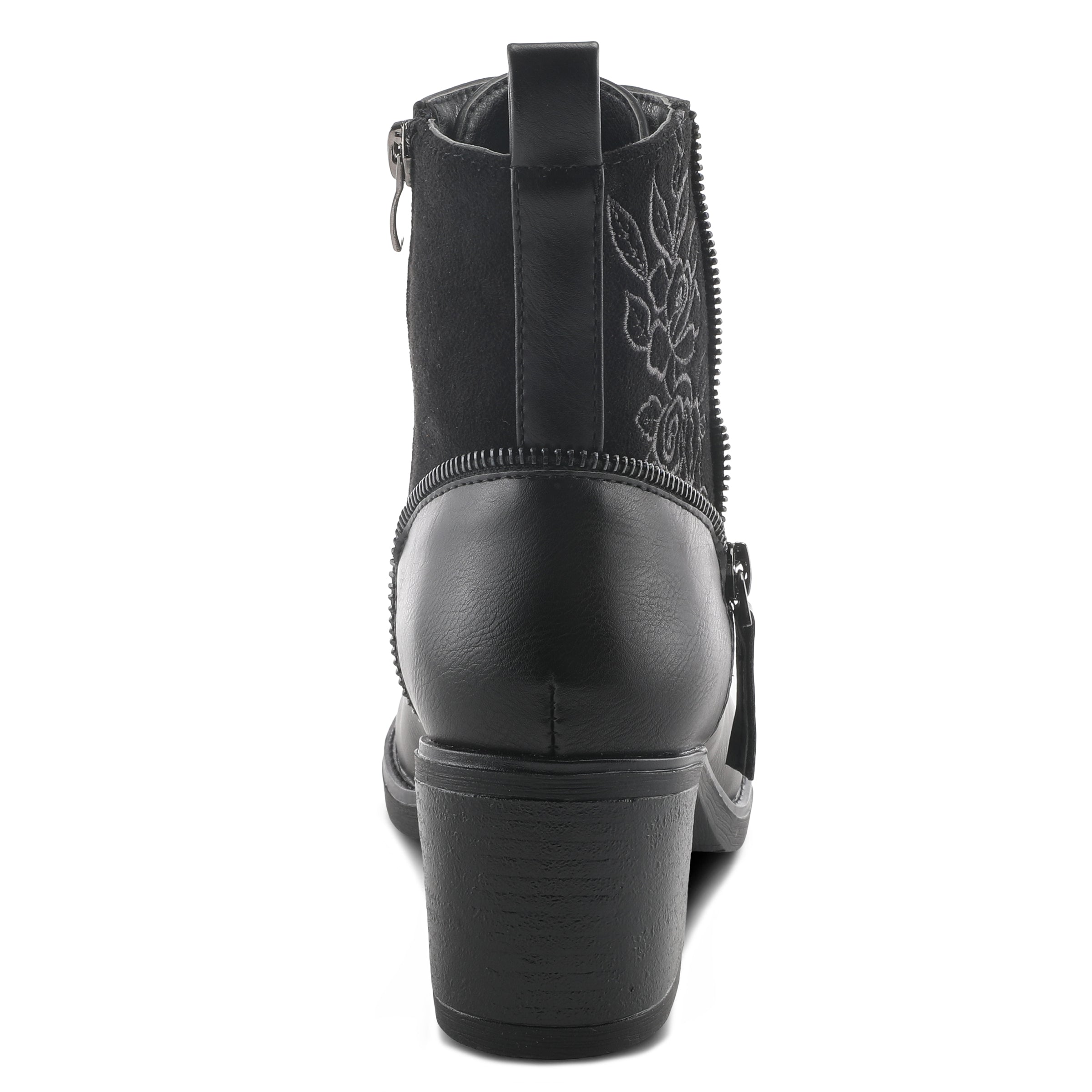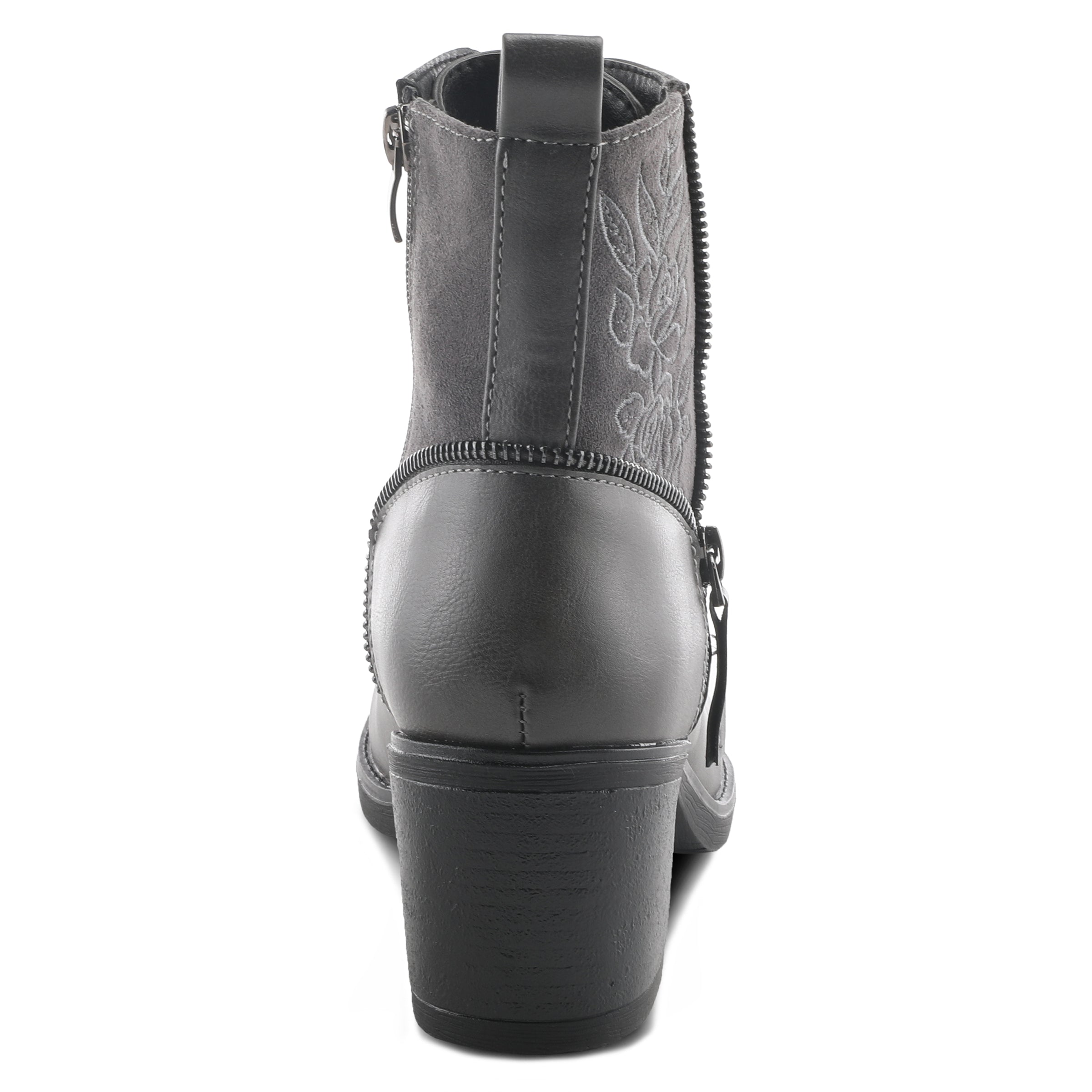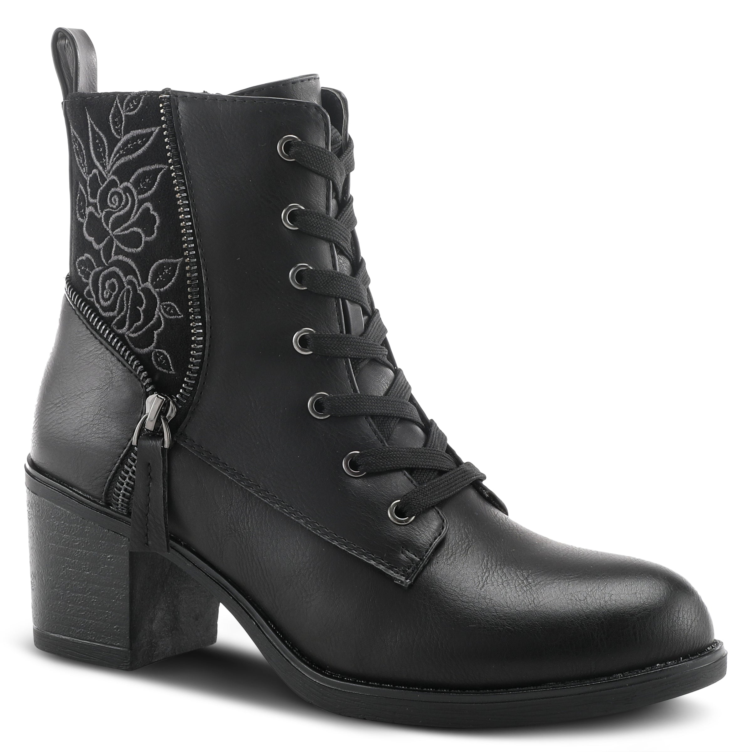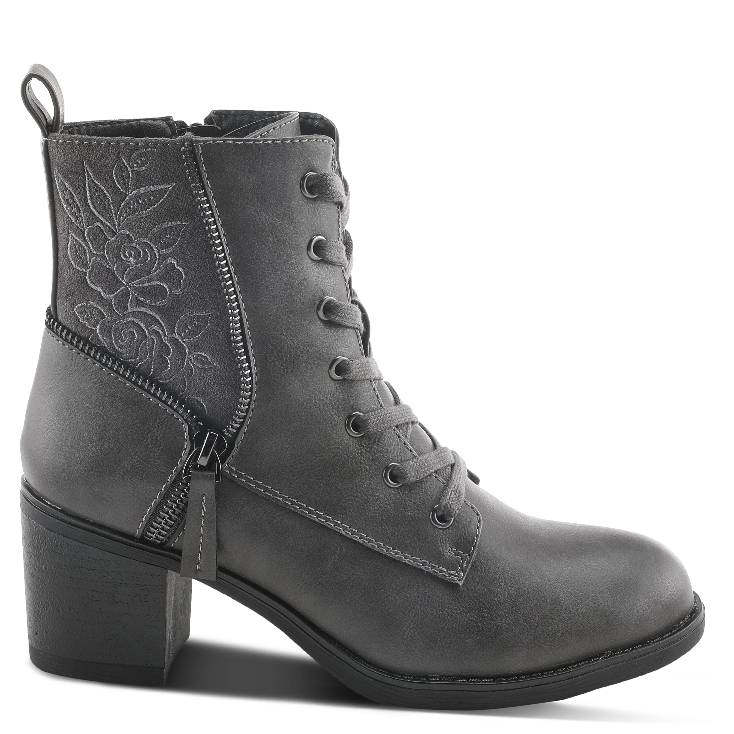 A decorative zipper accent reveals a microsuede panel of delicate floral embroidery atop the shaft of this round toe lace up bootie. A flexible sole with faux stacked heel complete this classic silhouette with a modern twist.