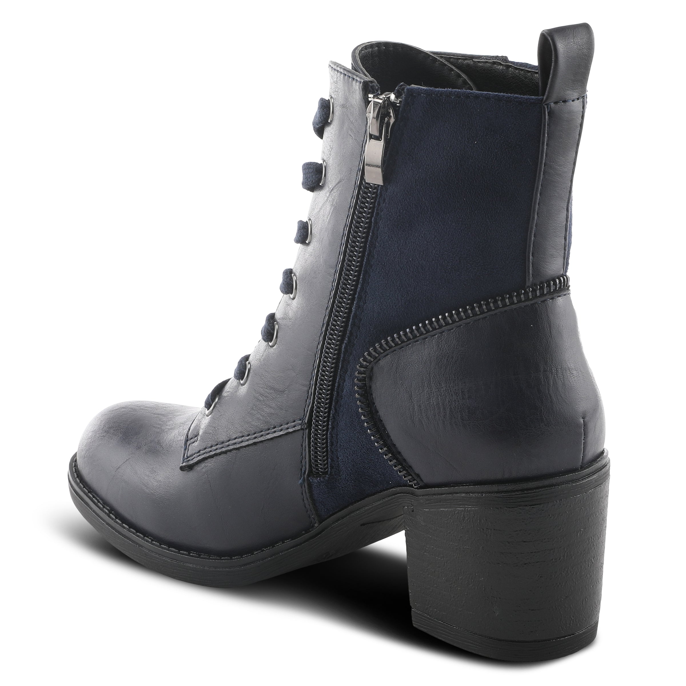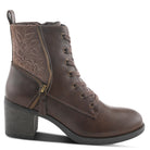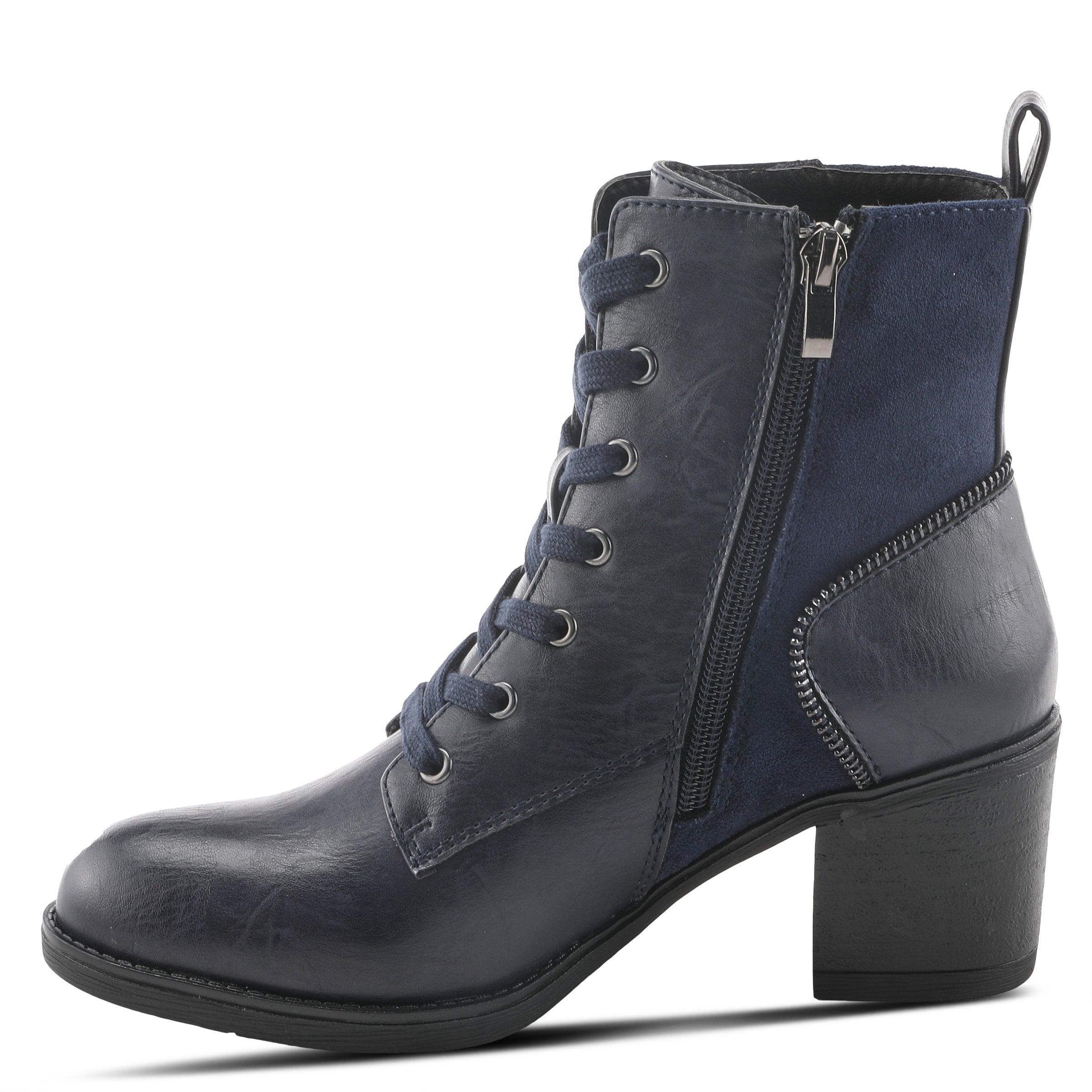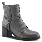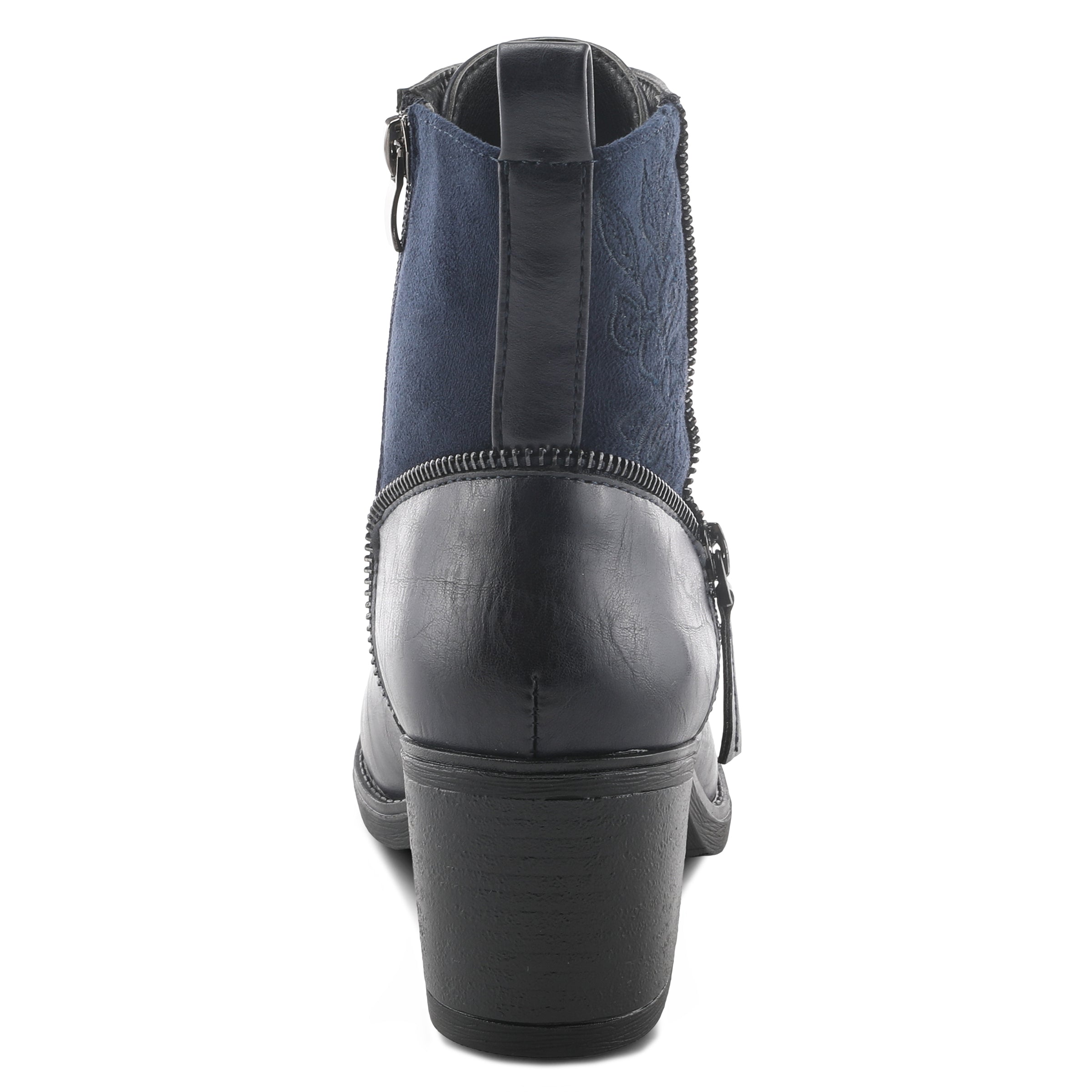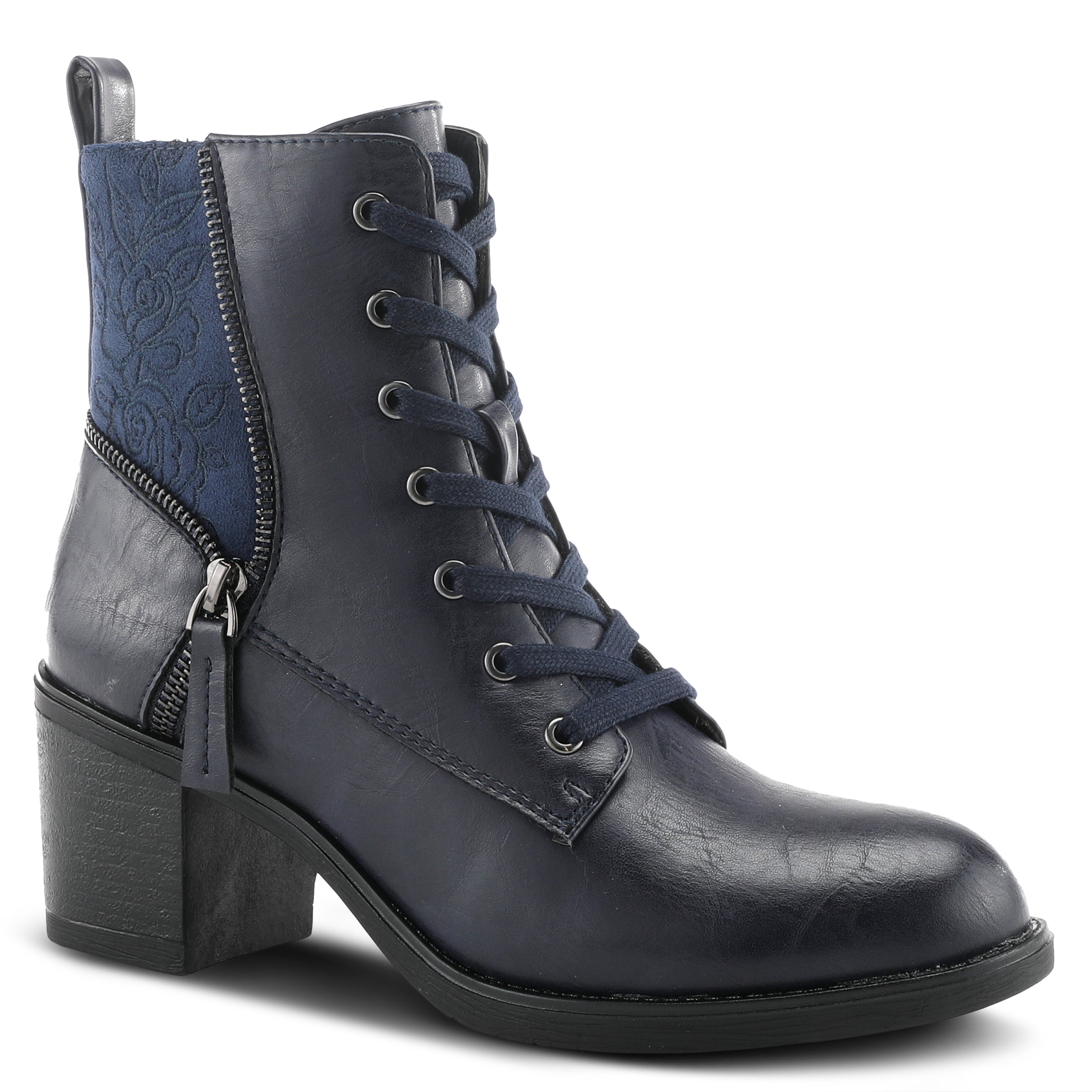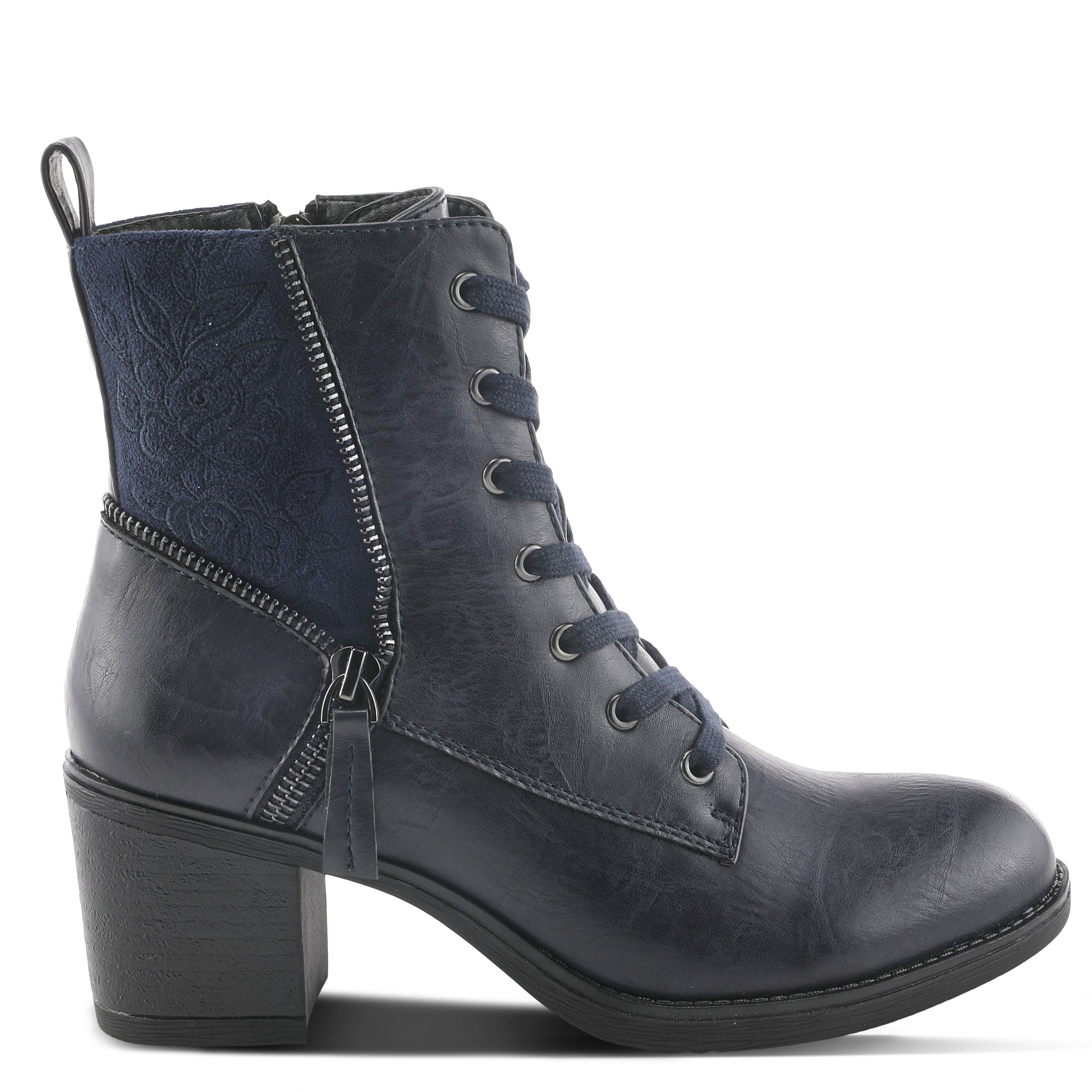 A decorative zipper accent reveals a microsuede panel of delicate floral embroidery atop the shaft of this round toe lace up bootie. A flexible sole with faux stacked heel complete this classic silhouette with a modern twist.