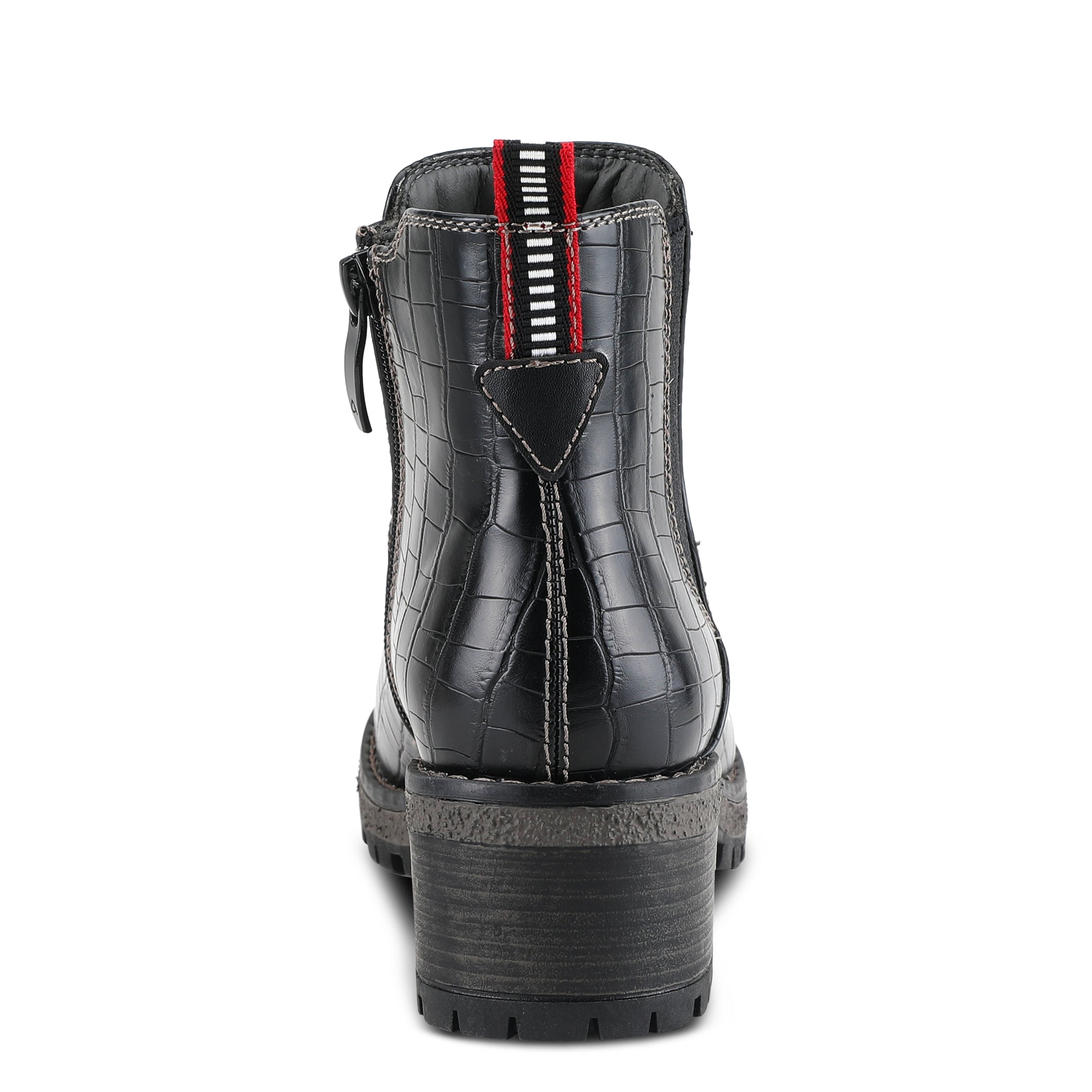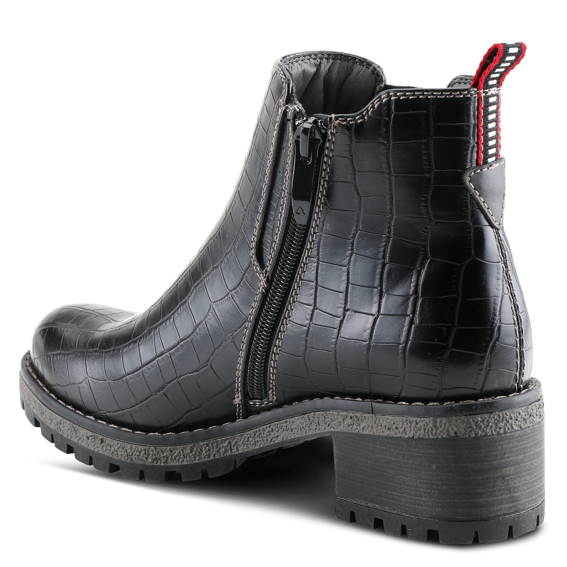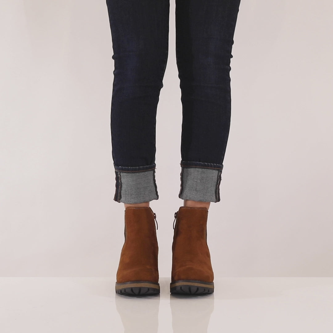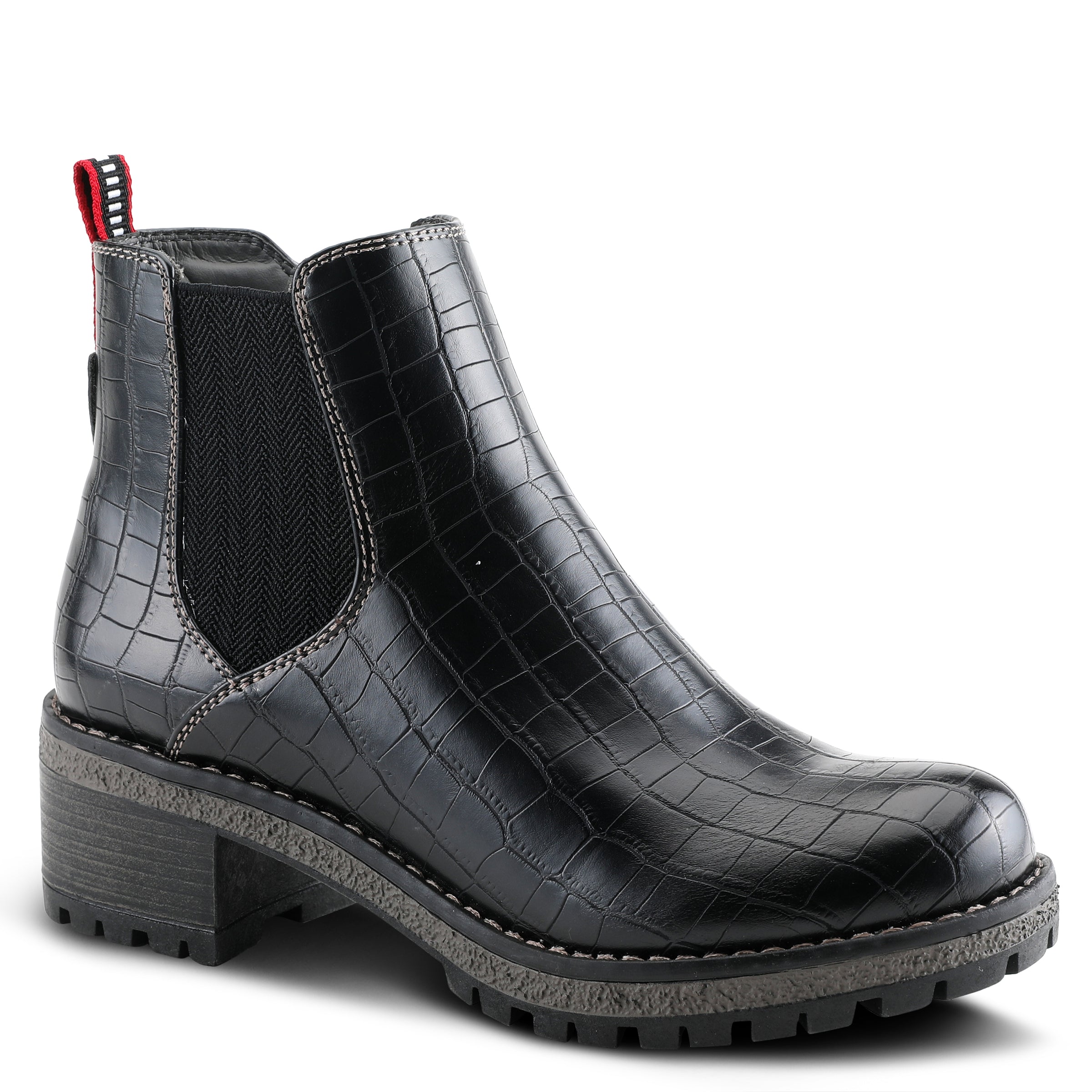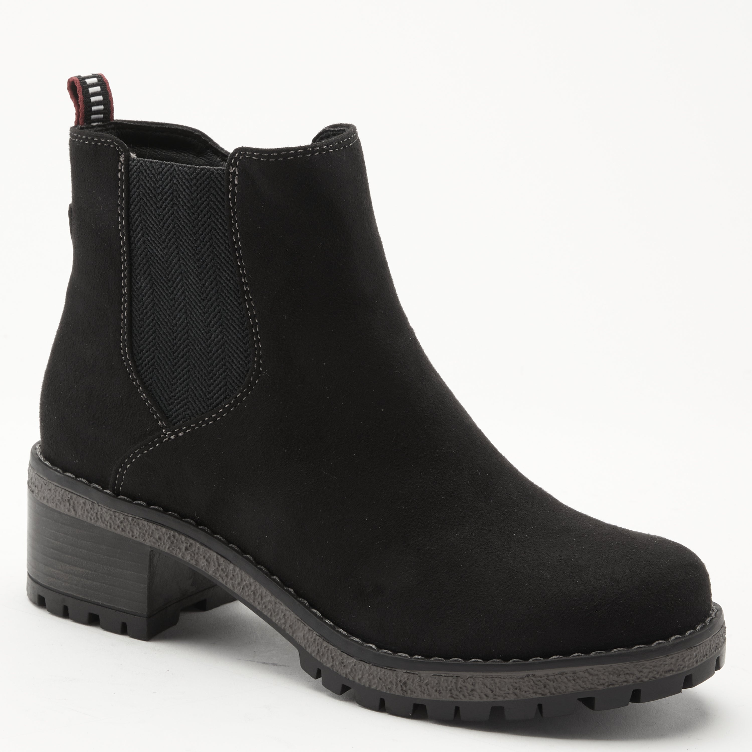 Classic Chelsie-inspired bootie with a patterned stretch elastic side gore on a small heel lug outsole.