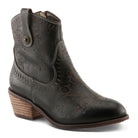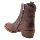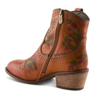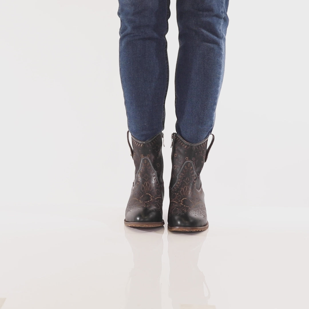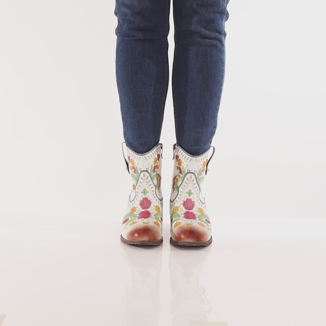Premium hand selected leathers featuring hand embossed and hand-colored sprigs of wispy leaves and blooms. Fashion Cowgirl style boot with front yoke, outside cabochon embellished pull tab, and inside zipper.