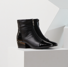 Mozza Vintage 70's go-go boot vibed patent cap-toe and back, with shiny metallic pewter edged heel and front decorative zipper. Soft manmade leather upper with inside zipper, short cropped faux fur lining and padded velour footbed.
