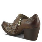 This western-inspired shootie with a pointed toe and a functional zipper is a unique and stylish shoe that is sure to turn heads. The brushed and burnished finish of the shoe gives it a rustic look that is perfectly complemented by the hand-painted laser cut geometric graphic design appliques. These intricate designs add a touch of modernity to the otherwise classic western style. The studs that follow the design further enhance the edgy and trendy vibe of the shoe. But despite its striking appearance, the shootie is also practical, with its functional zipper allowing for easy on and off. Whether you’re dressing up for a night out or just looking to add some flair to your everyday wardrobe, this shootie is a versatile and stylish choice.