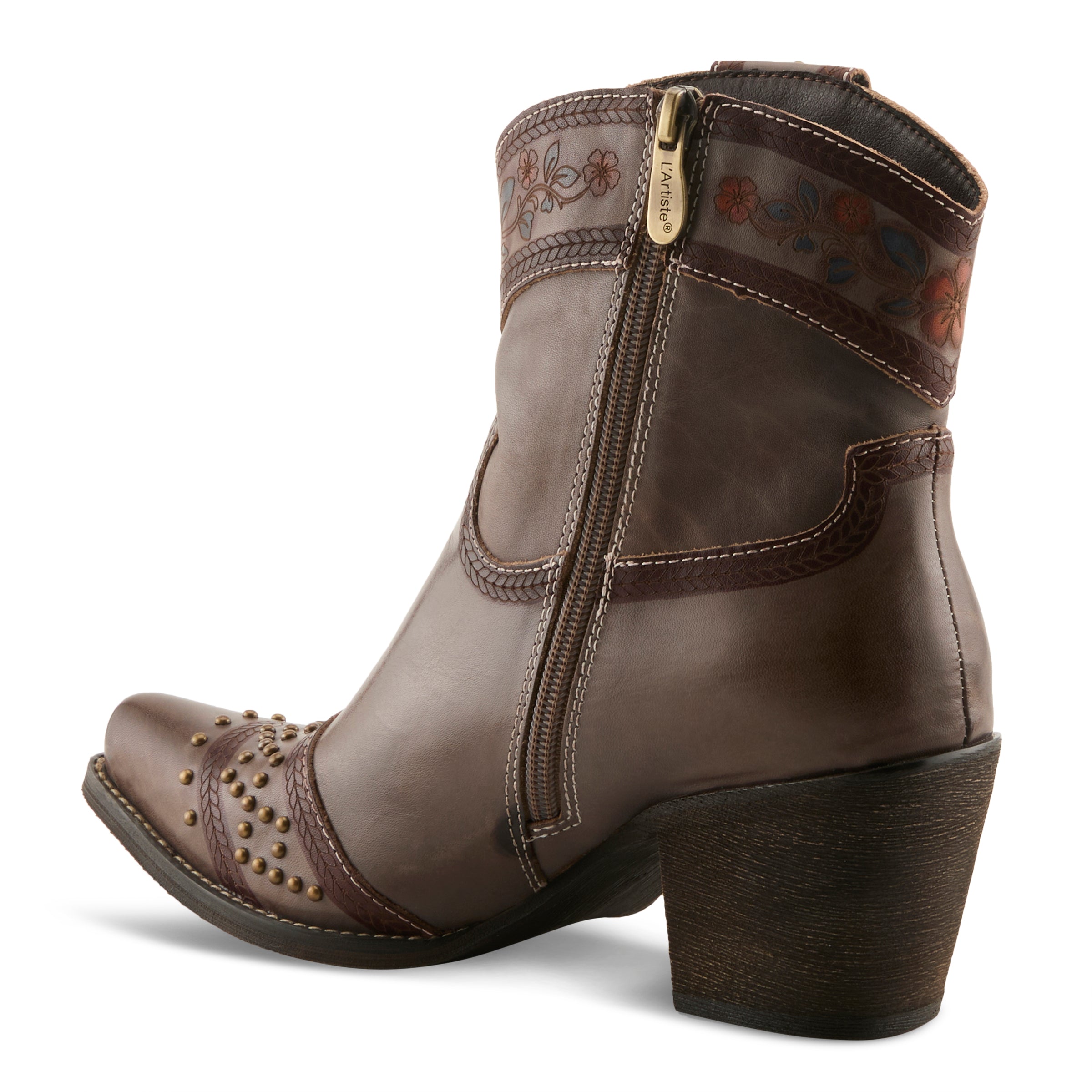 Channel your inner cowgirl with this bold and artistic Western-inspired boot. Crafted from premium leather, this standout piece blends rugged charm with modern sophistication. Intricate stud detailing, contrast stitching, and floral embossed panels add a chic, artsy touch to the classic cowboy silhouette. The faux stacked heel provides stability and just the right amount of lift, while the cushioned insole ensures all-day comfort. A convenient side zipper allows for easy wear, making this boot perfect for those who love fashion with a Western twist. Pair it with jeans or a flowy dress for effortlessly cool style.