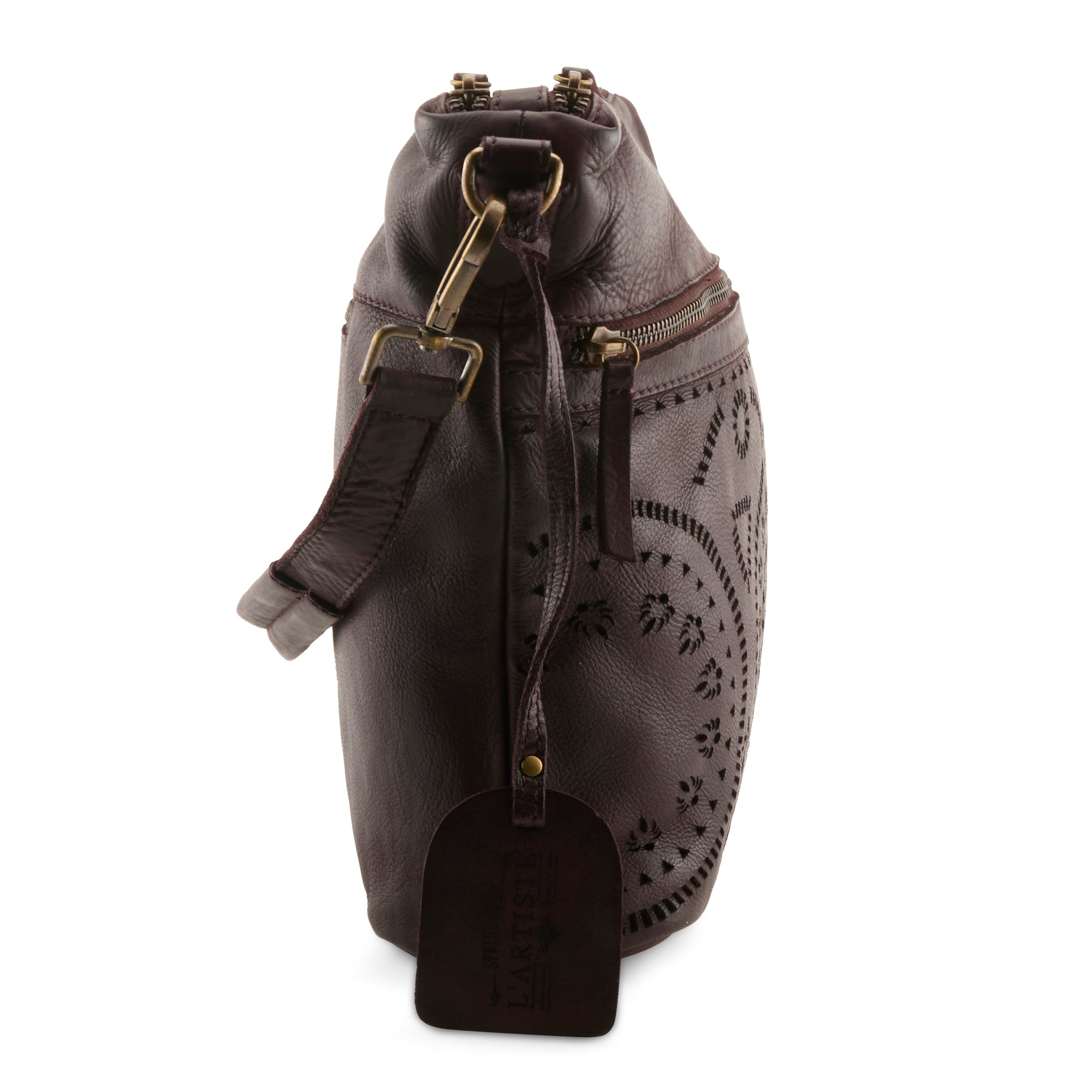 Elevate your style with this beautifully buttery soft leather Hobo bag, featuring intricate laser-cut patterns that blend circular and triangular motifs for a sophisticated yet boho chic look. Designed for both fashion and function, it boasts a duo of secure top zip compartments with cotton lined insides: one with a walled zipper pocket and one with an open walled pouch. And to make you fall even more in love with Chartres, she has additional full depth front AND back outside zip pockets for the utmost in versatility! A wide sturdy and detachable leather strap with substantial antique brass clasps, offer versatility for a close to the body wear, or add your own fashion strap if looking for a hands free crossbody experience. Whether you're heading to a meeting, a weekend outing, or a weeklong retreat, this bag will soon become your go-to fave by keeping you organized and ready for everything and anything that comes your way!