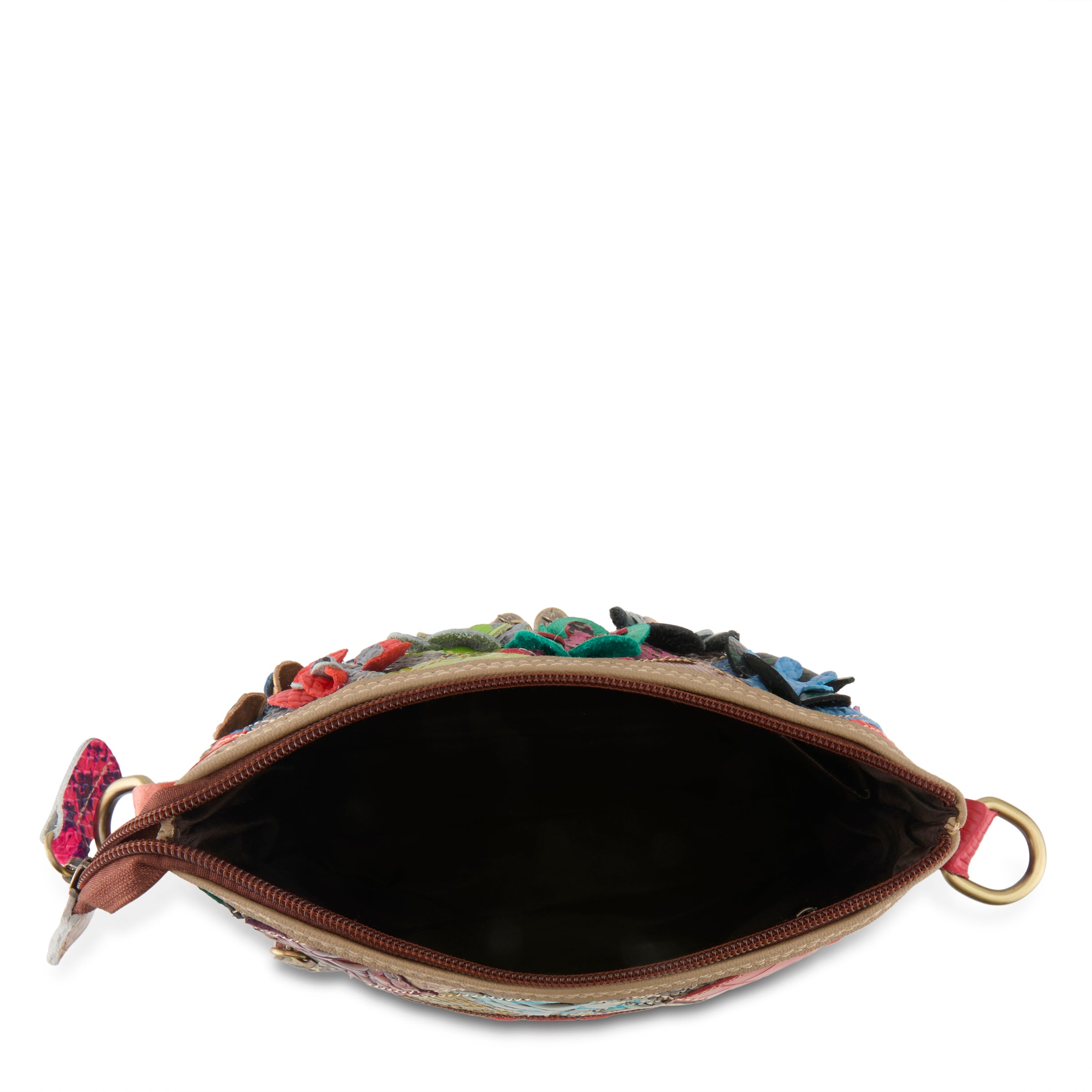 A fan favorite! Single compartment zip top crossbody/shoulder bag that is guaranteed to bring you nothing but joy! Starting with multiple colors, patterns and sizes of patent leather patches, 3 dimensional flowers, circles and squares; pansies, dots, florals crocs and pythons- oh my! No two bags will ever be alike- but who doesn't love surprises? What we CAN promise is over the top functionality with full width double tasseled front zip compartment, back zip pocket and inside multiple pouches and pocket. Strap is canvas backed with multiple patent leather strips. Protective storage bag.