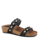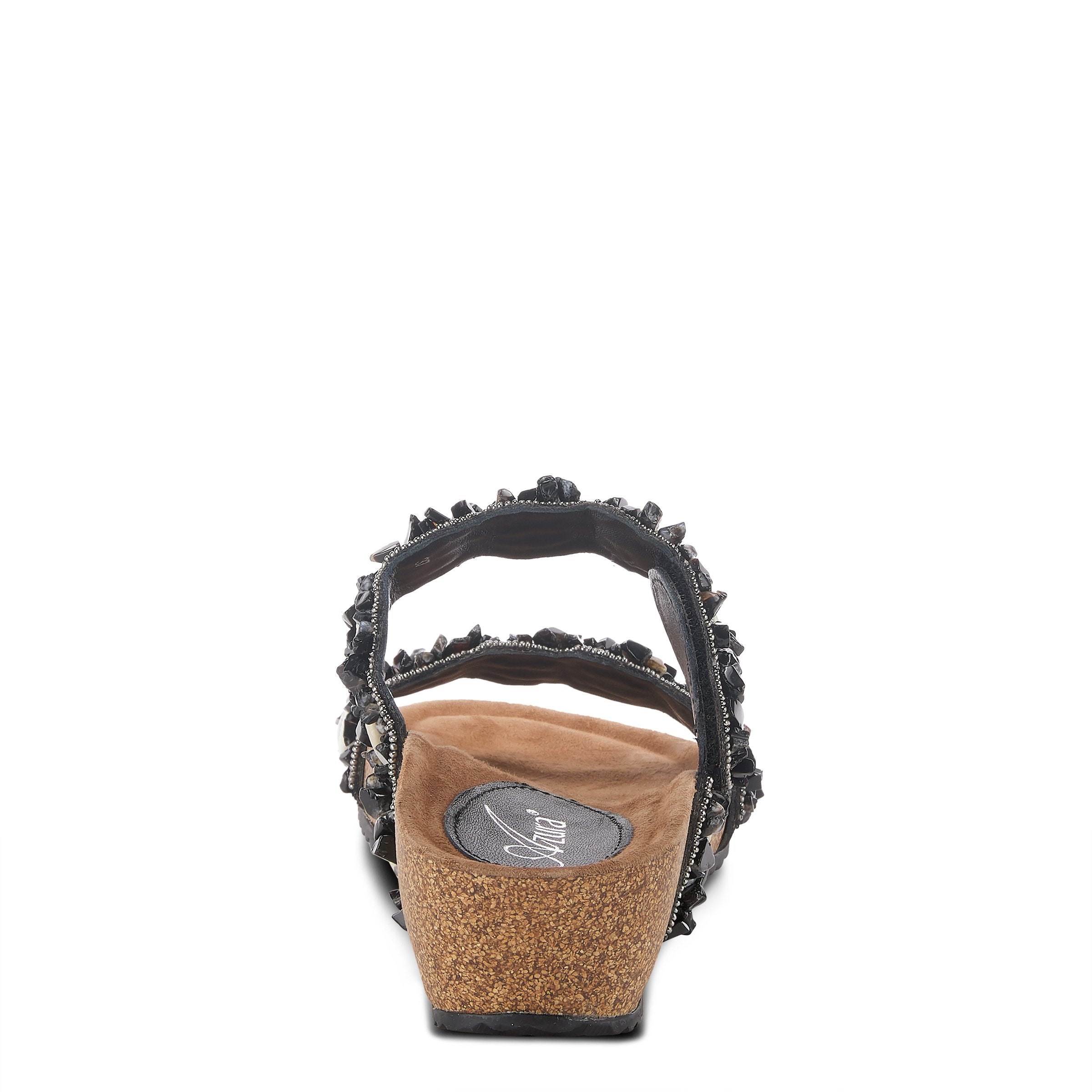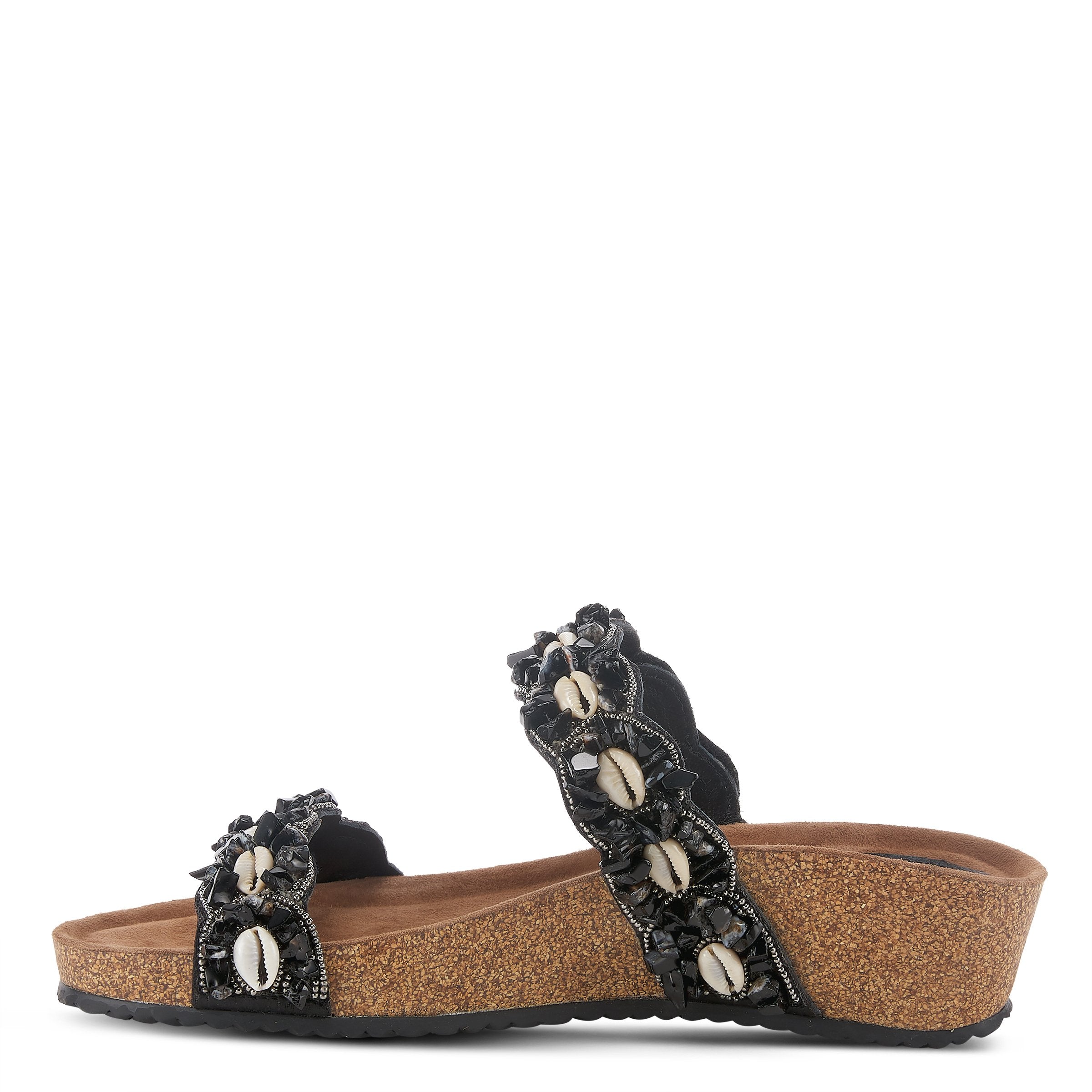 Beach-inspired double strap slide starring stunning beading and shell work on a cork-like comfort wedge.