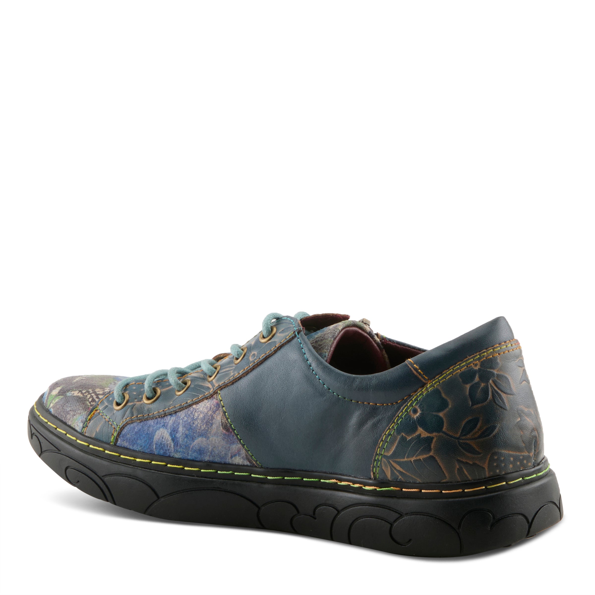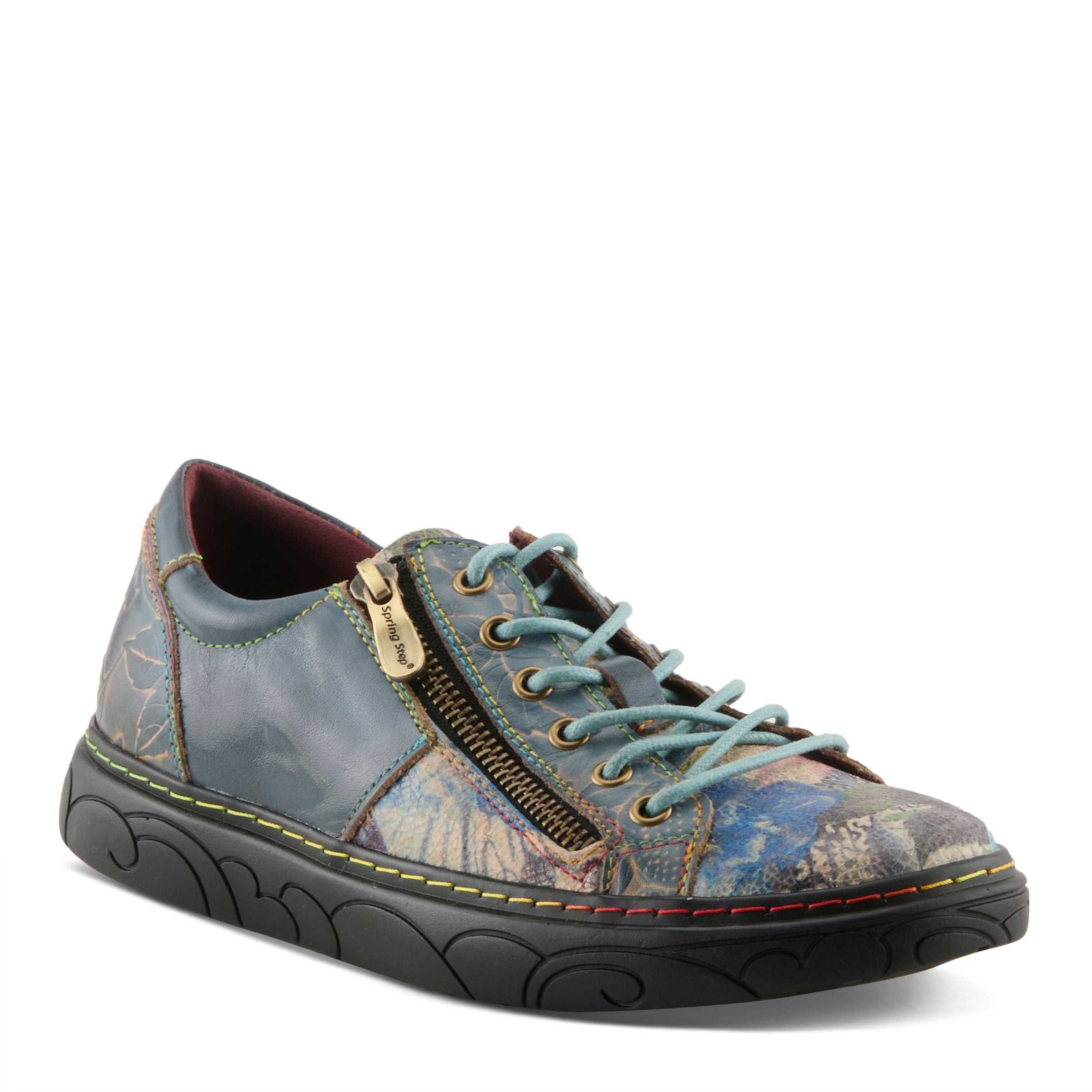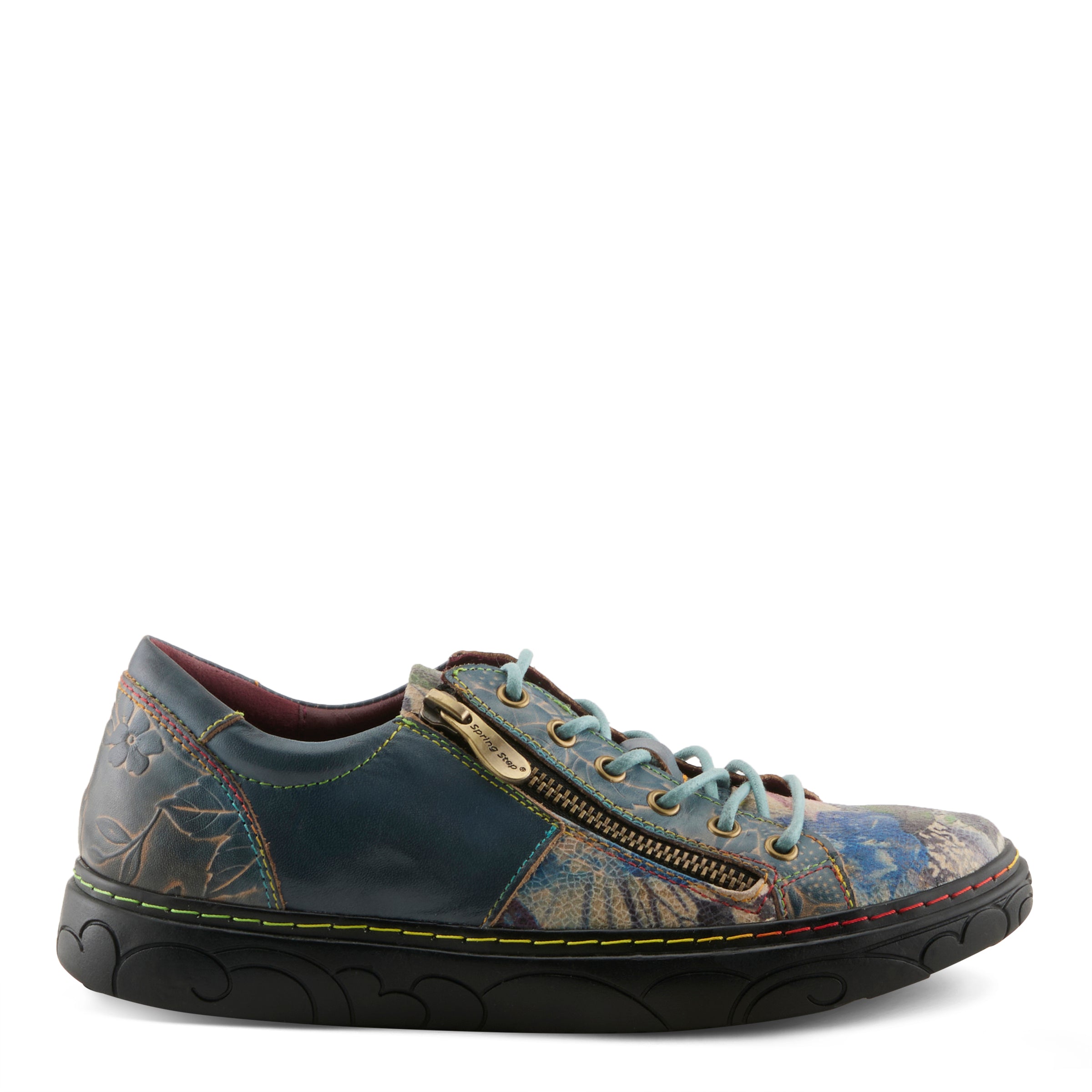 French inspired zippered sneaker like casual, featuring premium leather, both hand-painted and embossed, with metallic rose printed textile accents. Adjustable metal eyelet lace-up closure with lace keeper, vibrant rainbow stitching, and a super padded comfort collar and removable footbed all on a flat, bear embossed sculpted flatform edged in rainbow stitching.