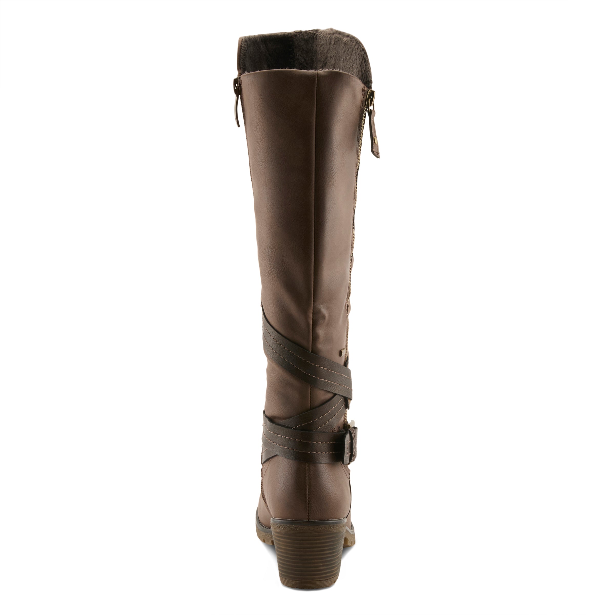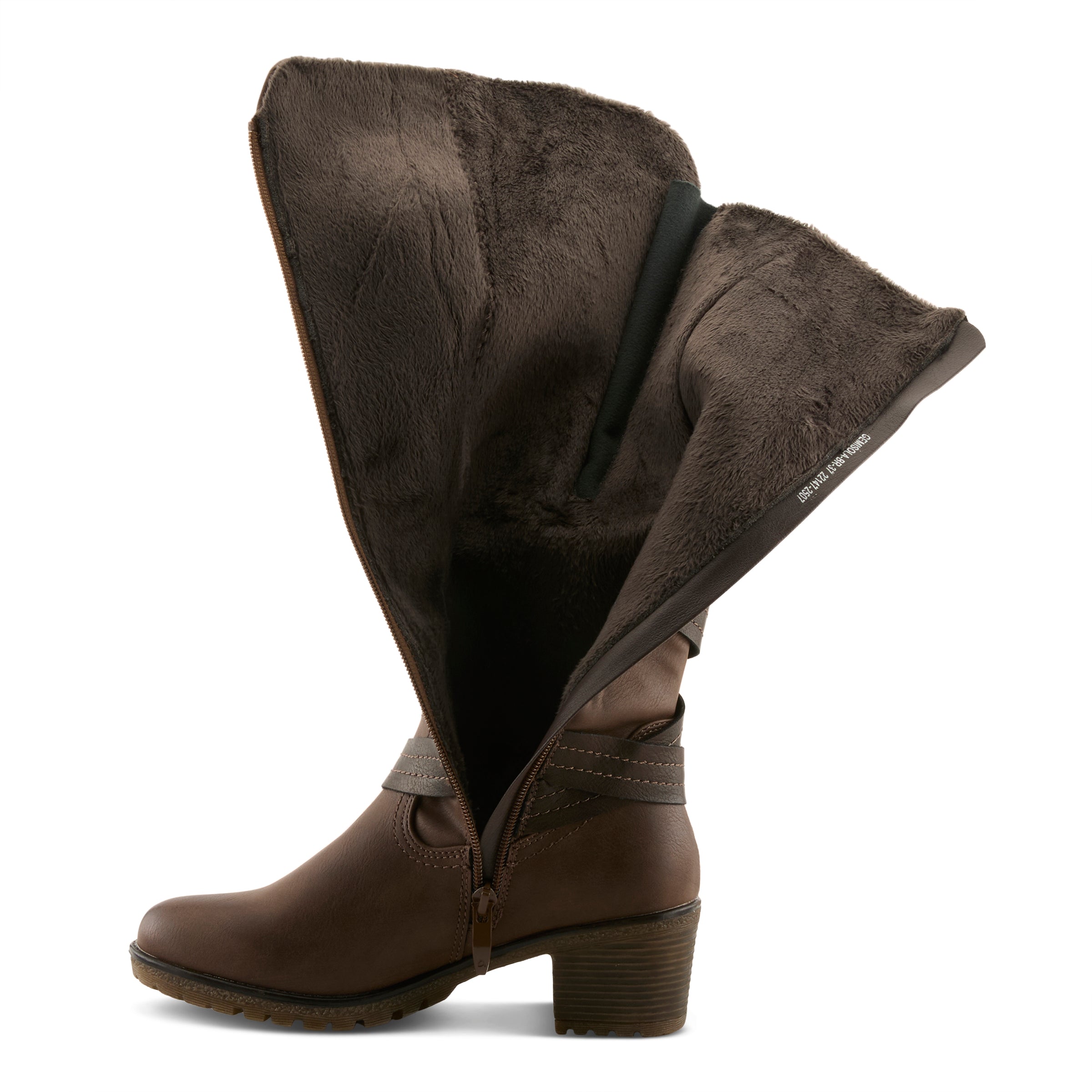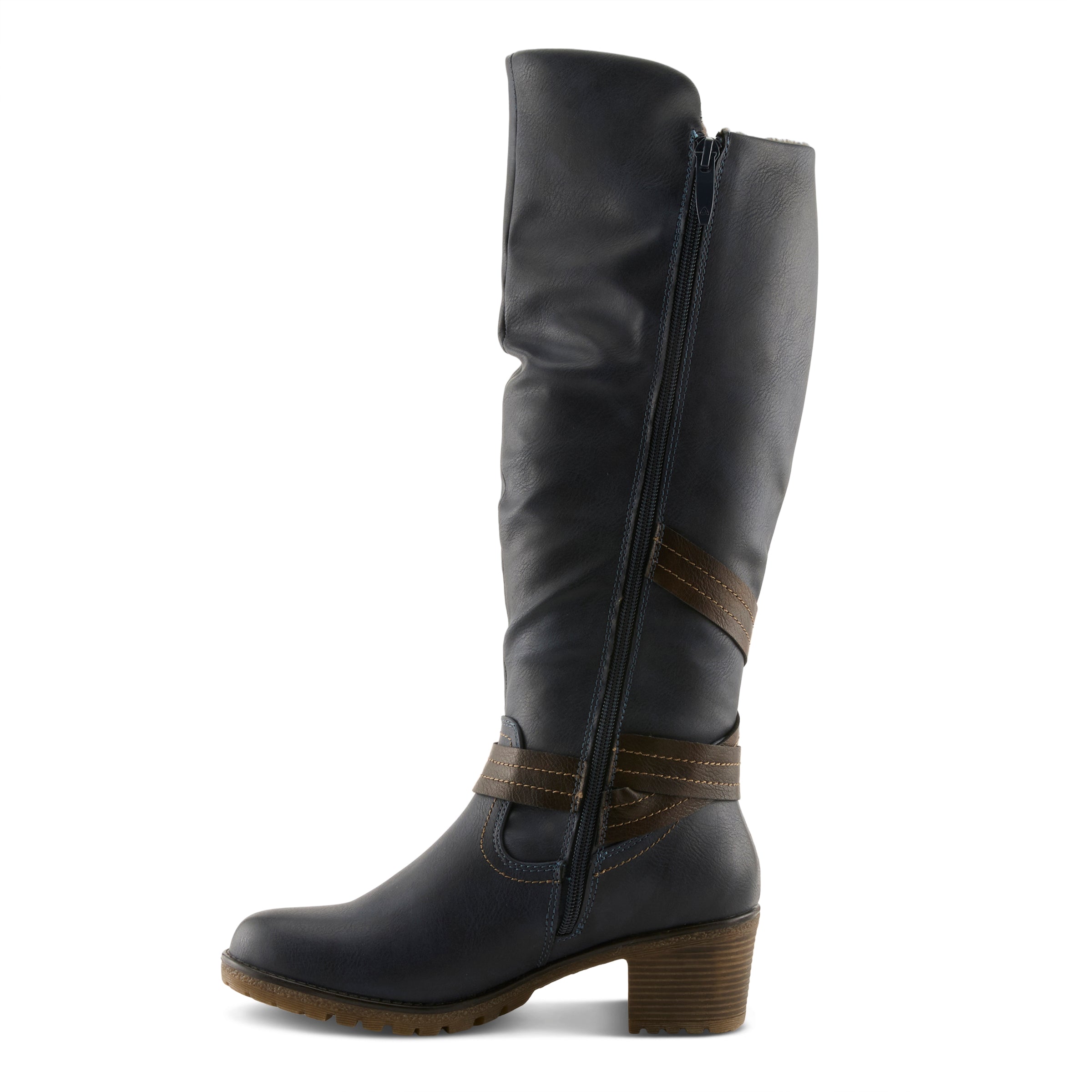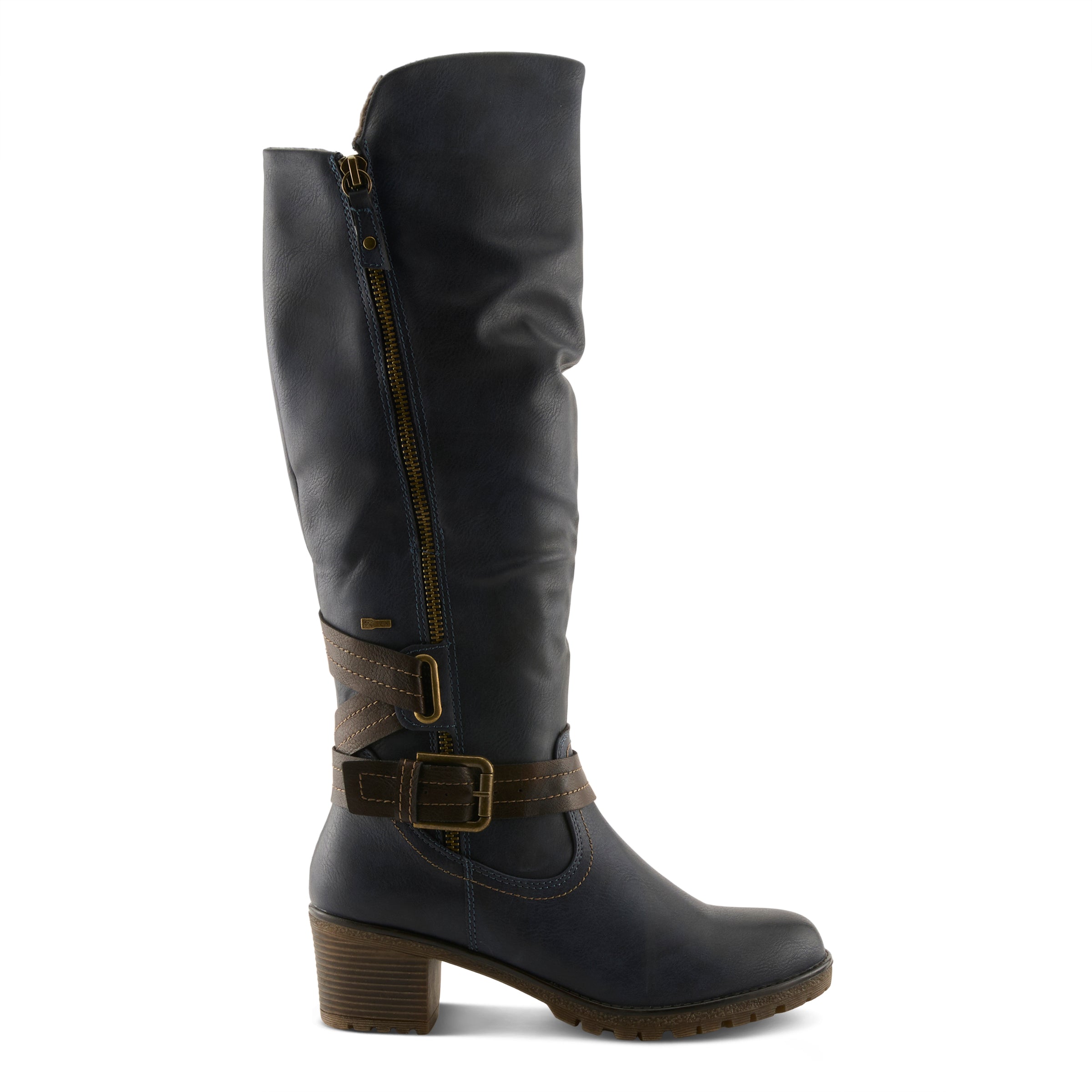 Experience the comfort revolution in this water resistant manmade leather pull-on tall boot featuring a lateral (outside) zipper for an expandable calf and a decorative ankle strap design all on a chunky and sculpted heel.