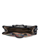 Enjoy these deliciously soft and structured silken leathers of this zip top 3 compartment tote, with a colorful, earthy hand-painted picturesque sunburst, partially peeking out from behind an abstract landscaped mountain range and an eclectic horizon. Solid hand painted midnight navy back featuring a secret vertical half width zipper pocket compartment, and interior space that opens wide to quickly access your desires with dual contrast leather trimmed pouches, an opposite wall zip compartment and center full length safety compartment for all your every day and travel necessities.