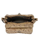 Fabulous 2 tone hand painted Fleur-de-lis embossed design on an oversized glossed full grain leather satchel. Full width magnetized front flap with antique pewter twist buckle, back zipper pocket for close to the body safety, protective metal feet, and convertible hidden inside straps to keep sides cinched or opened up wide- you get to choose! Also choose whether to wear hand-held or over the shoulder with our matching removeable and adjustable leather strap with double keepers. Inside boasts large central storage for laptop or smaller carryalls, with an additional open zip top compartment, double wall pouches and opposite wall zipper pocket. Protective cotton storage bag. Imported.