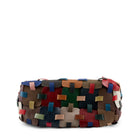 Genuine leather 3" multi colored squares are all over looped and attached with contrasting leather strips from top to bottom/ front to back. Each unique and colorful tote can be worn hand held with adjustable canvas backed flat leather straps or cross body for hands free convenience with our adjustable and removable leather/canvas combo'd shoulder strap. This large supple leather bag immediately molds to the contours of your body and will be a welcome addition in your daily life and the perfect carryon for your plane, train and auto trips as well. Zip top single compartment with inside wall and zipper storage pouches for easy access to smaller items.