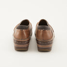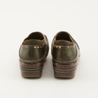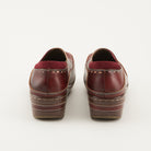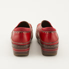 Hand painted, closed-back, leather clog with elastic piecing and contrast embossed floral design.