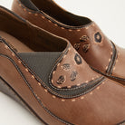 -Round toe, hand painted leather, elastic side inlay, contrast stitch detail, leather pieced heel.
