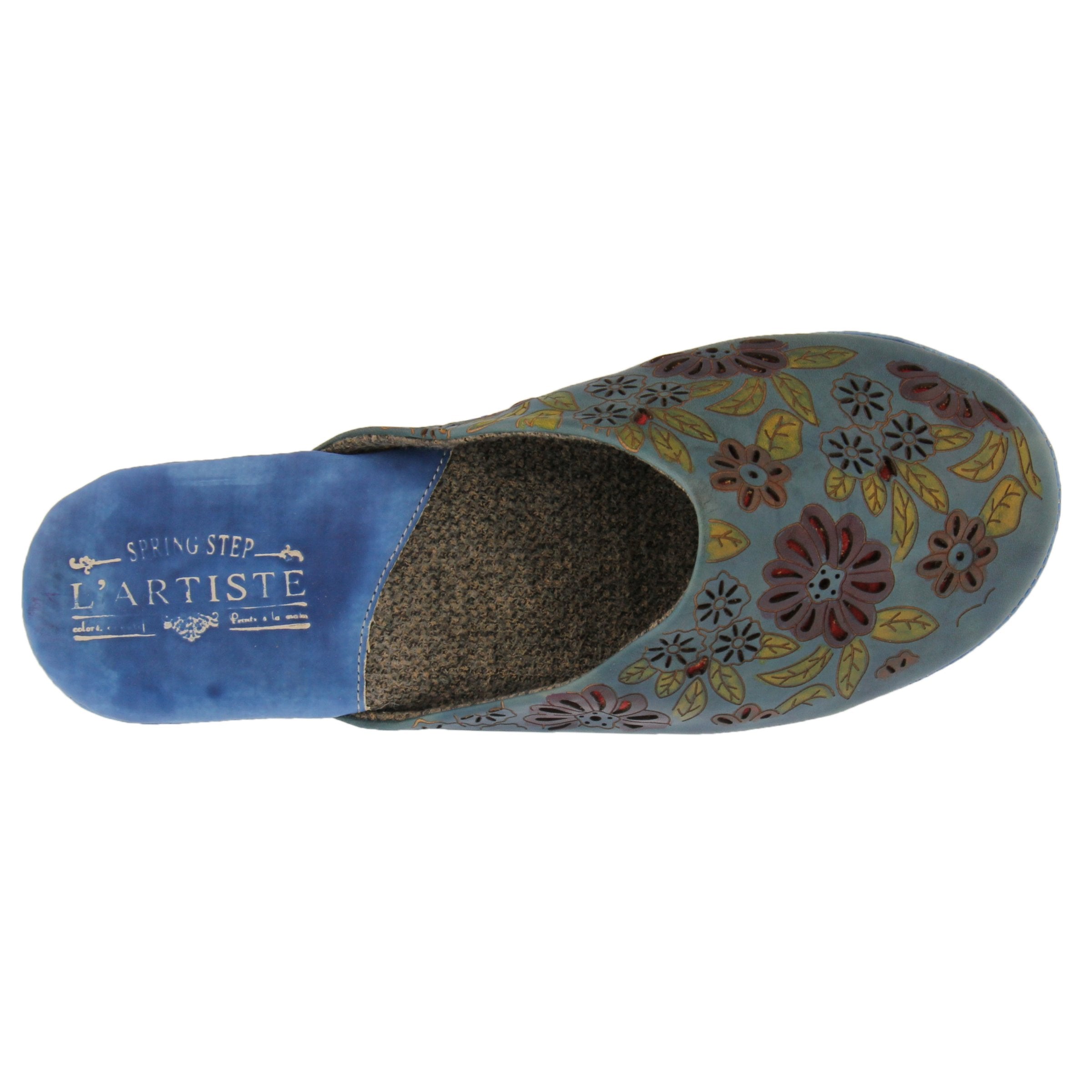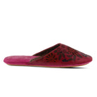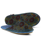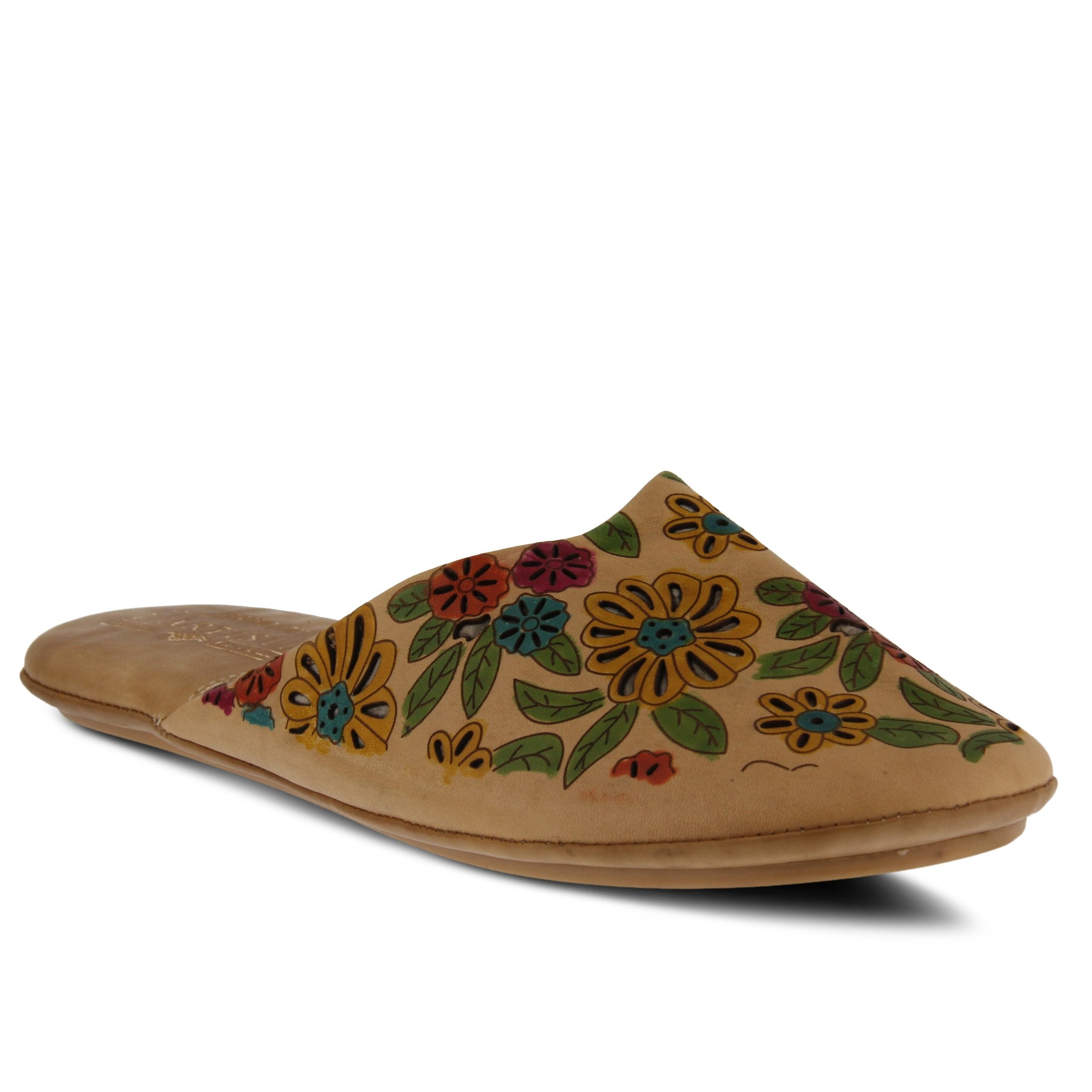 French inspired, hand-painted leather scuff-style slipper with matching hand-painted leather travel case featuring floral laser etching and cutouts.