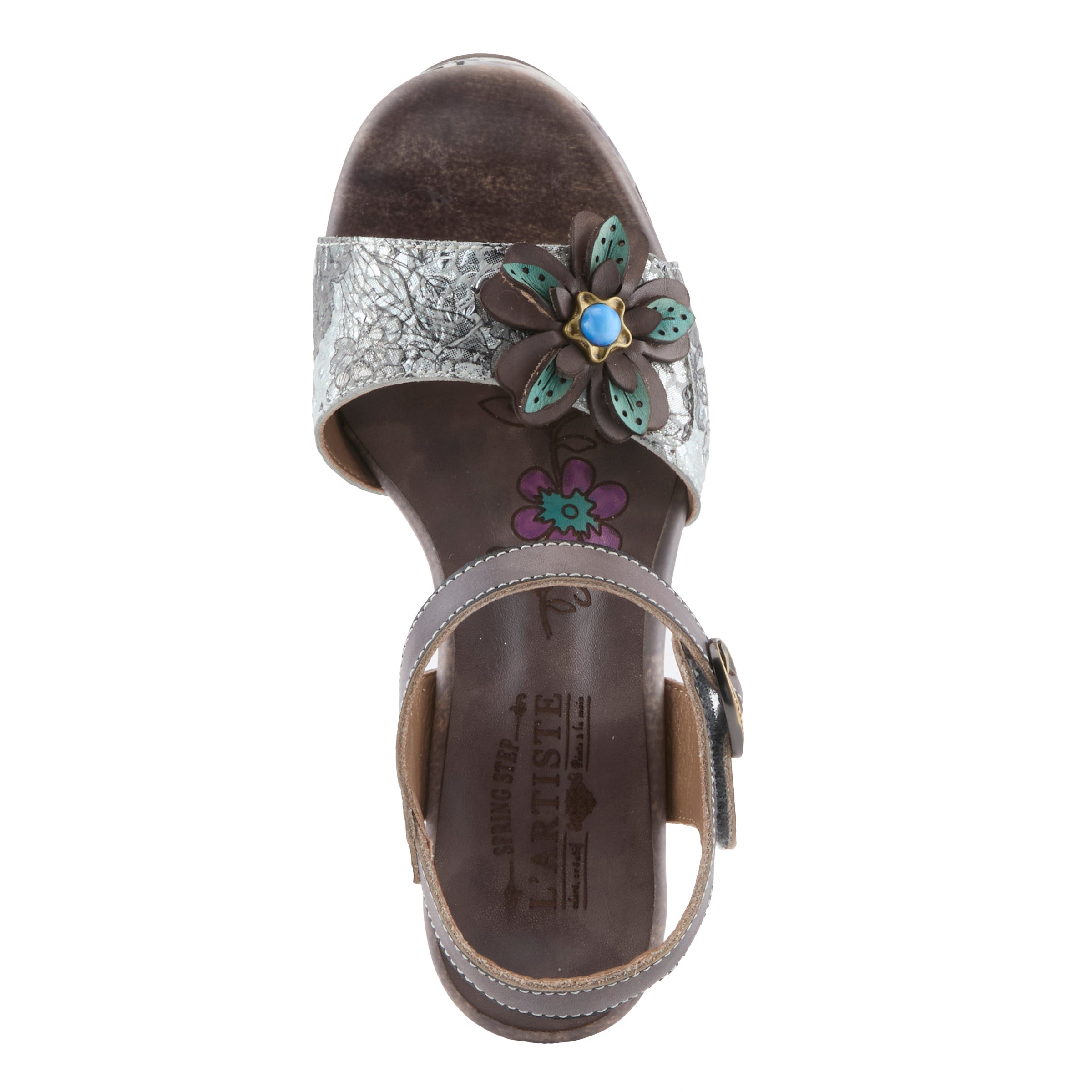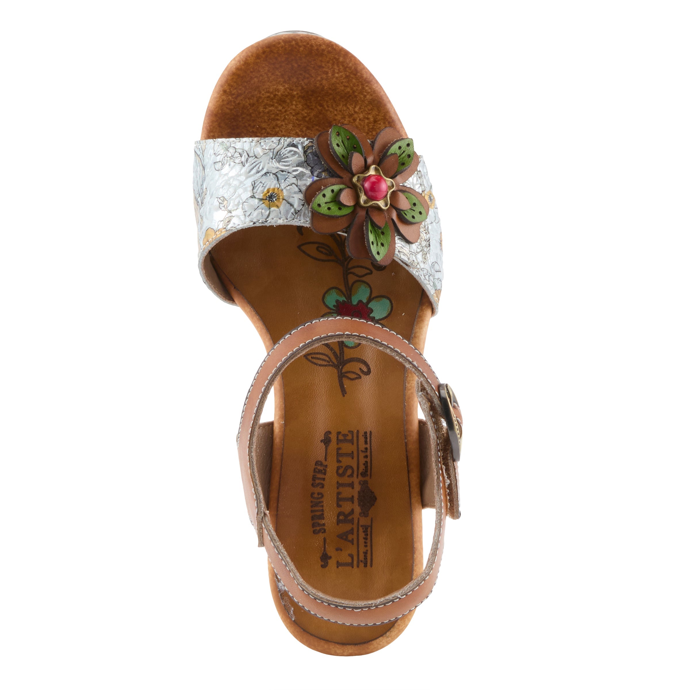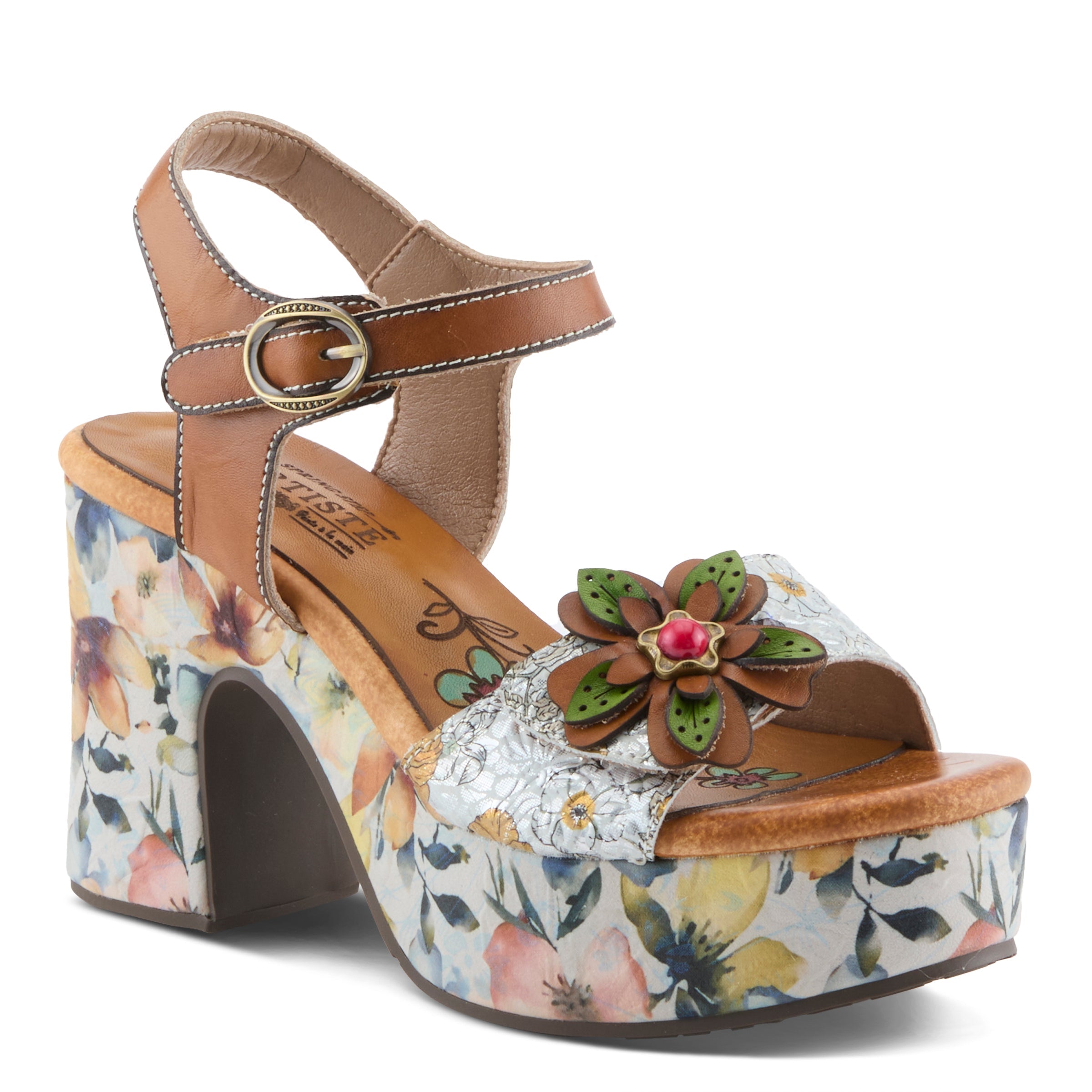 Fresh, bold, and undeniably expressive, this platform sandal transforms the classic silhouette into a wearable piece of art. Designed for the woman who loves color, movement, and texture, its hand-painted leather shines with vibrant personality. Multi-layered floral accents with metallic-style centers create a sculptural effect, while the floral-wrapped midsole and platform make every step feel dynamic. The 4" block heel is balanced with a 1 ½" platform, giving you stylish height without compromising comfort. An adjustable backstrap ensures a secure fit, while the cushioned insole offers just the right amount of softness.