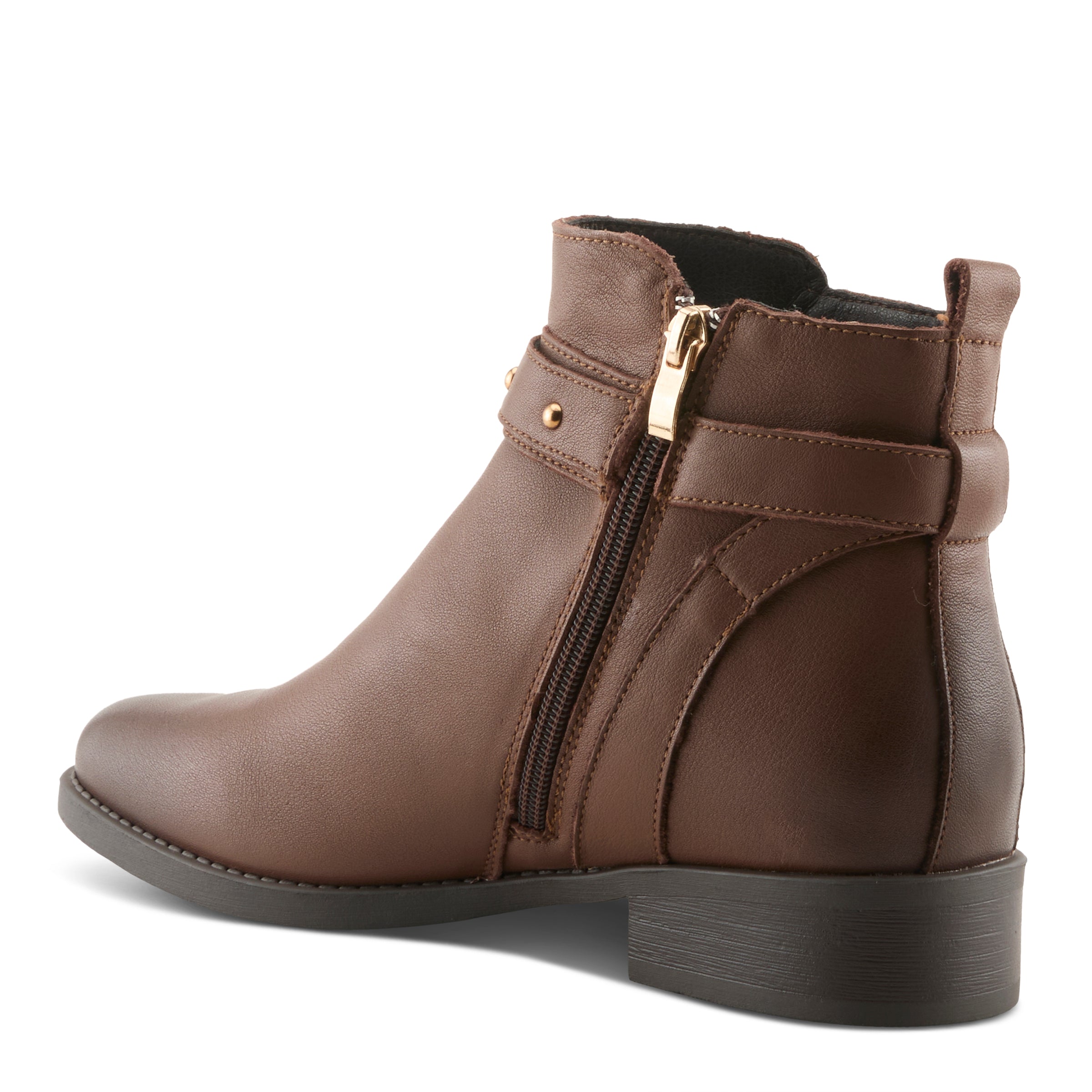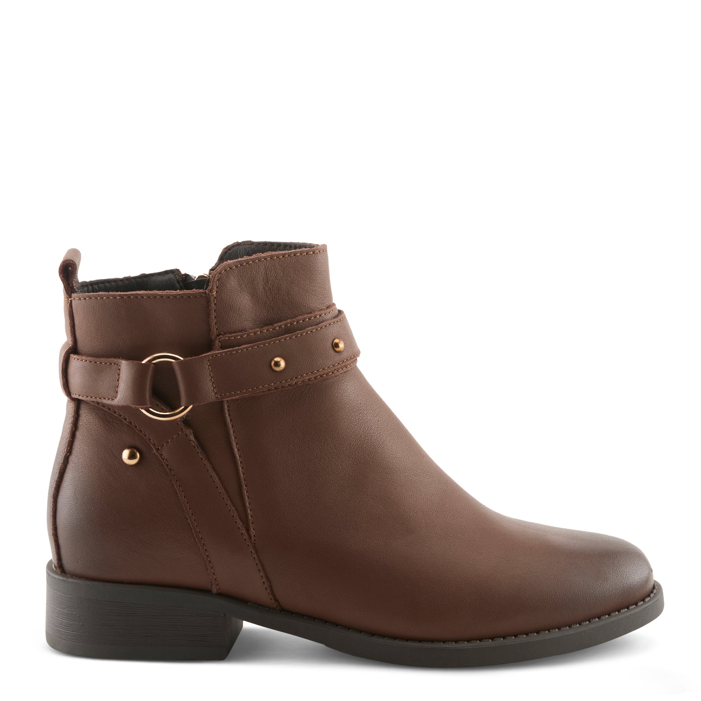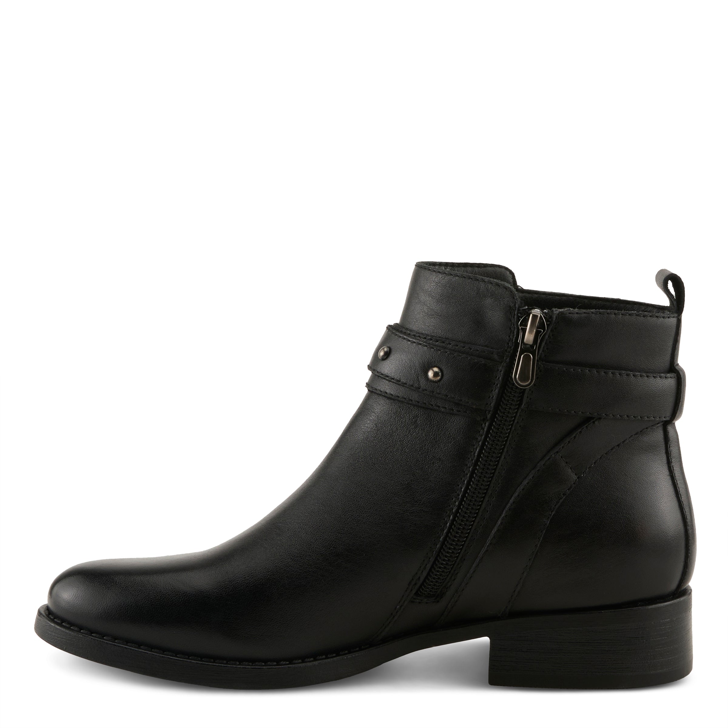 INDI COLLECTION - Elevate your look with a sleek and sophisticated bootie crafted from premium leather for a timeless appeal. Featuring a studded belt detail with metallic accents, this bootie adds an edgy yet refined touch to your wardrobe. The front burnishing enhances its rich texture, giving it a subtly worn-in look. Designed for both style and comfort, it sits on a sculpted low heel, providing stability and effortless elegance. Perfect for dressing up or down, this versatile bootie pairs beautifully with jeans, skirts, or dresses for a polished yet modern aesthetic.