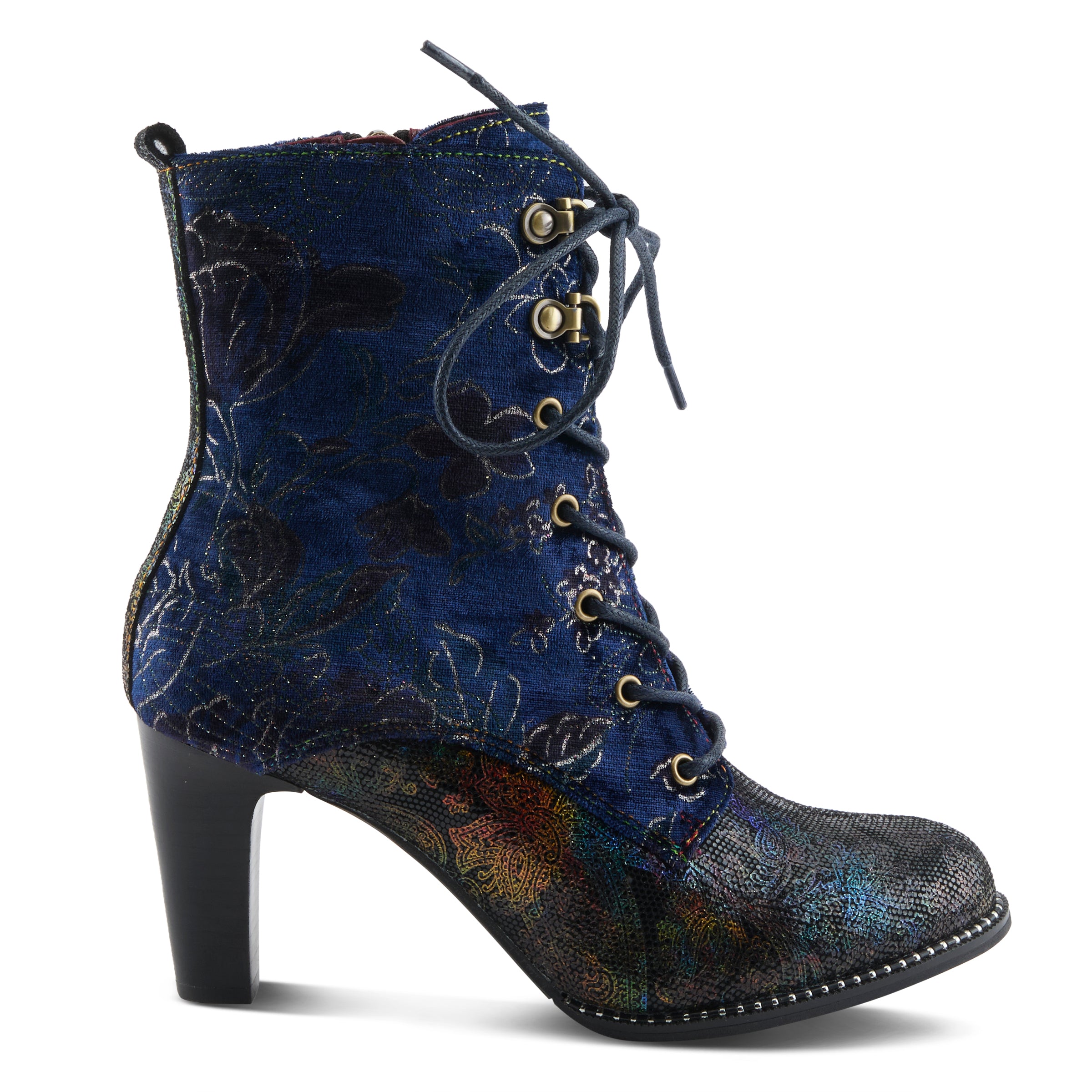 Make a statement with this breathtaking baroque-inspired lace-up boot, a fusion of old-world elegance and modern edge. Crafted with a luxurious suede combo upper, it features intricate floral embossing, rich textures, and a touch of iridescence for a mesmerizing effect. The sleek, mid-height heel adds just the right amount of lift, while the cushioned insole ensures all-day comfort. A convenient inside zip allows for easy on and off, blending practicality with couture-level sophistication. Whether you're dressing up or adding an artsy touch to casual wear, this boot is the perfect fusion of bold and beautiful.