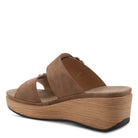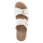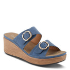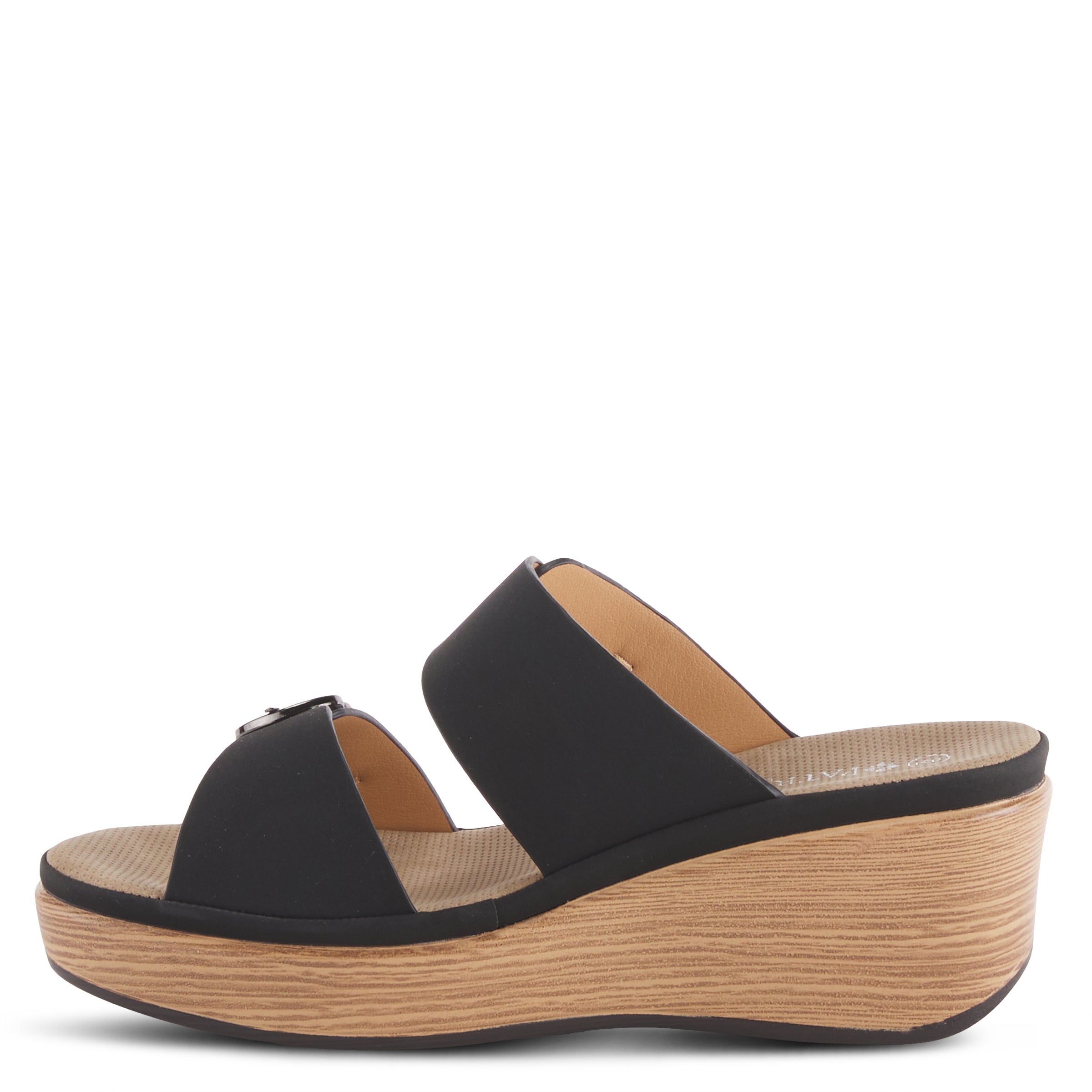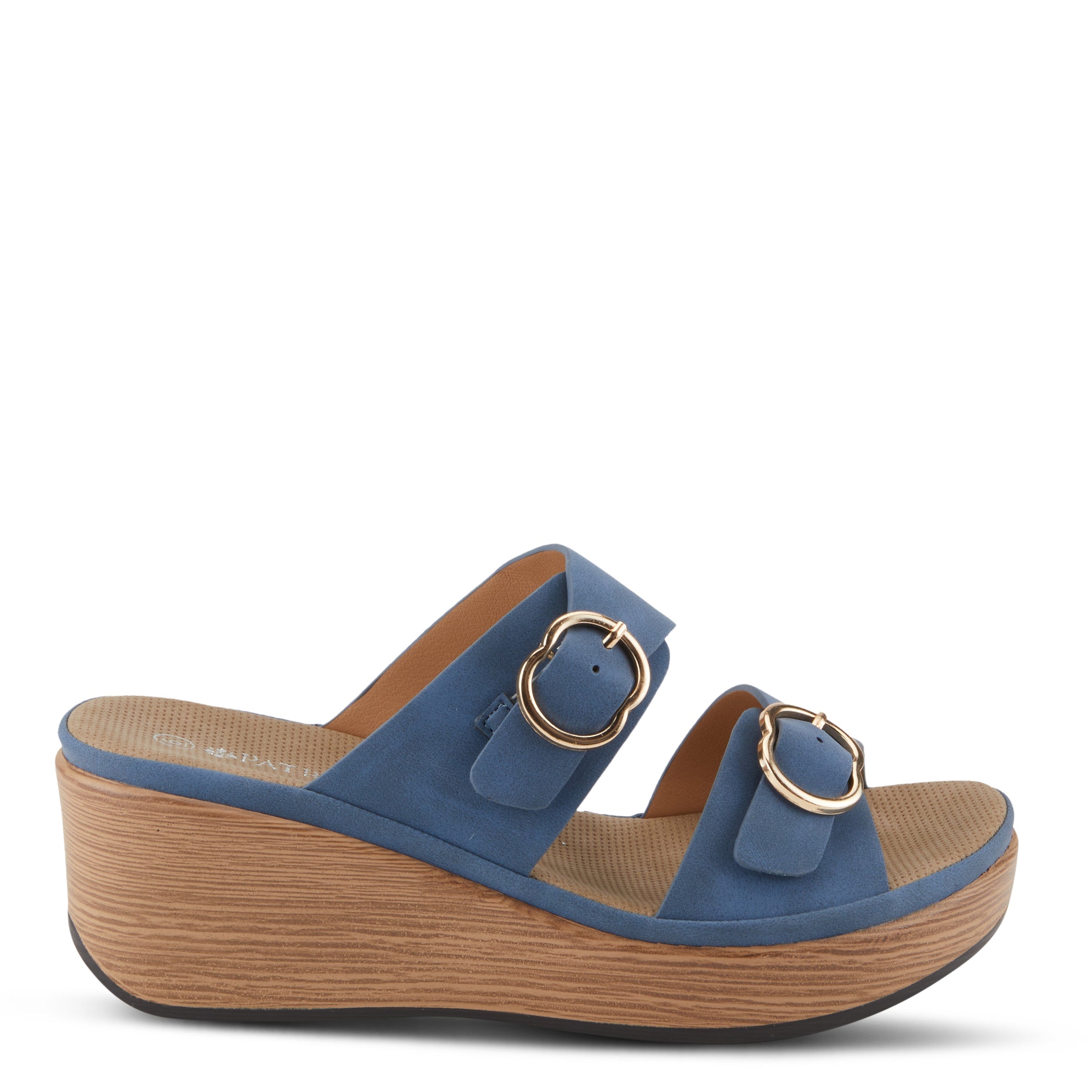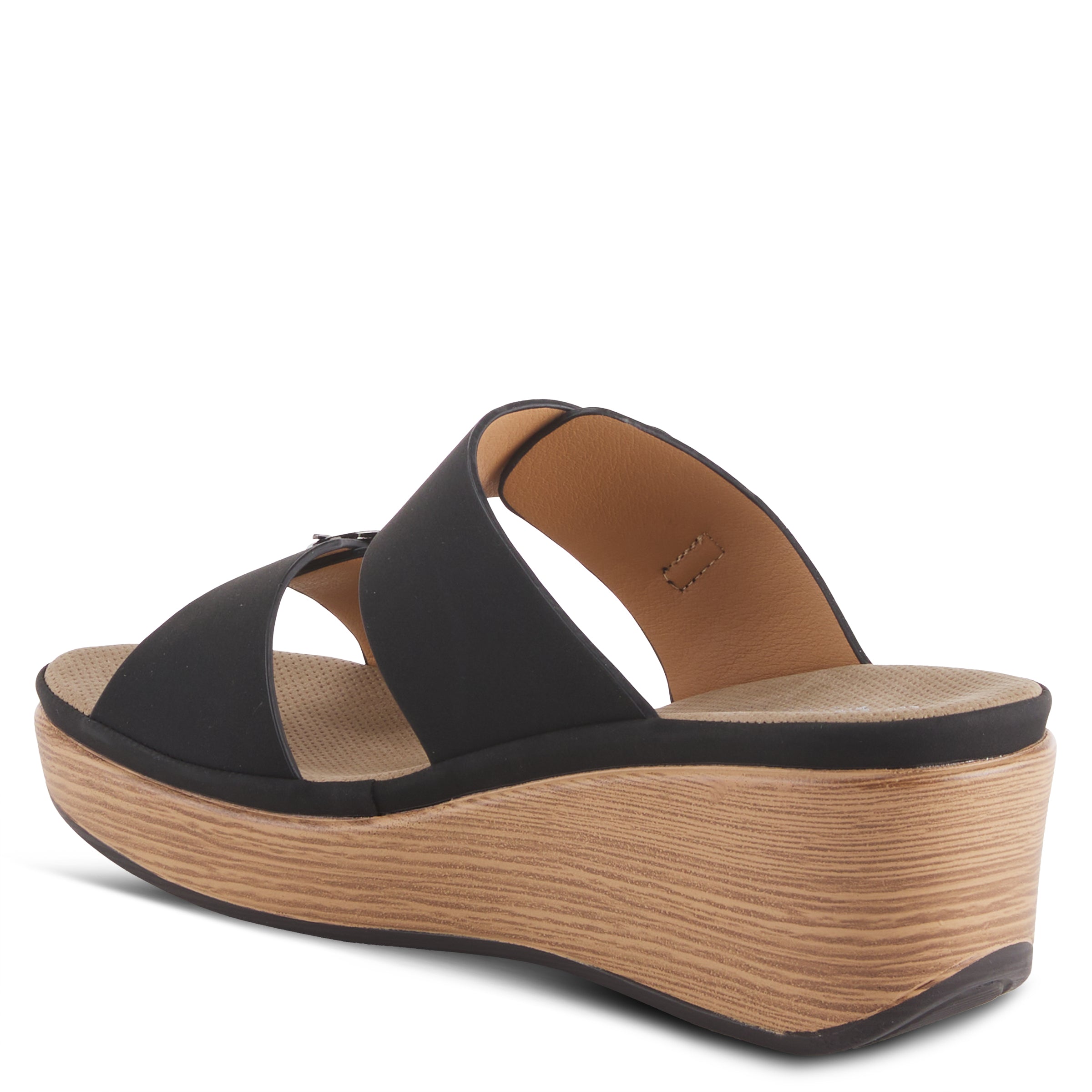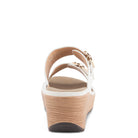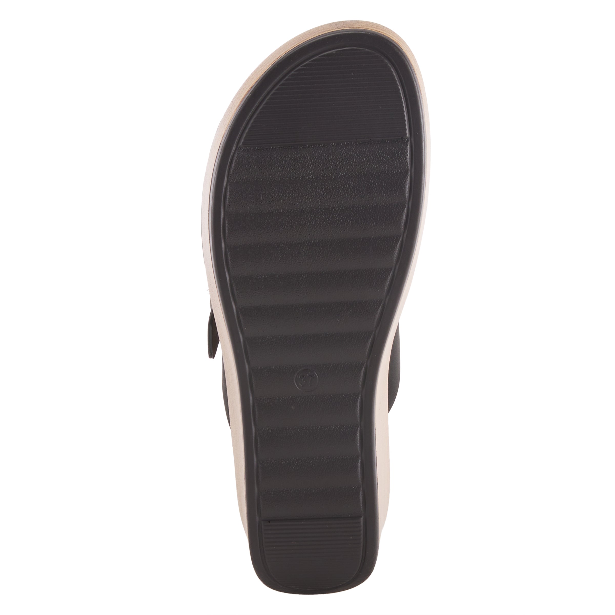 Chic platform wedged slip on sandal with double rounded buckles and straps on a padded insole to secure your foot and ensure long lasting comfort all day