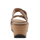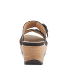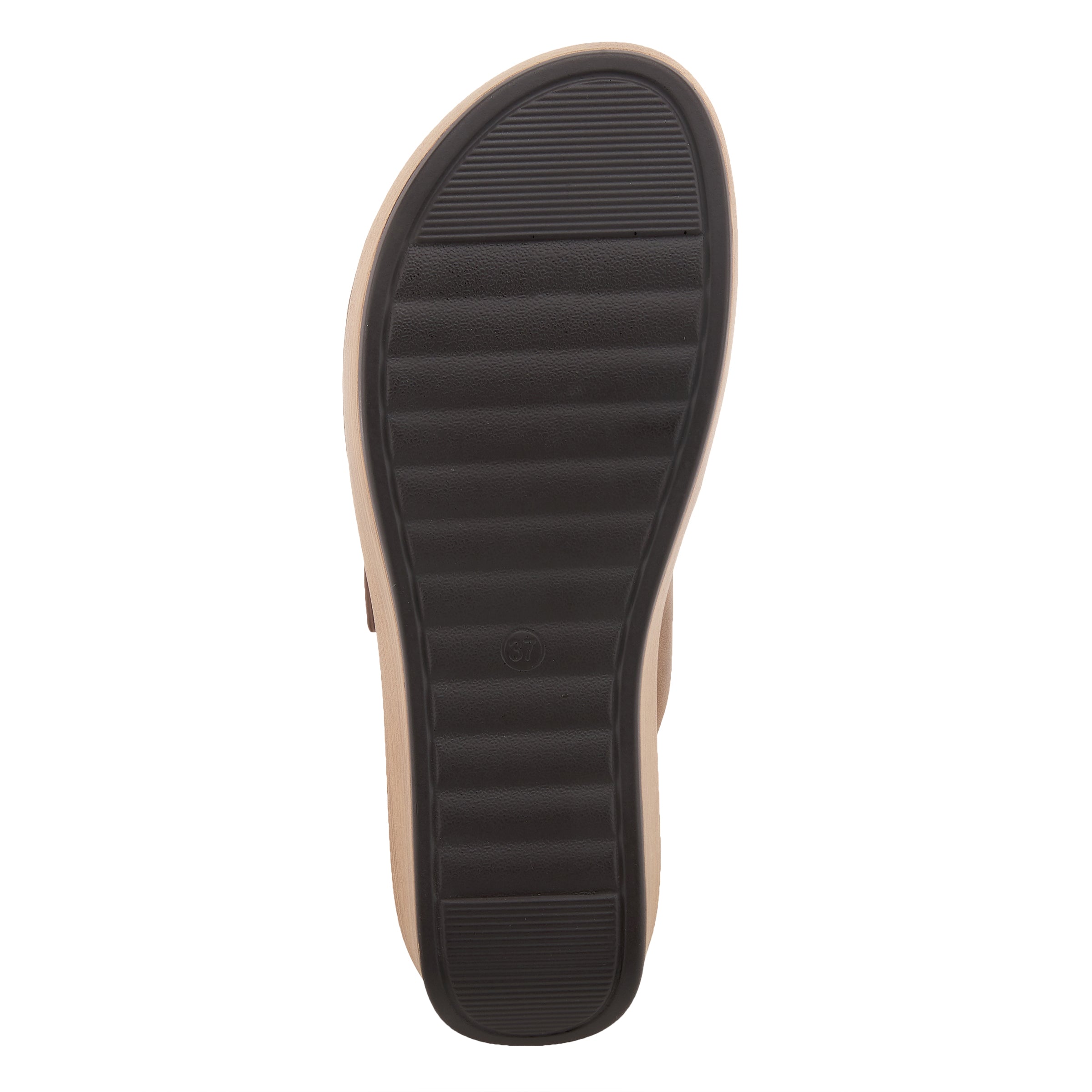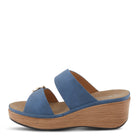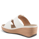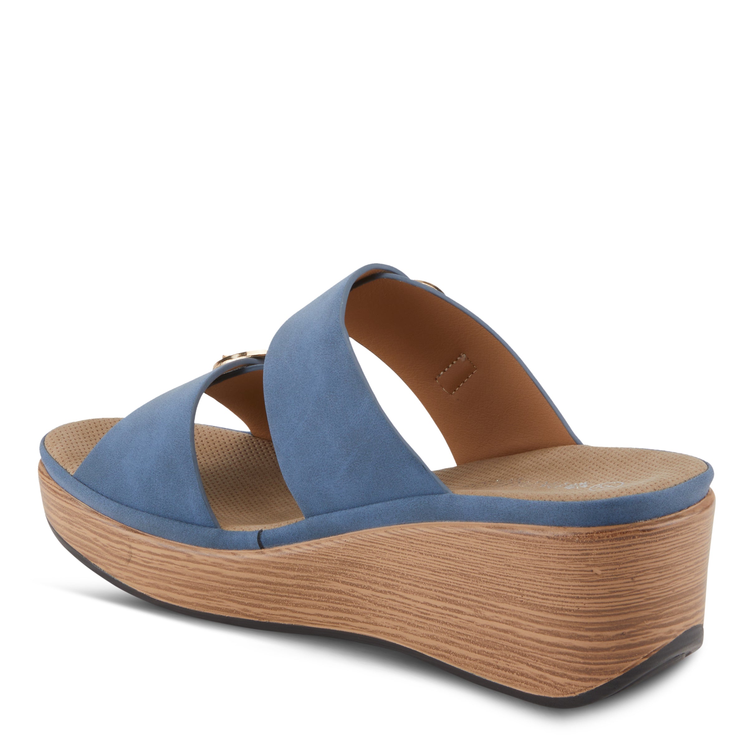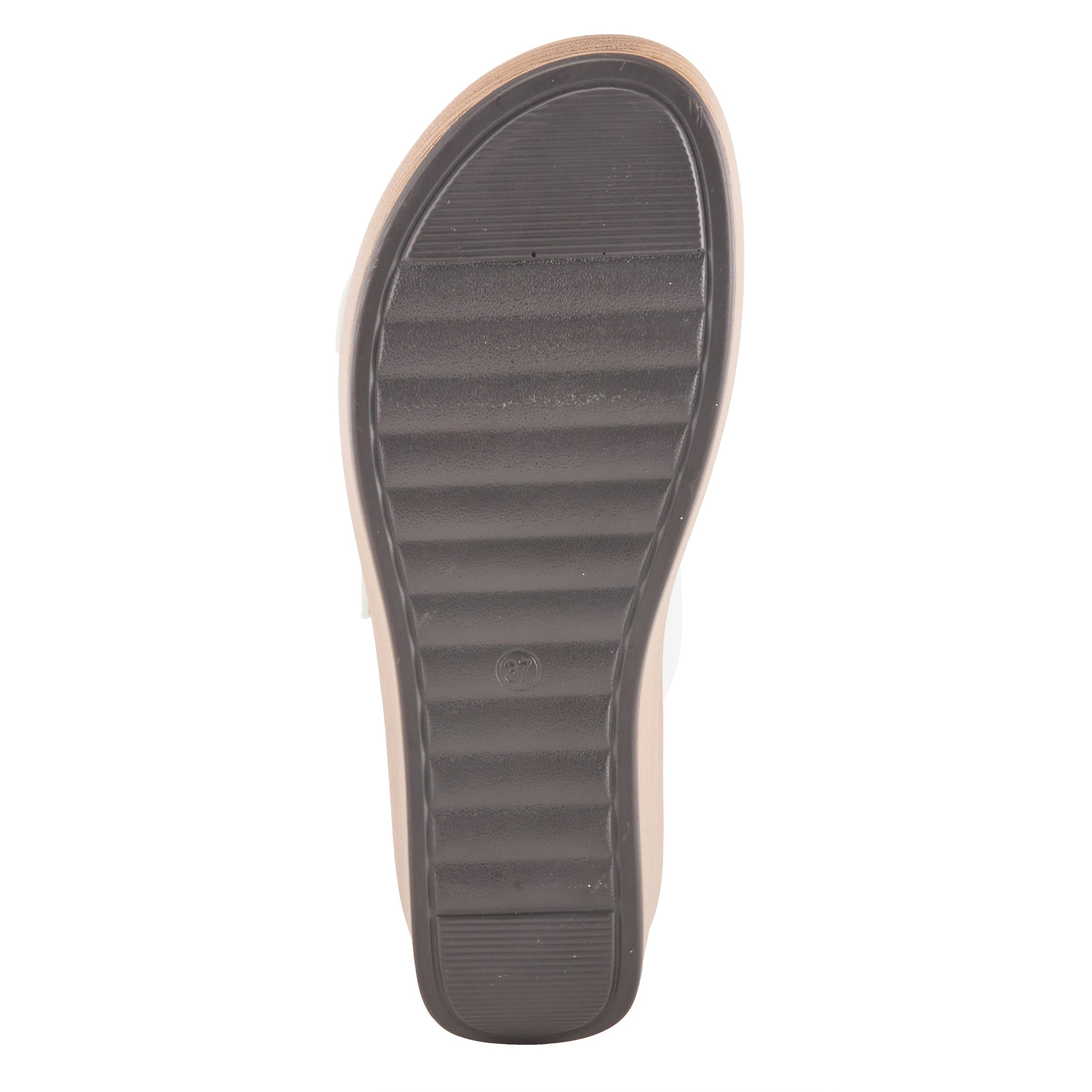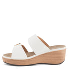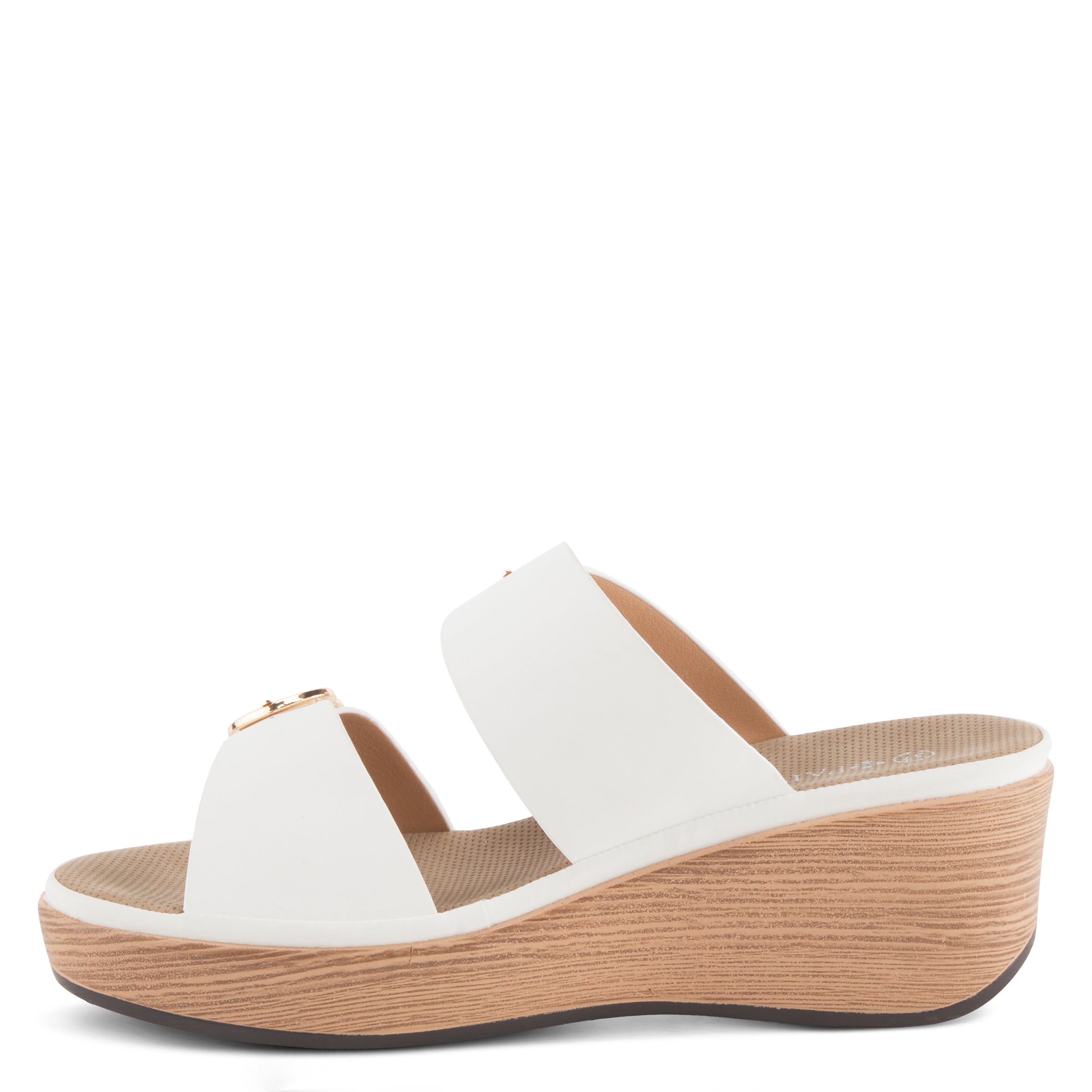 Chic platform wedged slip on sandal with double rounded buckles and straps on a padded insole to secure your foot and ensure long lasting comfort all day