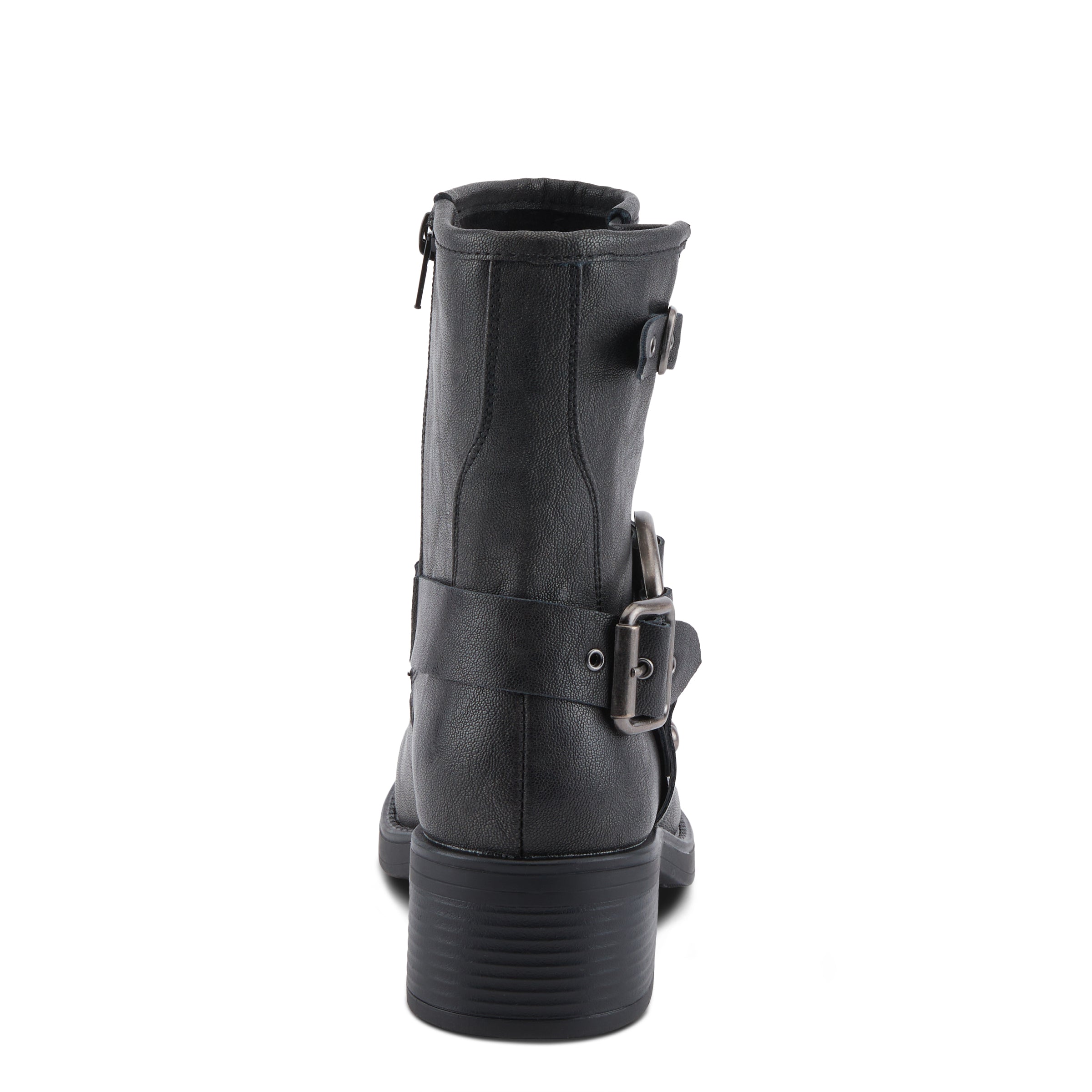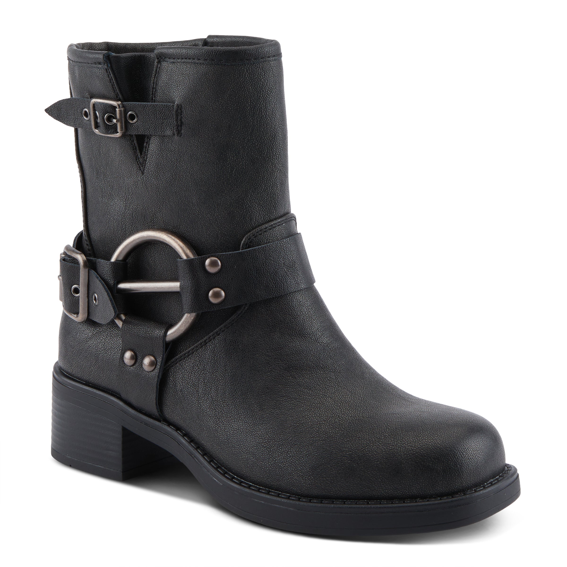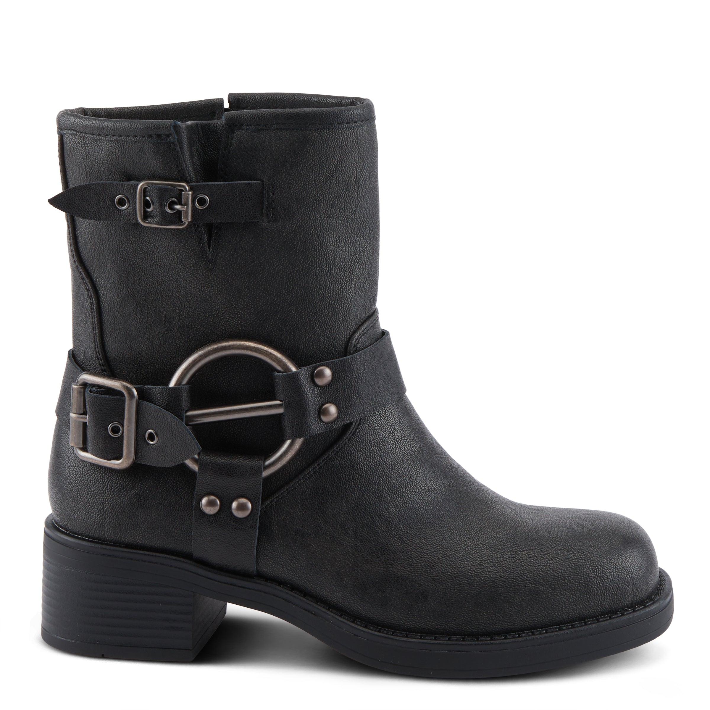 - Adorned with decorative straps held by an O-ring harness and rounded studs and the back strap with a functional buckle and metal eyelets, these boots exude rugged charm and stylish flair.