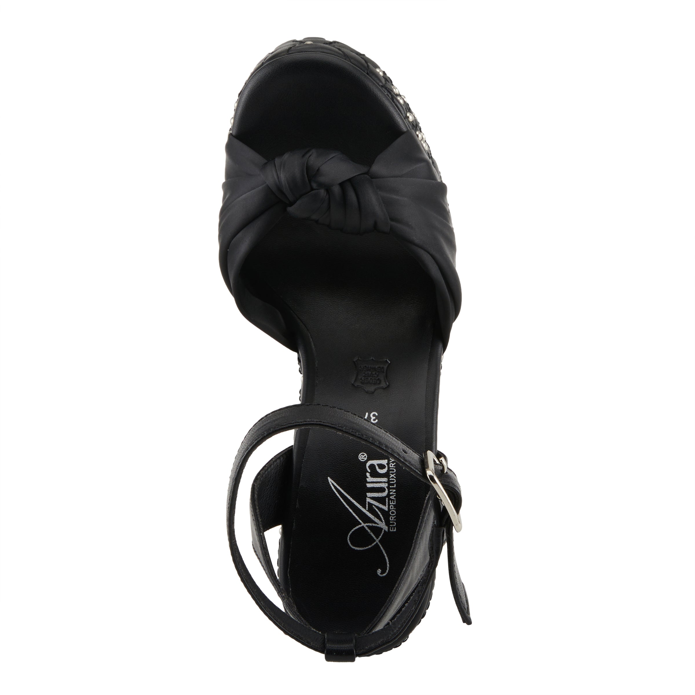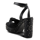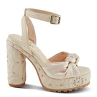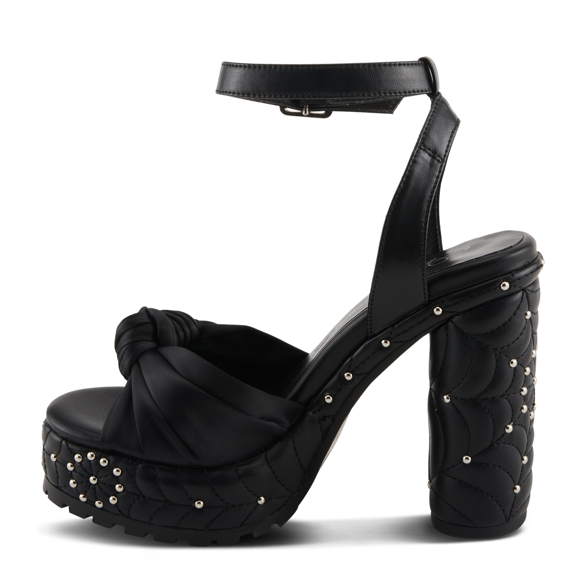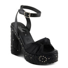 Befierce is not for the weak of heart! Makes a powerhouse statement as soon as you buckle her strong and sexy ankle strap in place. Leather wrapped heel and outsole with tonal spiderweb stitching and shiny silver studs featuring a soft knotted satin upper.