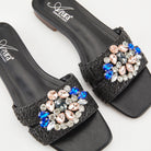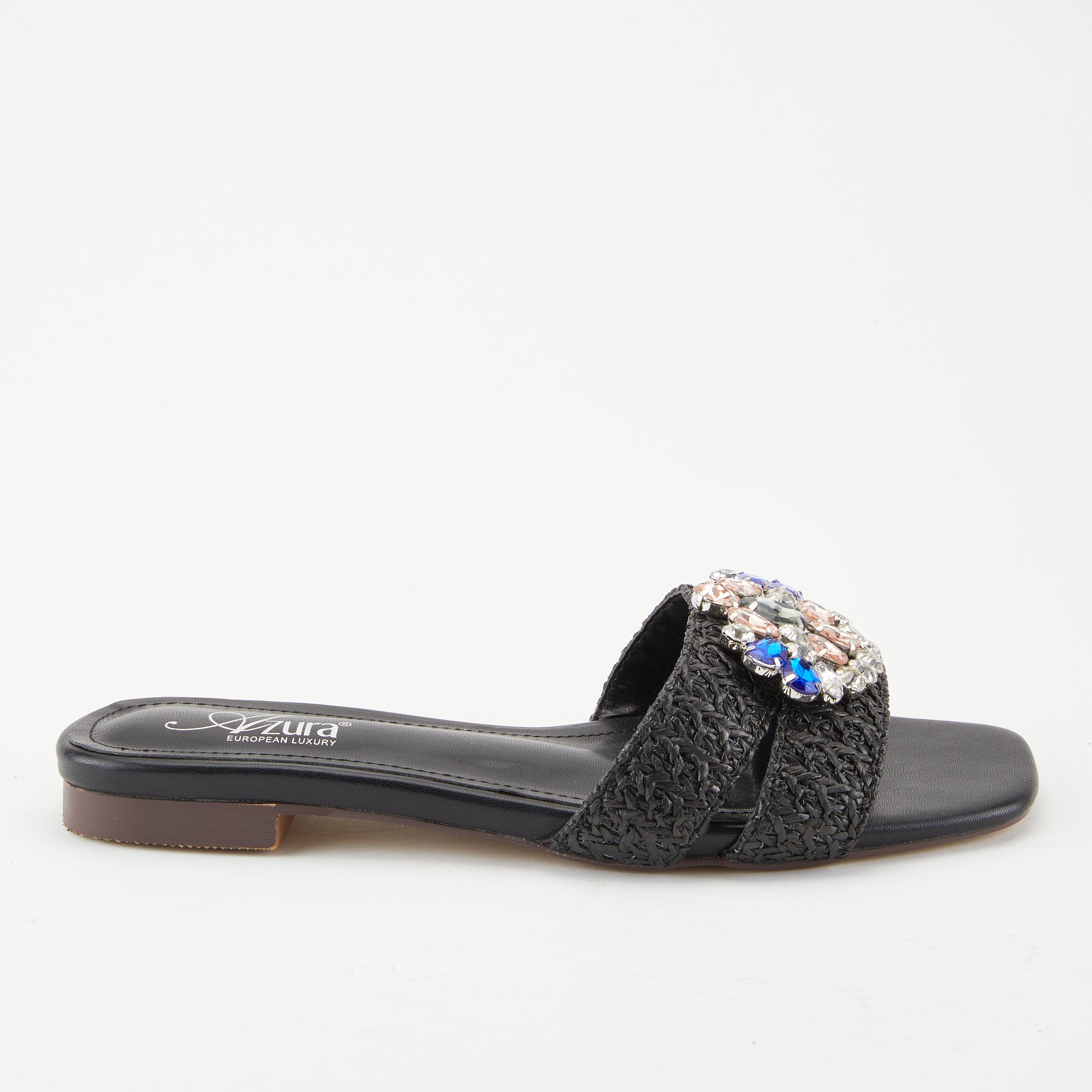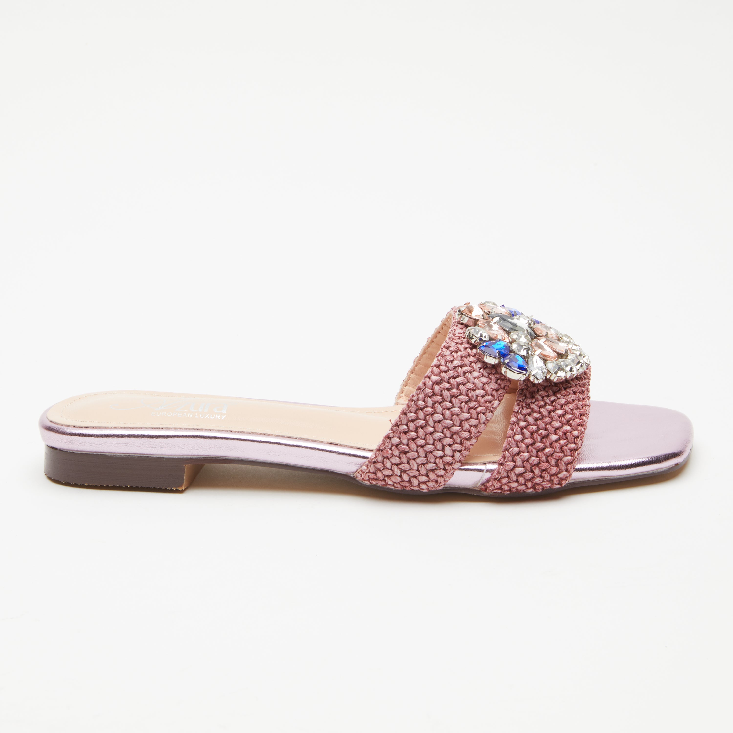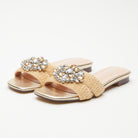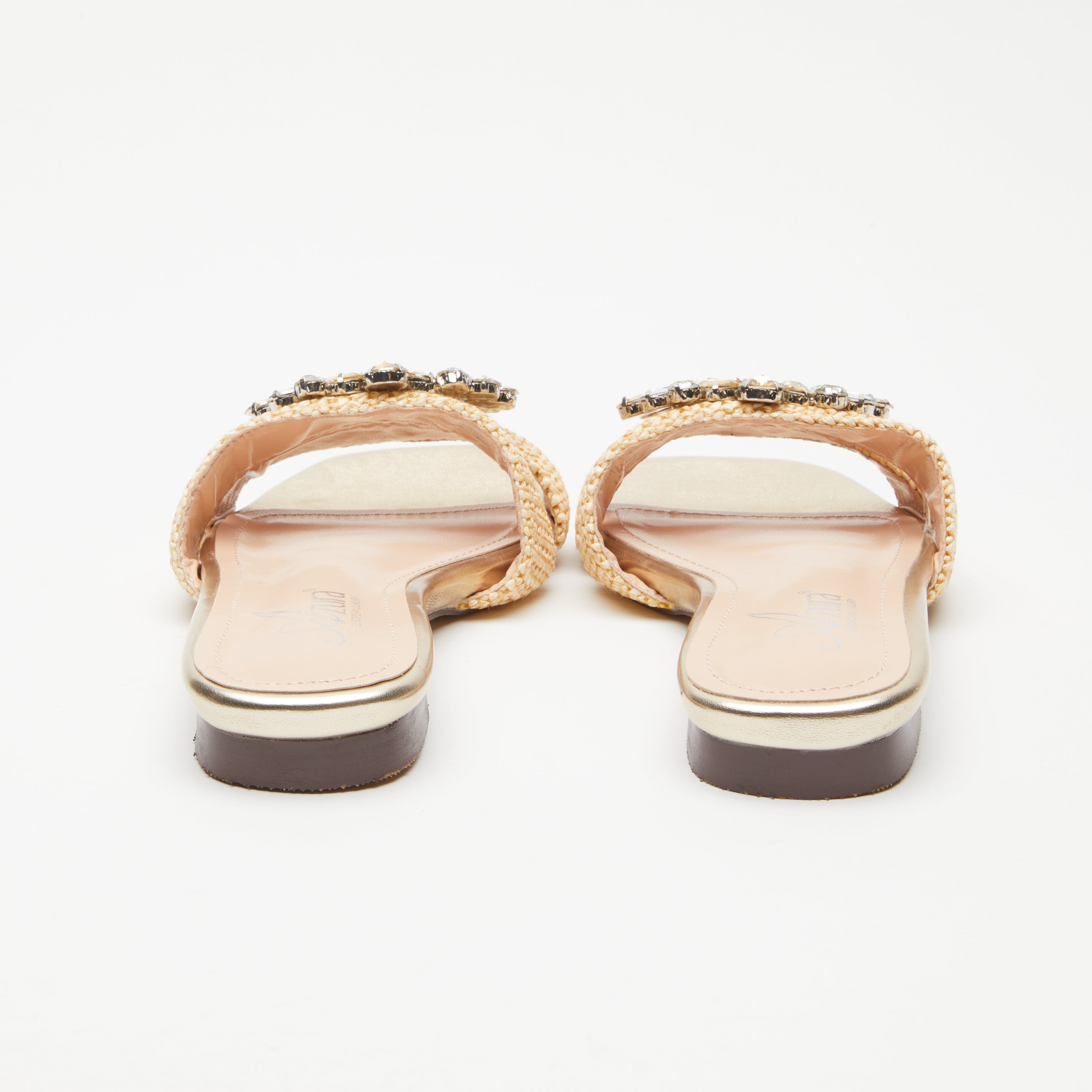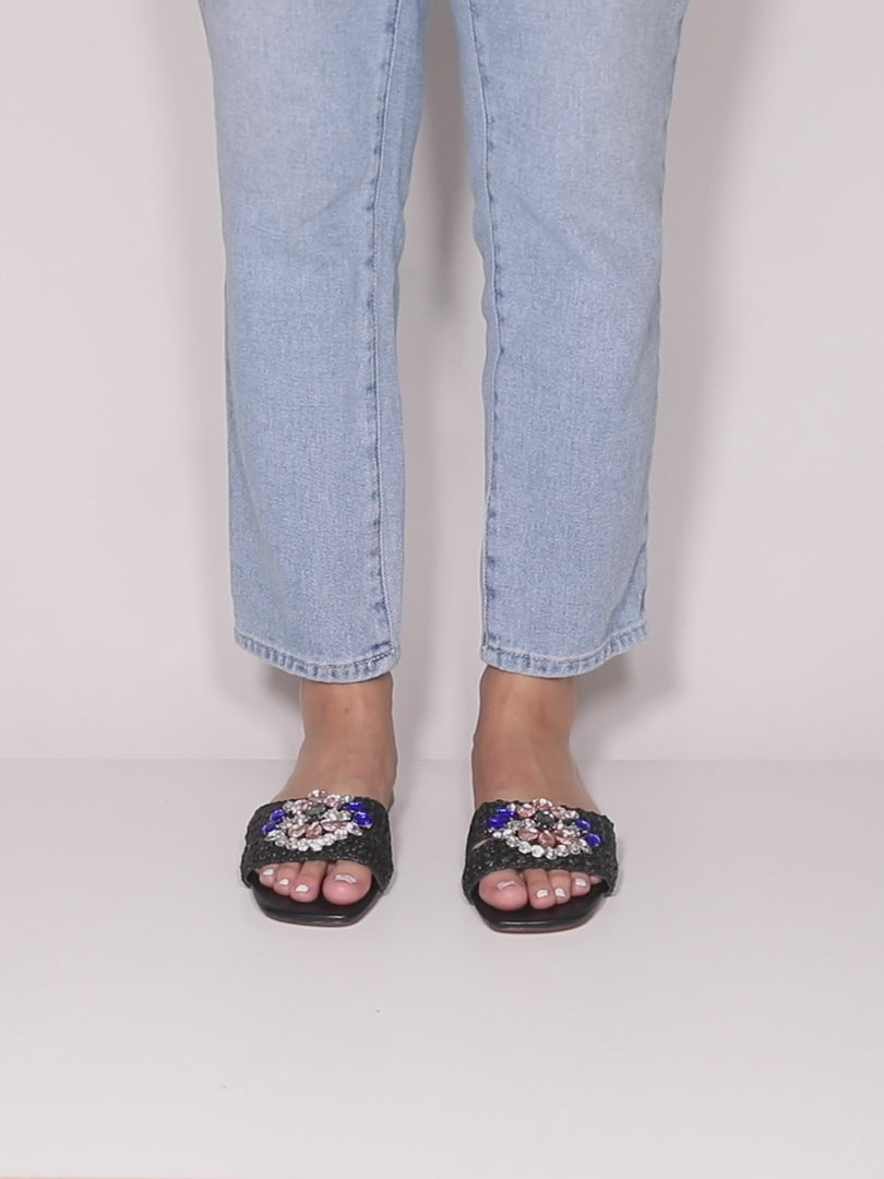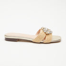 Slip into this mix of old Hollywood glamour with a bit of a southern sensibility with these slides. The dazzling jeweled brooch on top of a raffia strap make these sandals anything but boring.