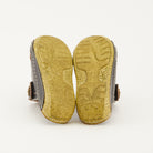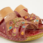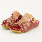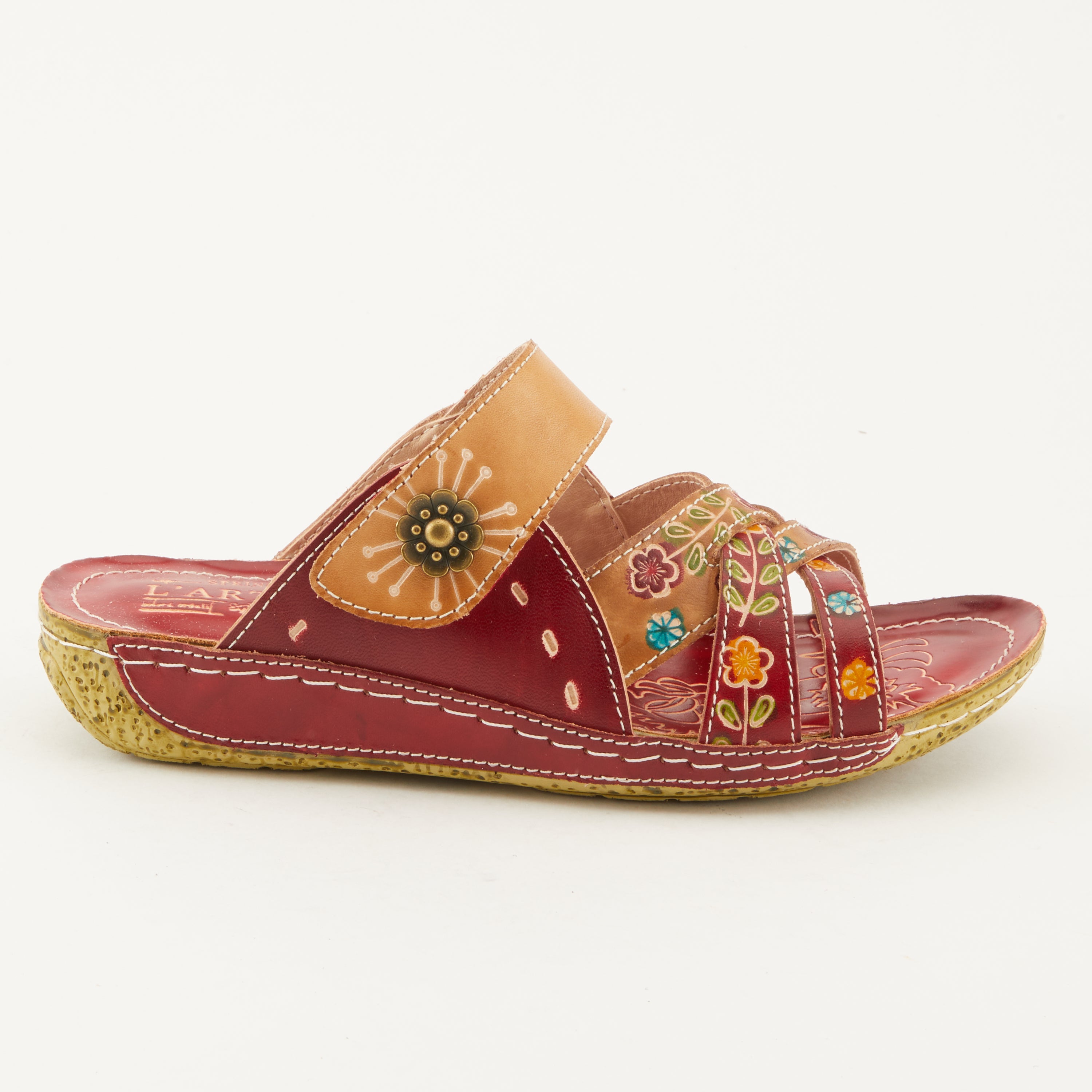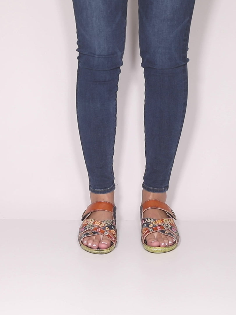 French inspired, hand-painted leather slide sandal featuring unique color blocking and colorful floral embossing design.