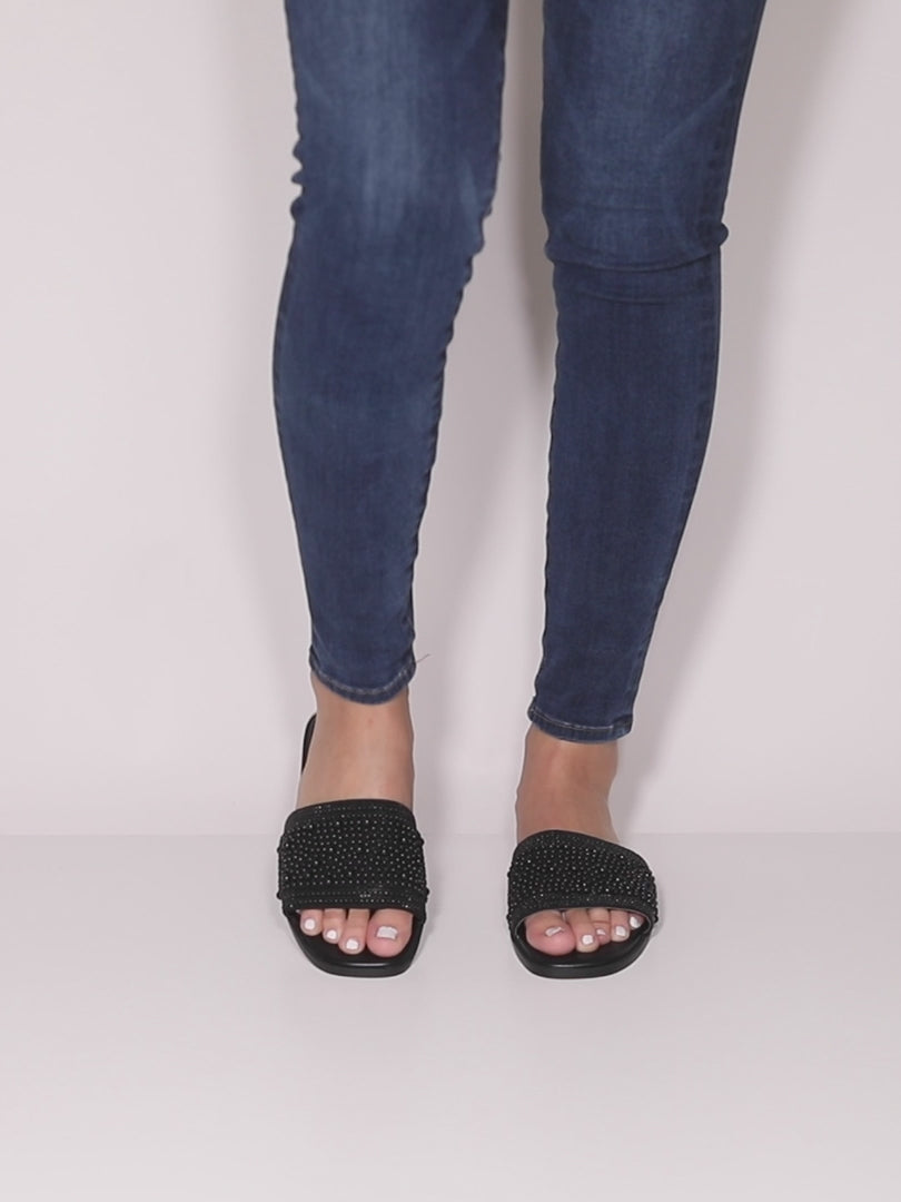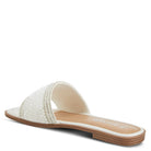 Flat slide sandal wrapped in delicate pearl beads on a padded footbed