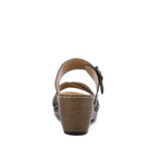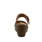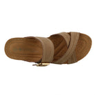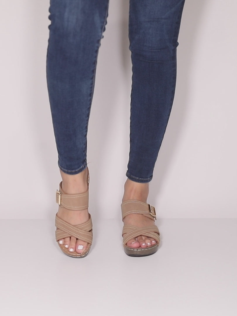 Trendy slide sandal featuring a beautiful criss cross toe band, dainty contrast stitchwork, and an adjustable buckle instep strap all on a nature-inspired comfort heel with a platform.