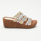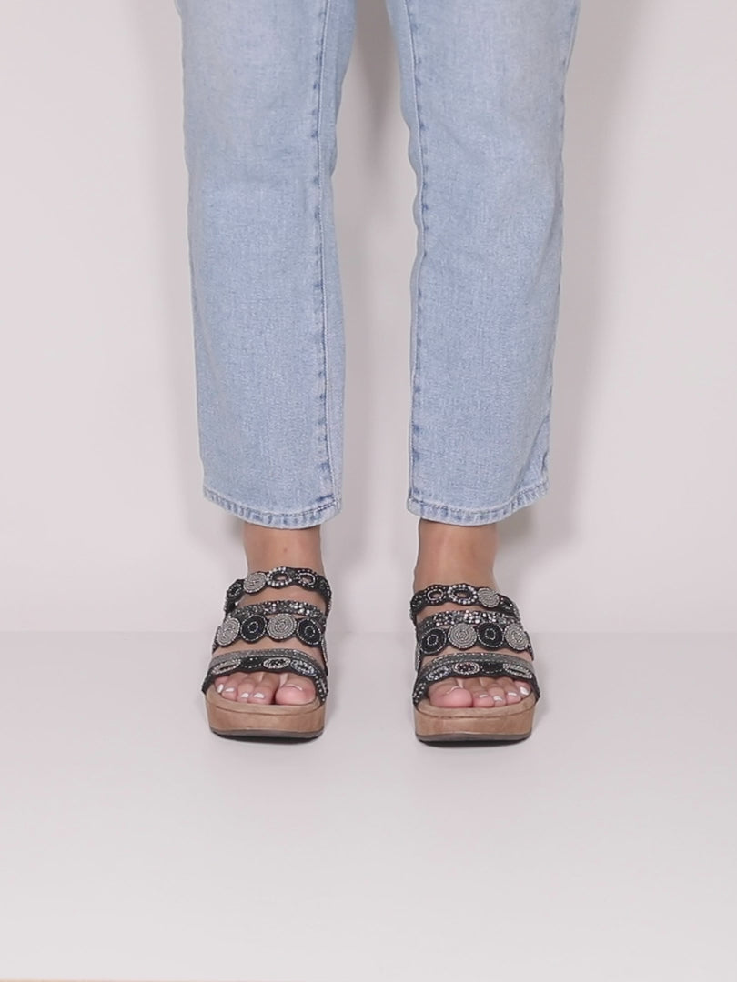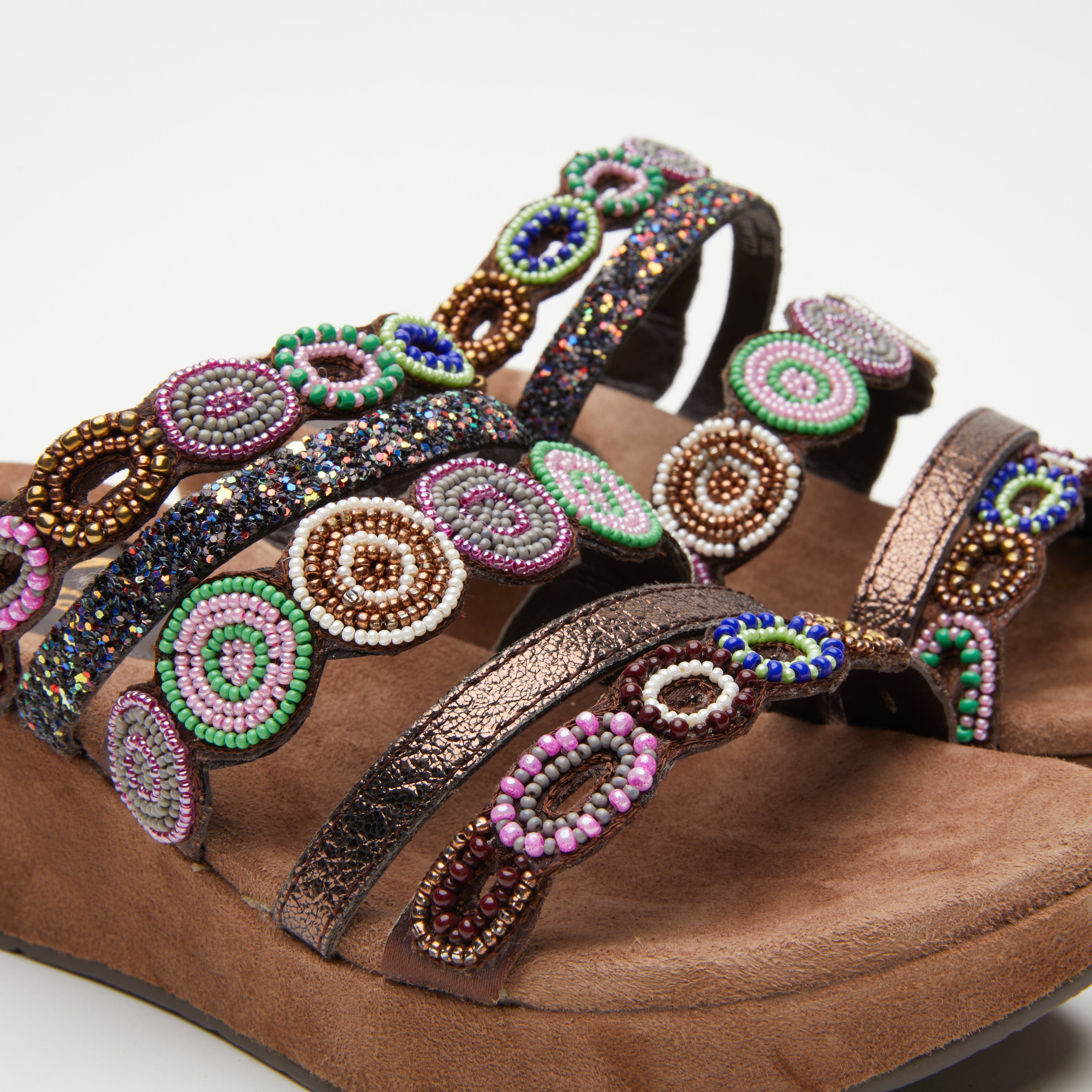 European inspired luxury platform slide sandal crafted with hand sewn beaded embellishments. The straps alternate with scalloped pattern beading, glitter and metallic straps. These intricate designs all come together on top of a comfort padded suede insole.