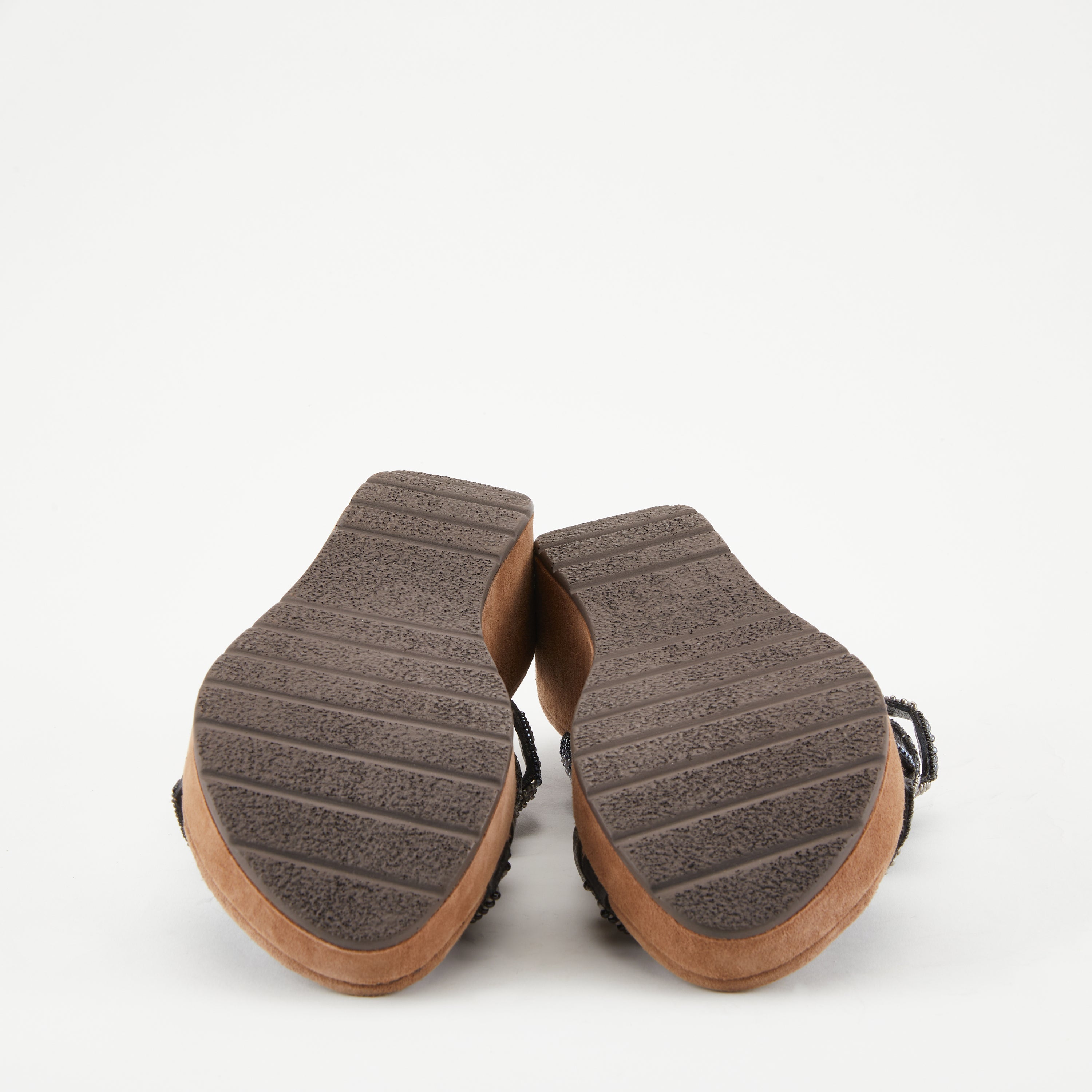 -High quality textile and synthetic leather upper, round toe silhouette, hand-sewn beadwork, and suede wrapped wedge.