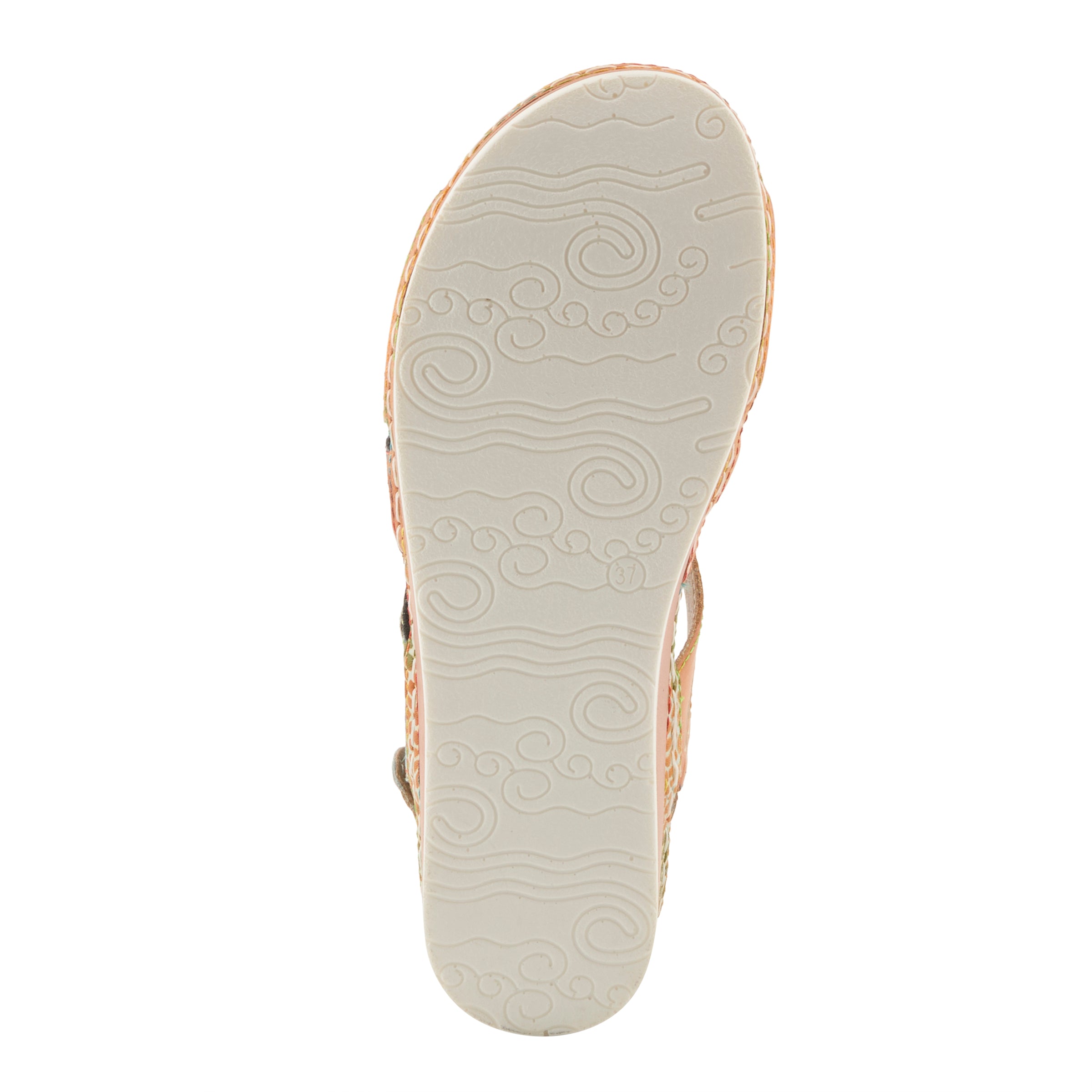 -Hand painted leather, contrast stitch detailing, antiqued gold hardware, floral embossed design, leather pieced wedge.