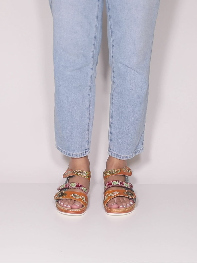 Hand painted, French inspired. This leather sandal features a unique color blocked floral pattern and a metal flower button with our signature rainbow stitching. Style meets comfort with the Hook and Loop Velcro straps at the top of the foot and buckle at the heel. You will be sure to get tons of compliments any time you walk out the door.