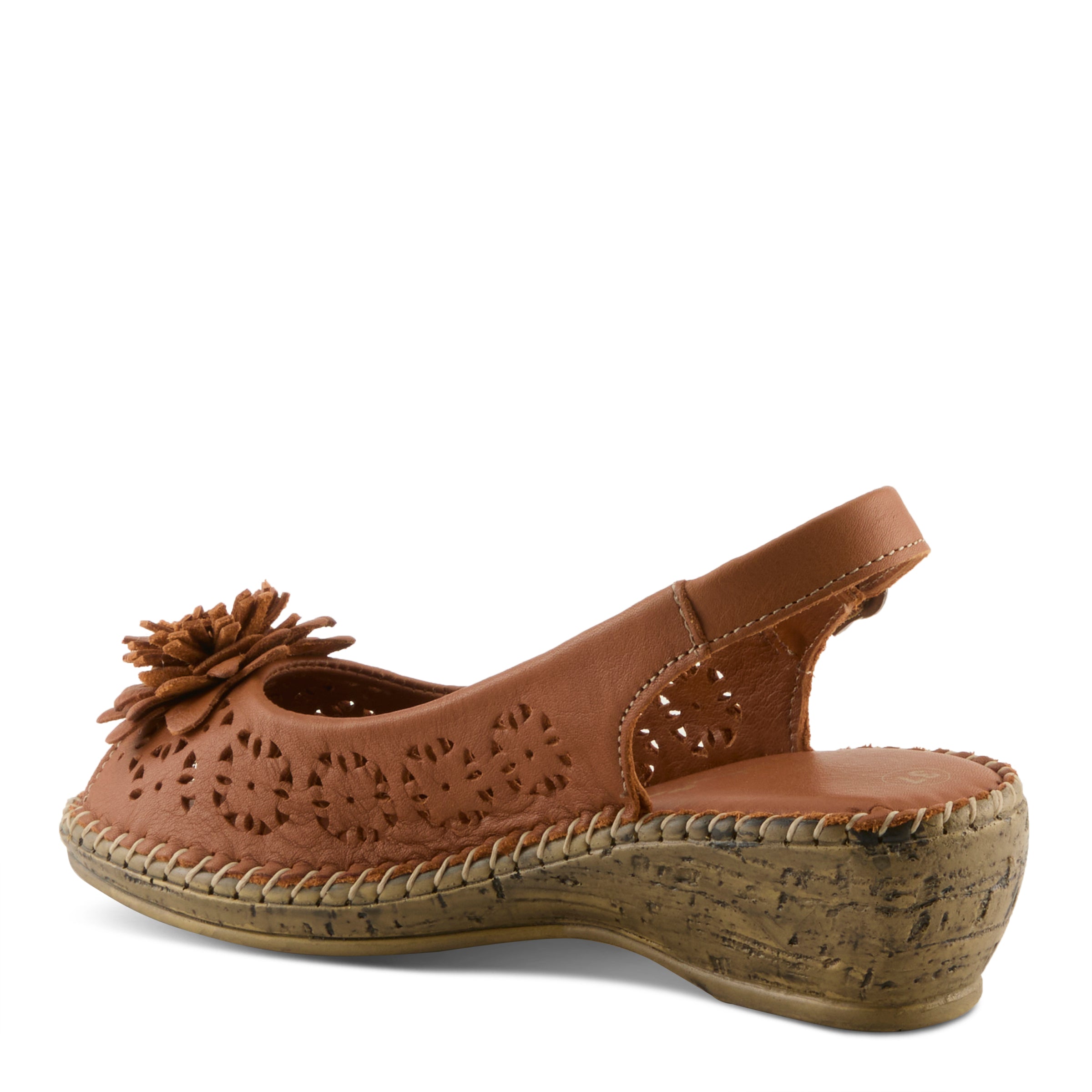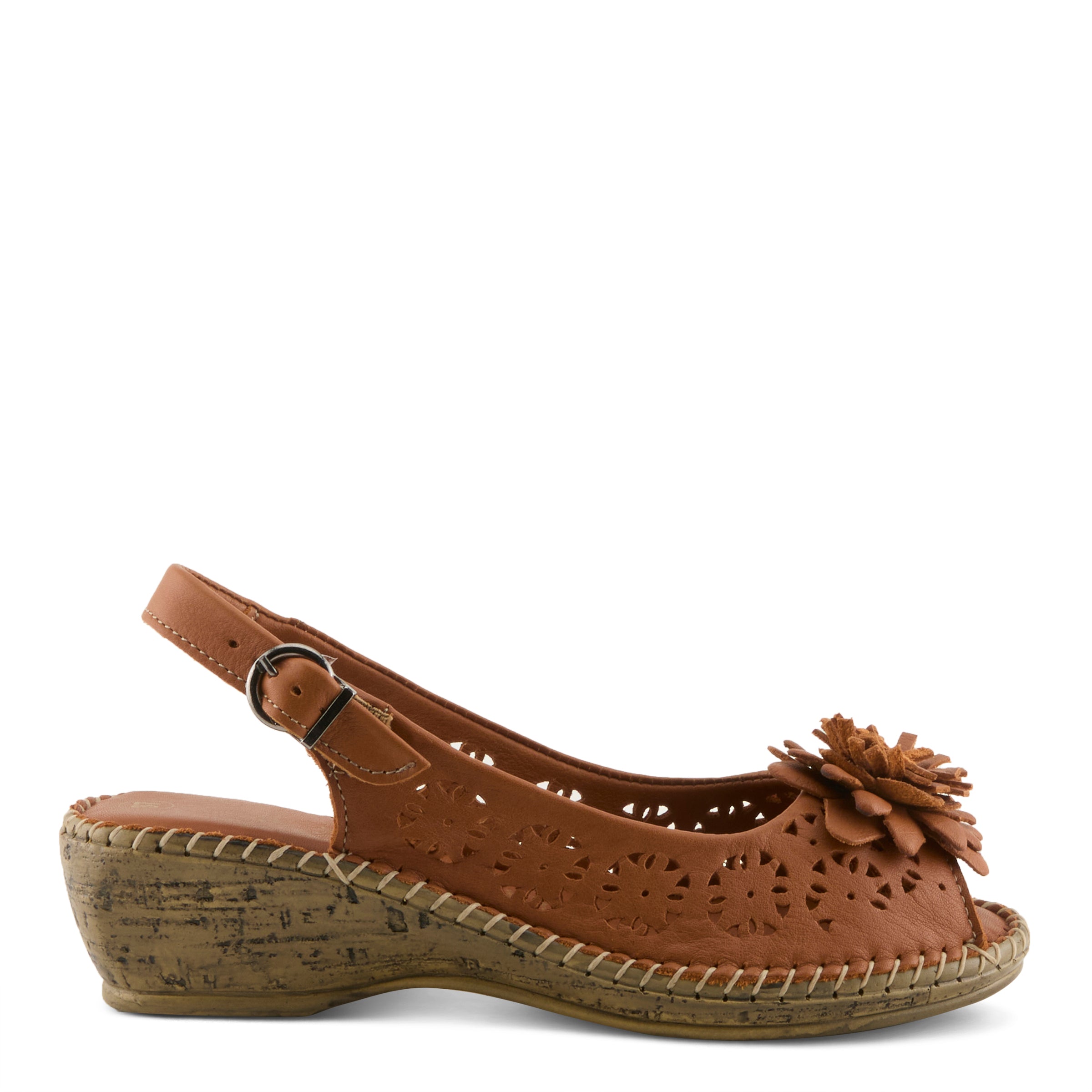 European inspired leather peep-toe wedge sandal featuring a tonal leather flower and perforated upper design.
